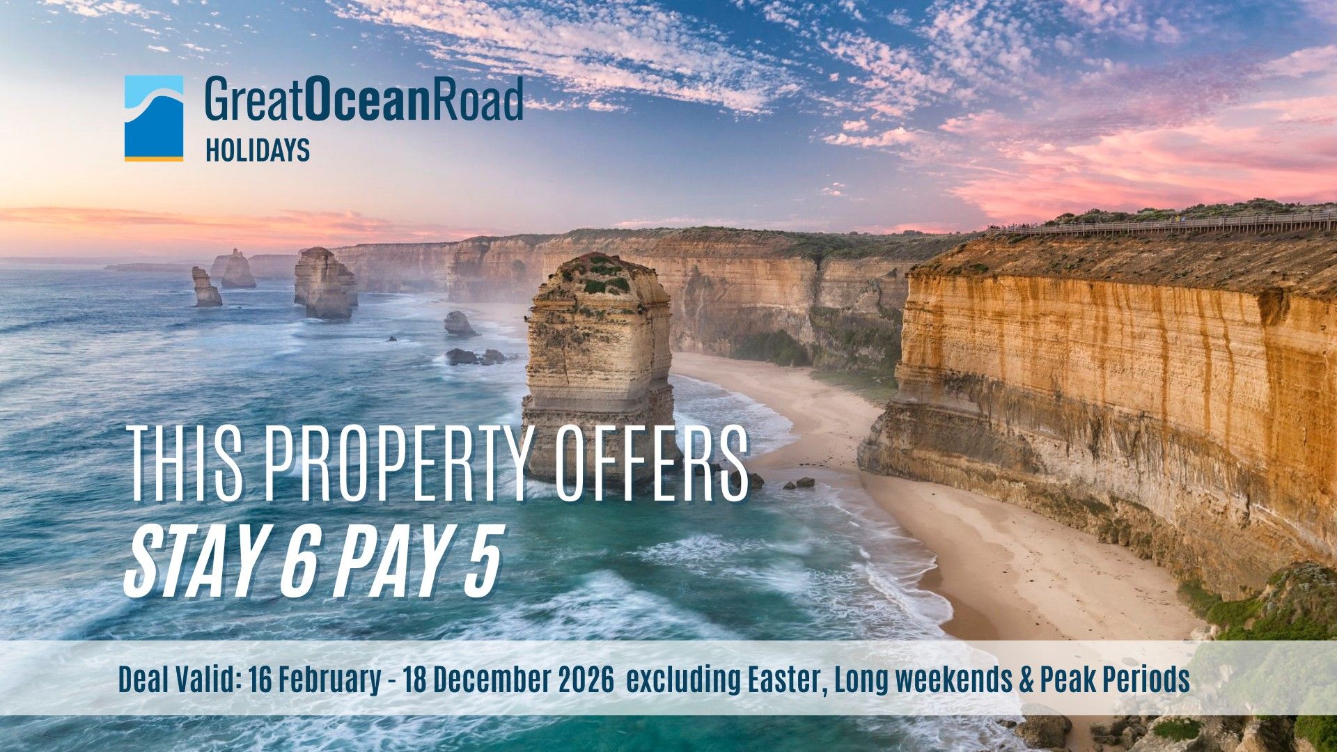 This property offers a STAY 6 PAY 5 deal valid from 16 Feb to 18 Dec 2026. Excludes Easter, School Holidays, and Peak Periods.