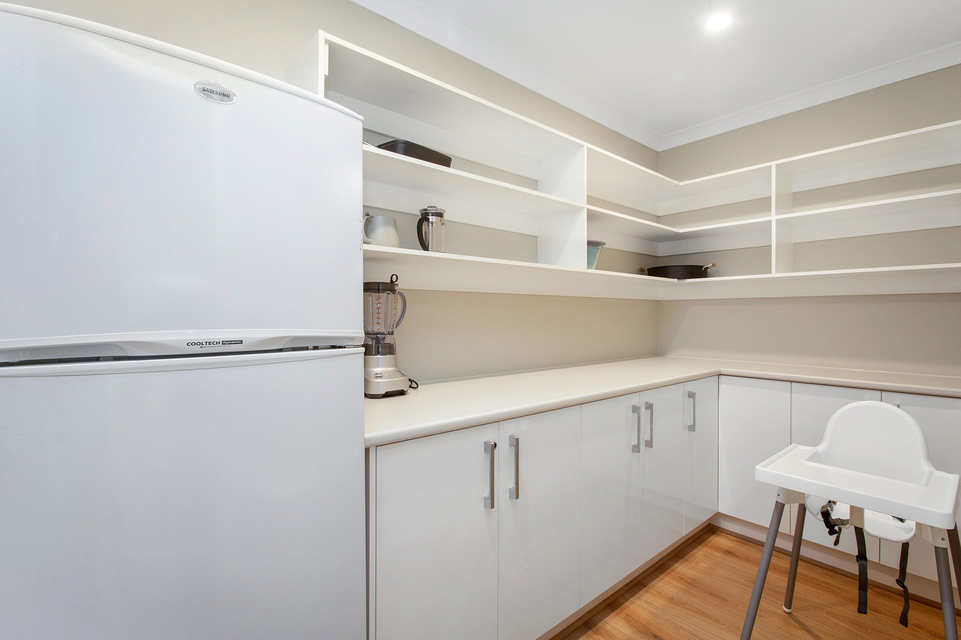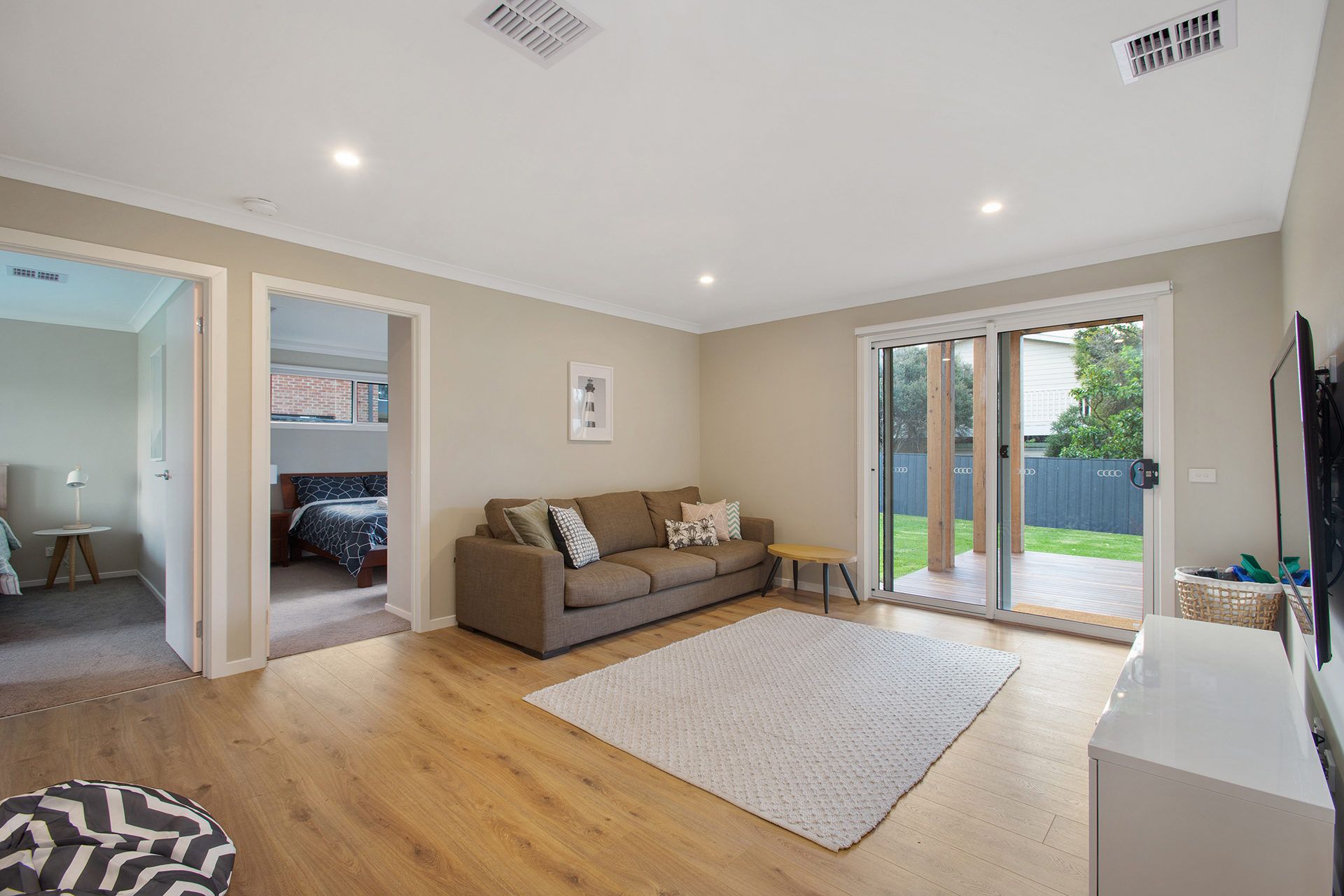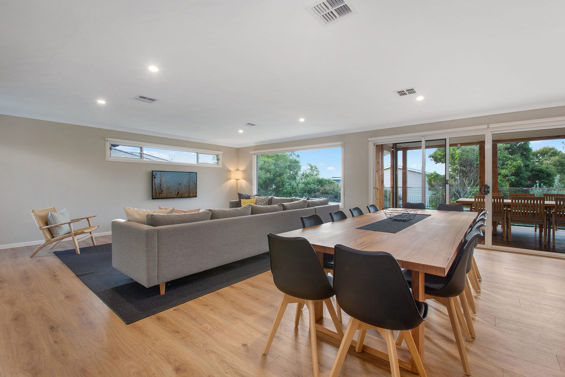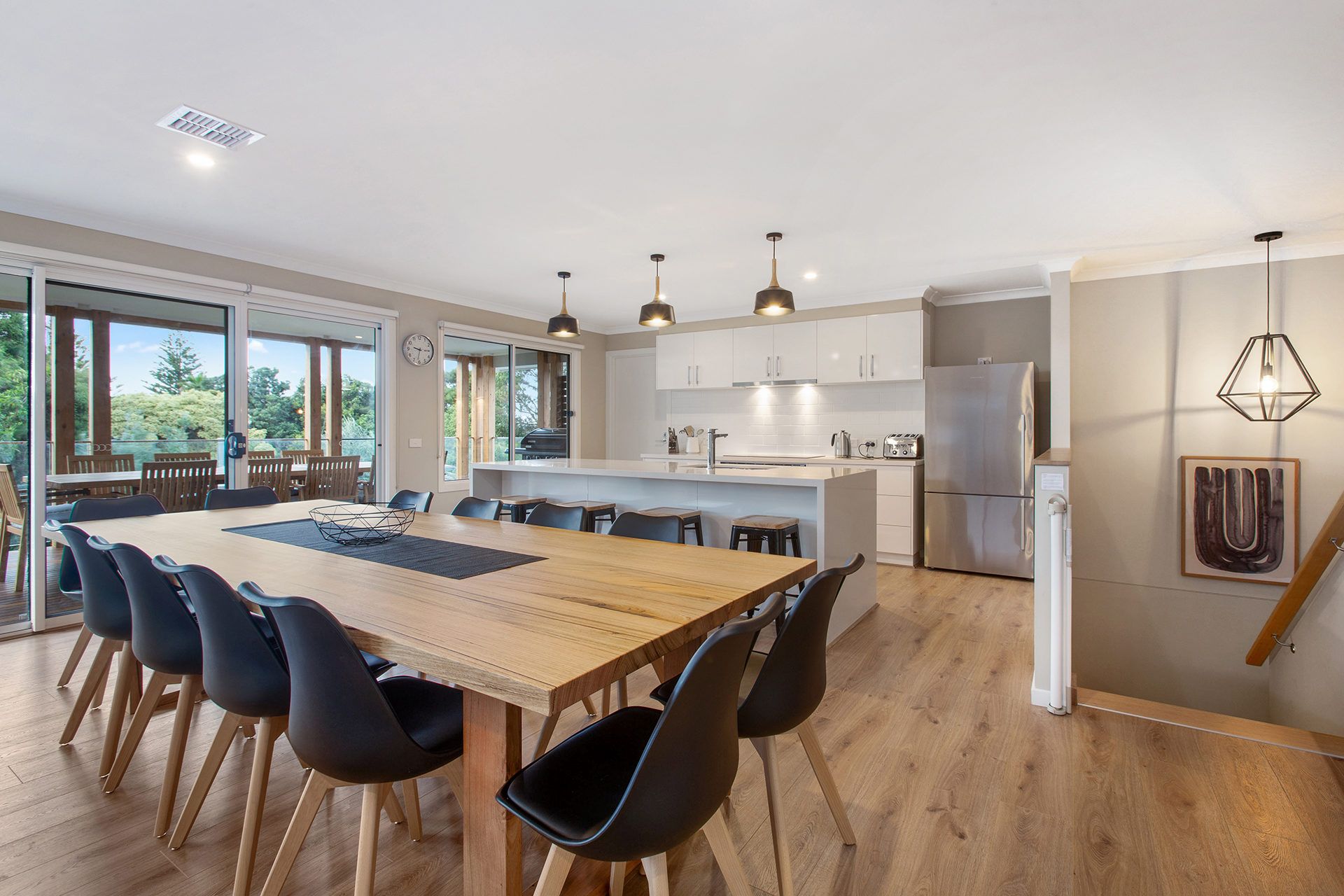 The first floor opens out onto a large open plan kitchen, living and dining area. The modern kitchen is equipped with everything you could need (large oven, induction cook top, walk in pantry and 2nd fridge) to make cooking on holidays a pleasure. Relax and enjoy your meals at the beautiful timber dining table (with seating for 12) or unwind in the living area with large LCD, DVD, wireless music player, 8 x seater couch, games, books & toys for the children.