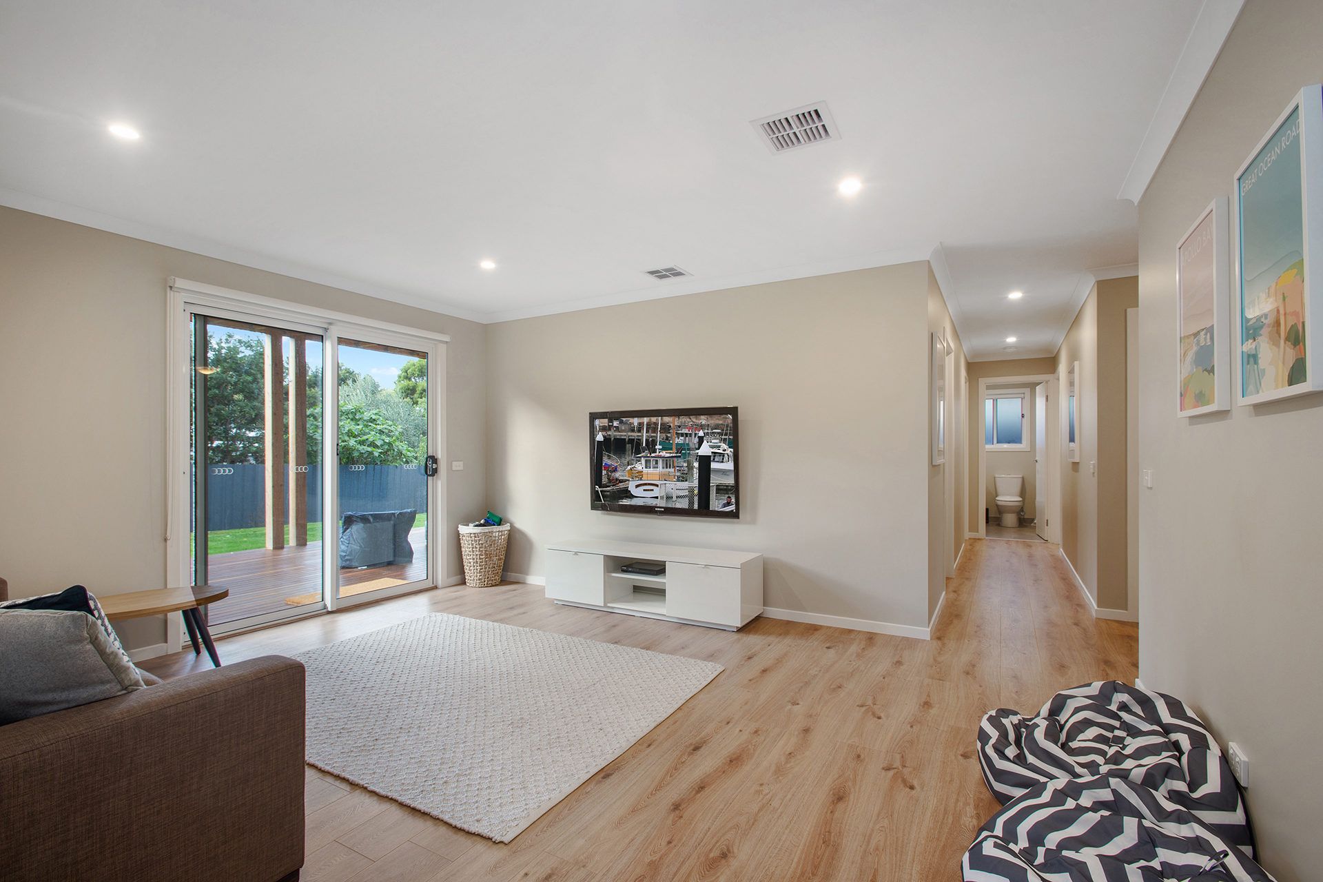 The ground floor features a separate living area (large LCD, DVD) which opens out onto another magnificent deck area and fully fenced back yard (with hot water, outdoor shower) with lots of room for a game of backyard cricket.