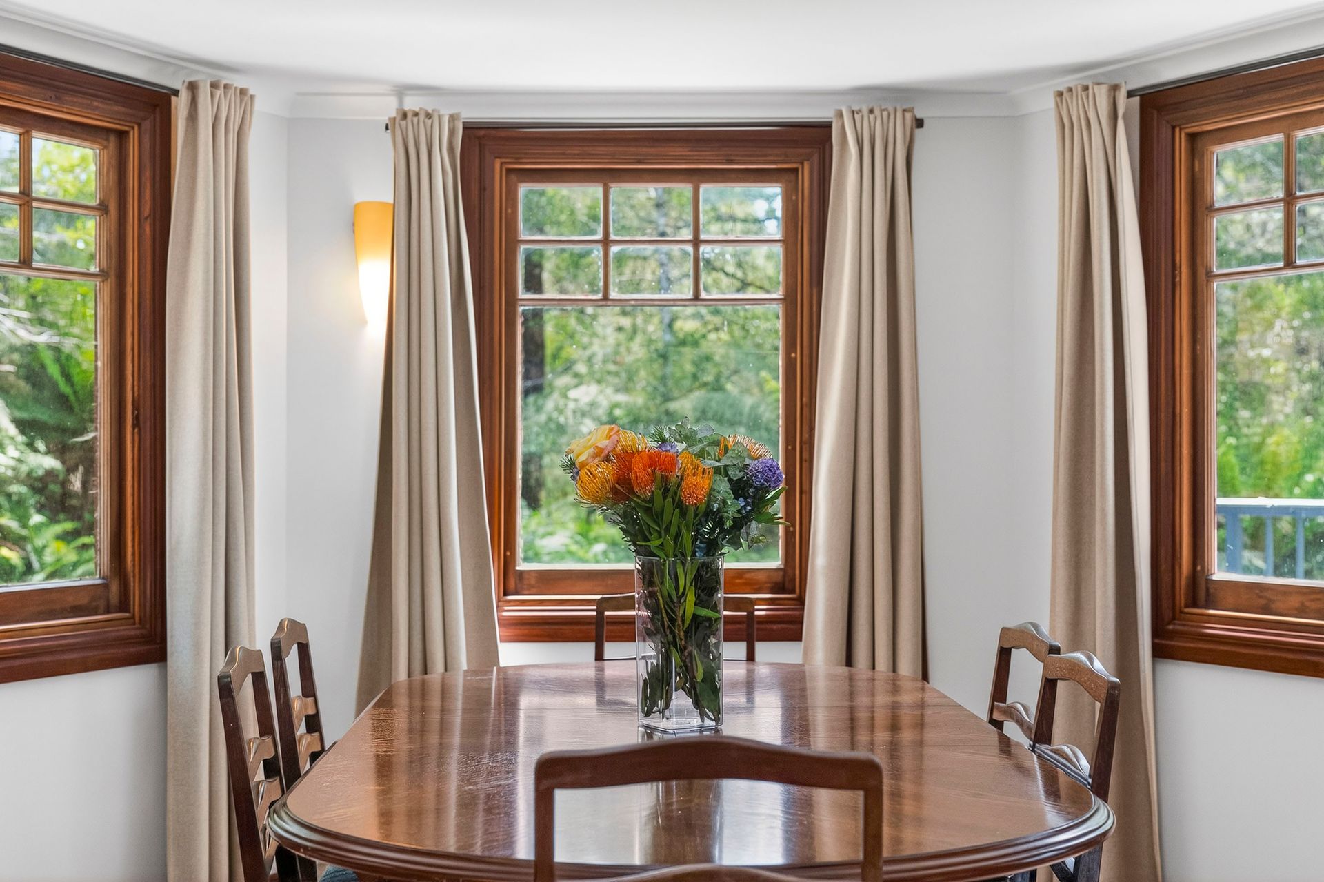 Outdoors, a spacious deck and balcony overlook panoramic mountain and bush views, creating the perfect setting for outdoor dining and relaxation. The property sits within expansive natural bushland with off-street parking for four vehicles. A BBQ connected to the house is available for guest use, and the separate self-contained studio adds flexibility for groups or families. Surrounded by wildlife and forest, the entire retreat delivers a peaceful, private ambience.