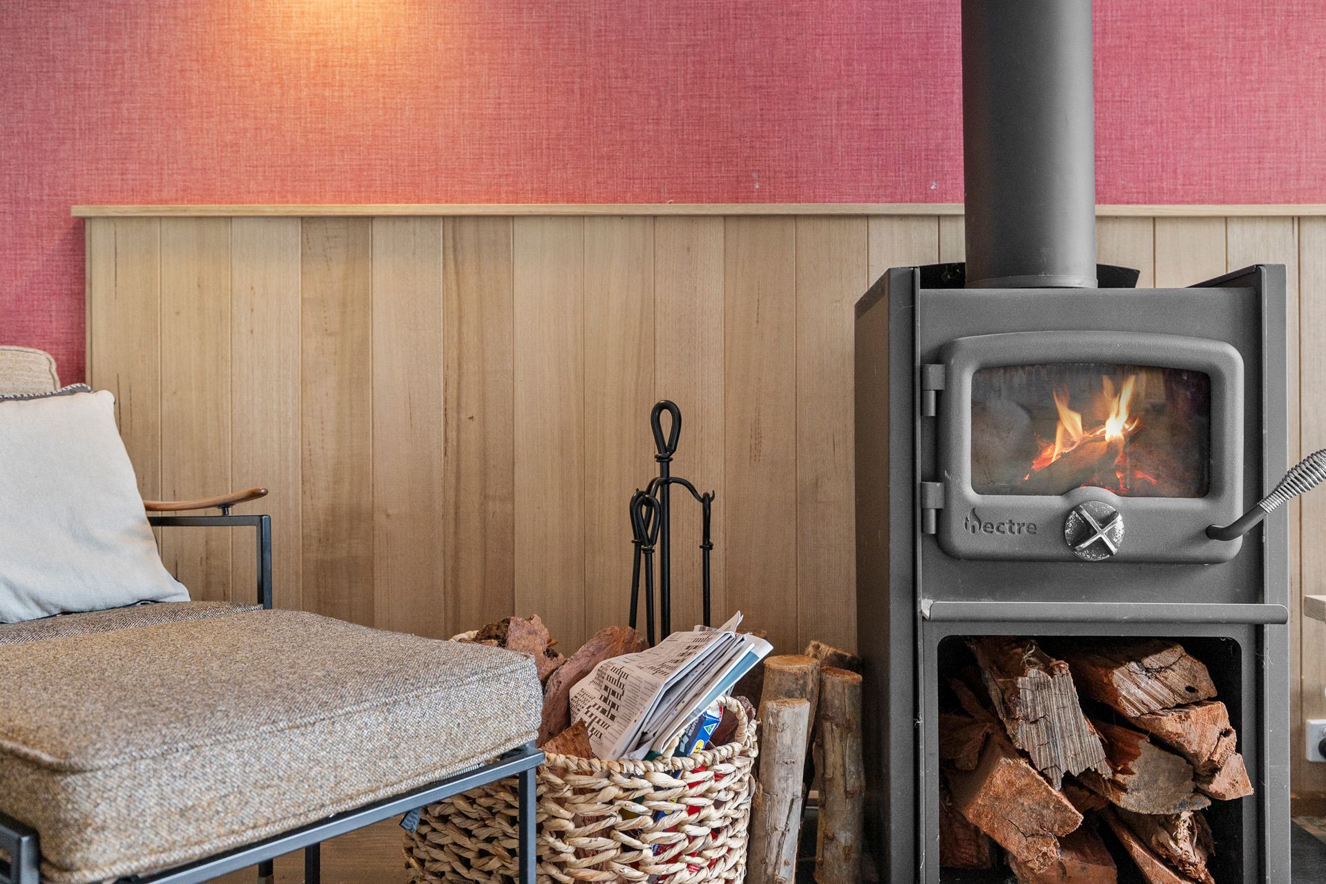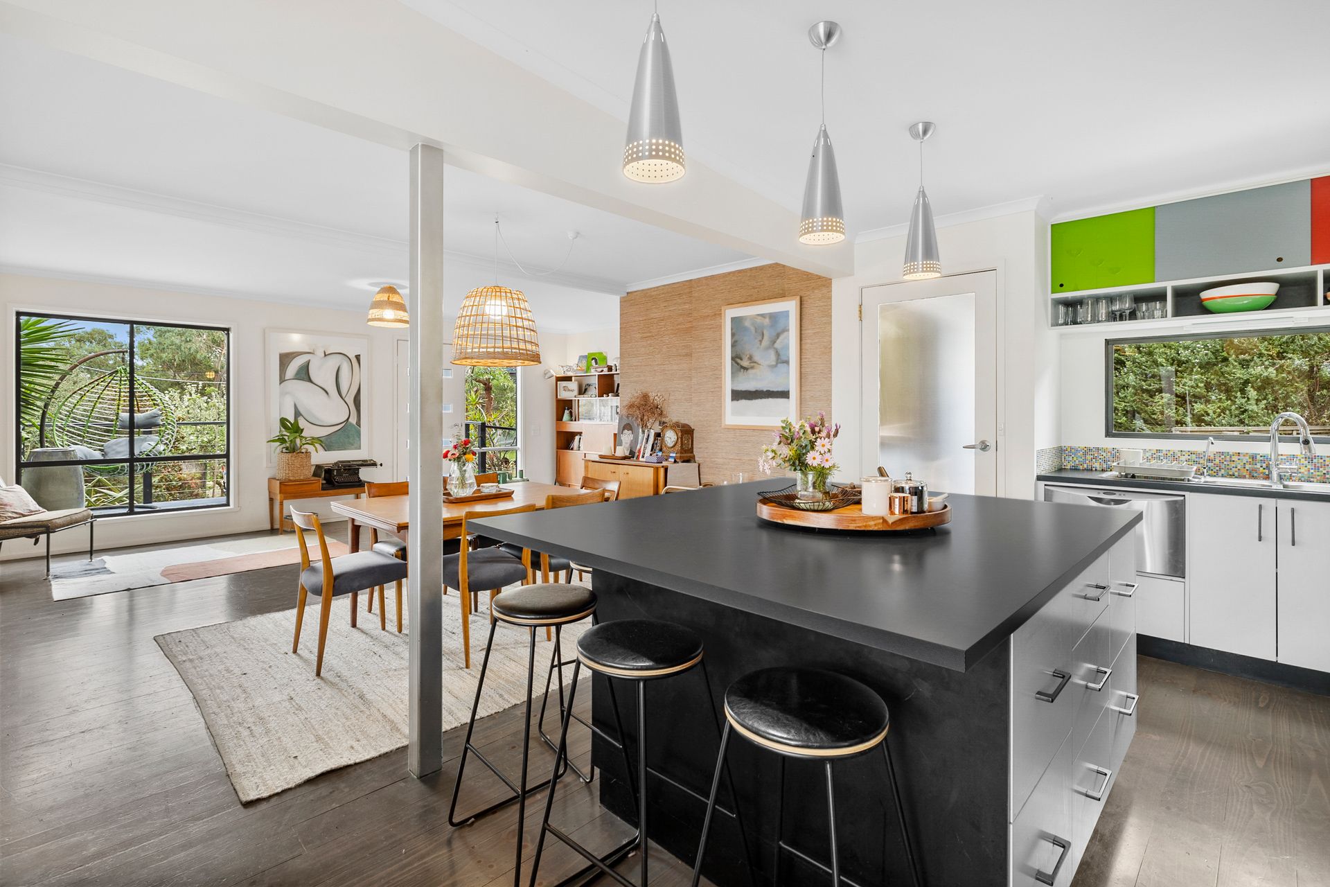 In the living room, the beauty of the outdoors seamlessly blends with the cozy interior. Large windows frame a serene view of lush greenery, creating a tranquil atmosphere. The kitchen and its surroundings radiate a sleek and modern ambiance, carefully designed to provide a cohesive and stylish living space. The adjacent dining area and living room together form an open and inviting environment with ample natural light and views of the bush, offering a comfortable and pleasant retreat.