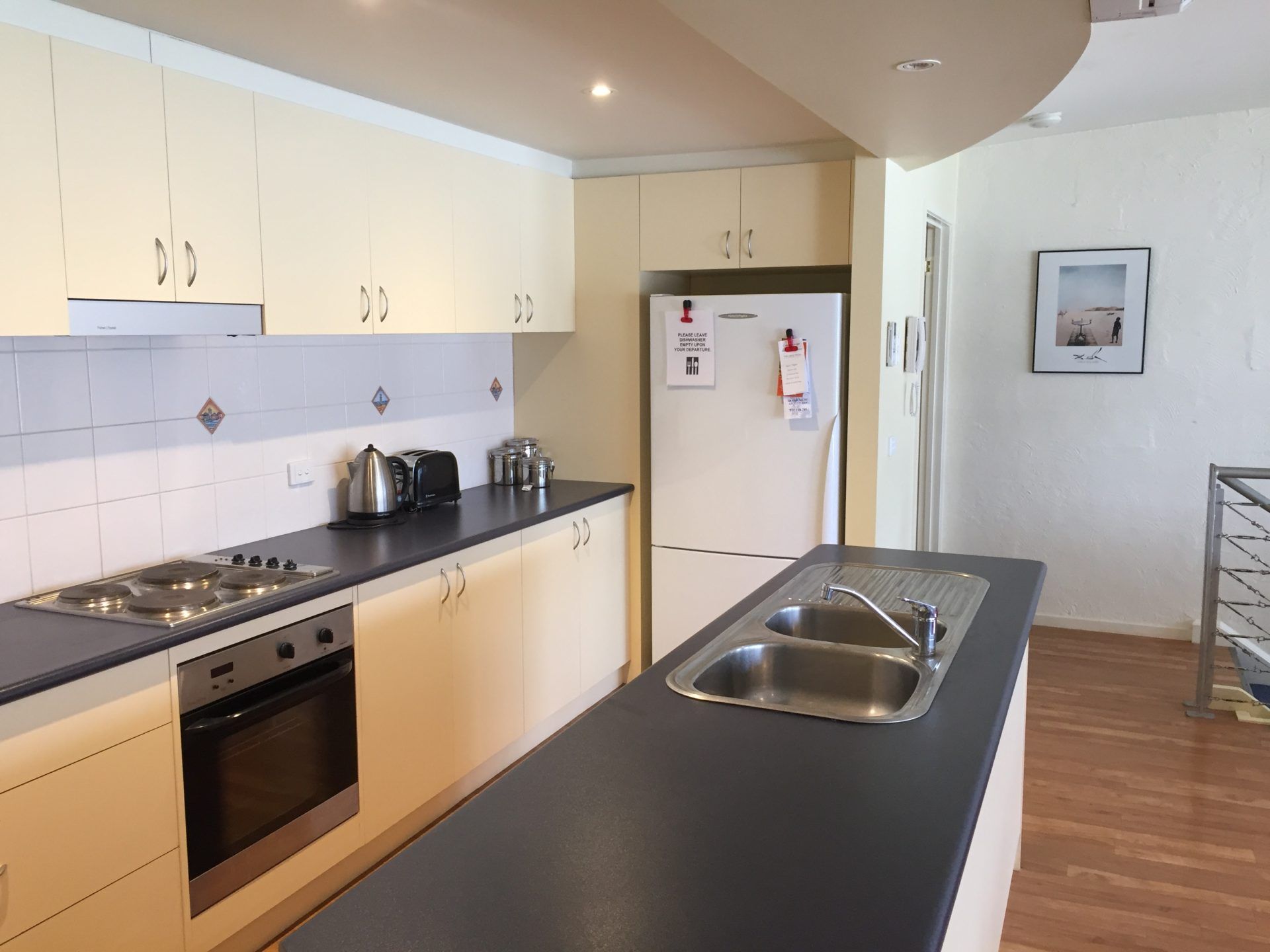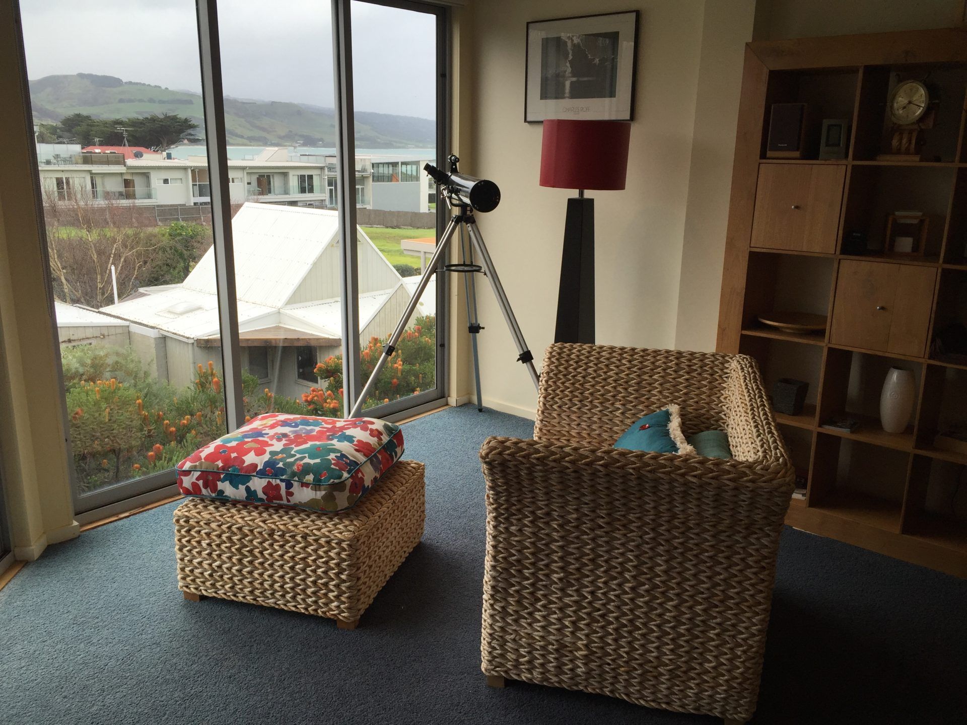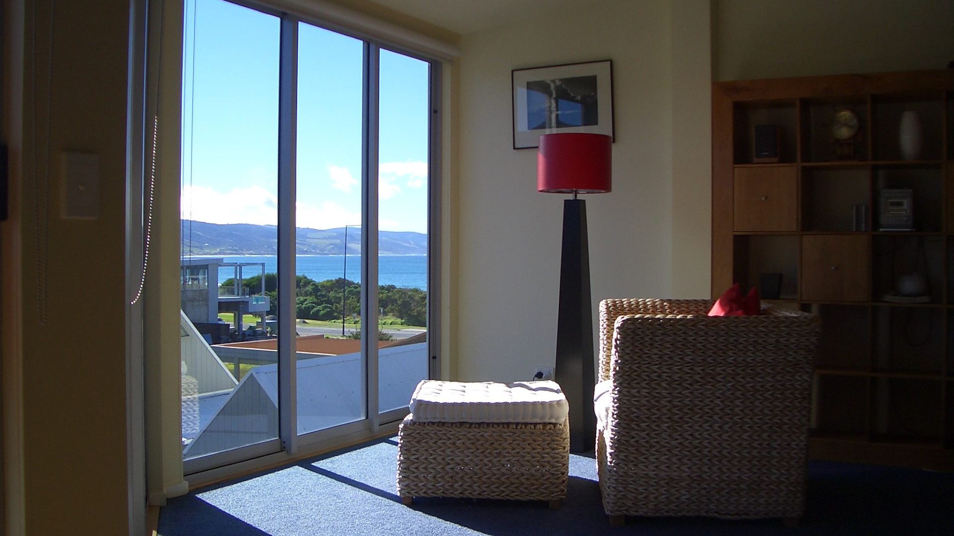 Upstairs, the apartment features a spacious open-plan kitchen, dining, and living area designed for comfort and connection. The well-equipped kitchen includes a dishwasher, coffee machine, wok, and microwave, making meal prep a breeze. The generous dining table seats up to eight, perfect for shared meals and entertaining. In the living area, you'll find two comfortable 3-seater couches, a TV, DVD and CD player, and reverse-cycle air conditioning for year-round comfort. Step out onto the balcony to soak up beautiful ocean and hillside views, complete with outdoor furniture and a gas BBQ—ideal for relaxing or dining al fresco
