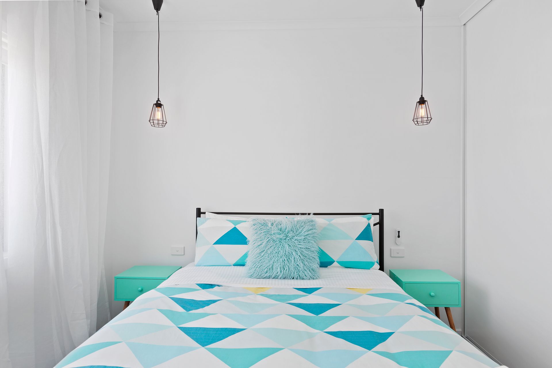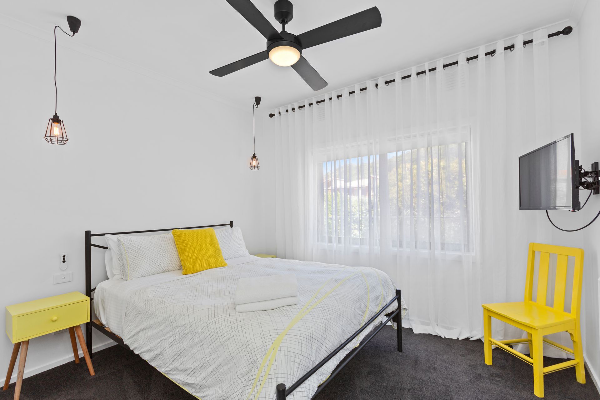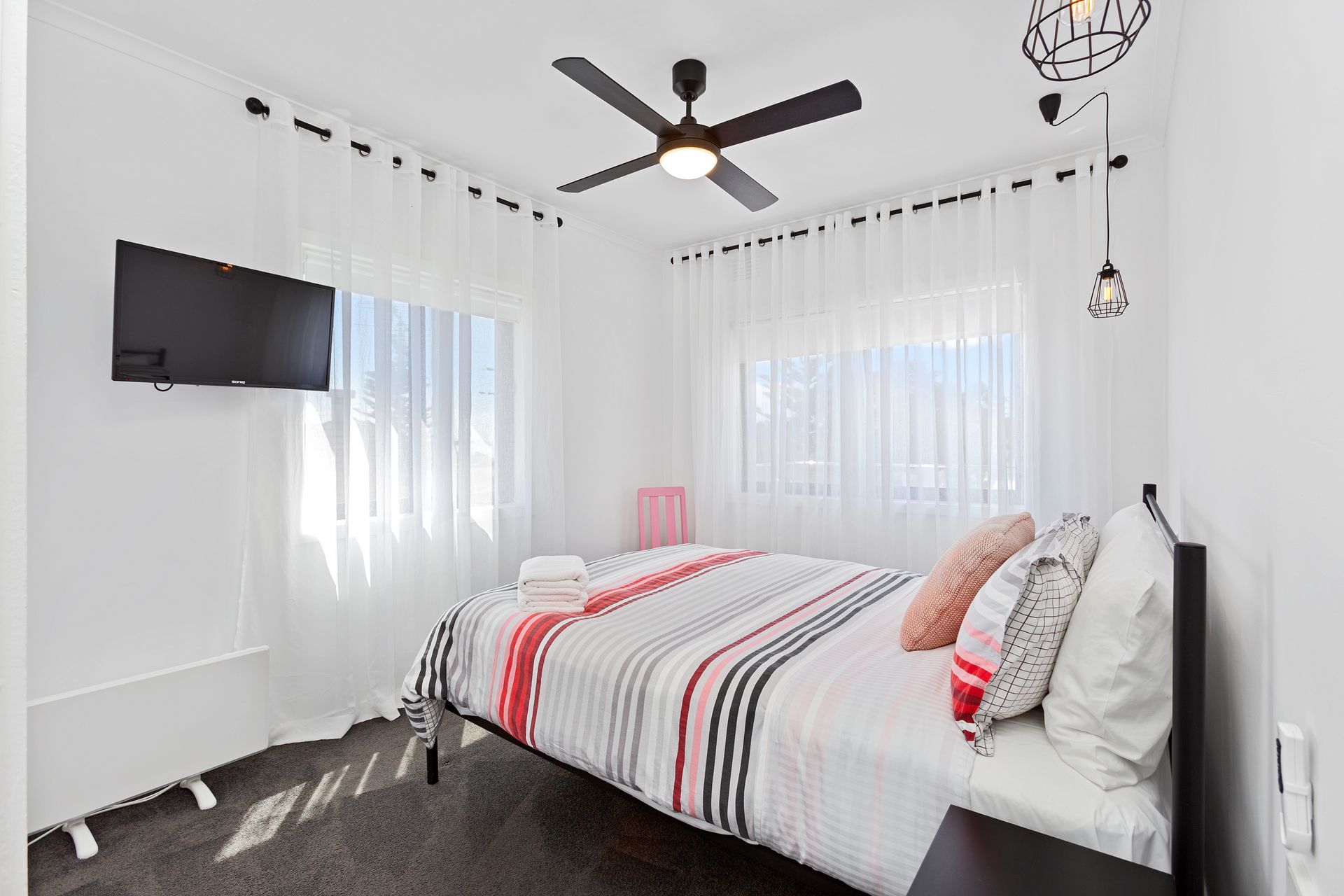 Bedroom 3: Queen bed, portable Nobo panel heater with Otway views from window and a wall mounted LCD TV with built-in DVD player