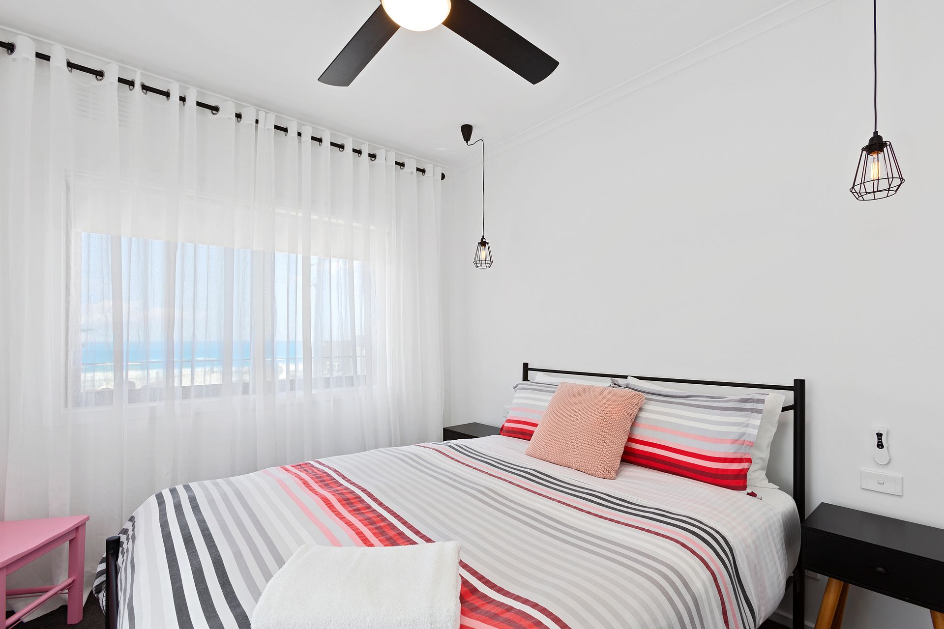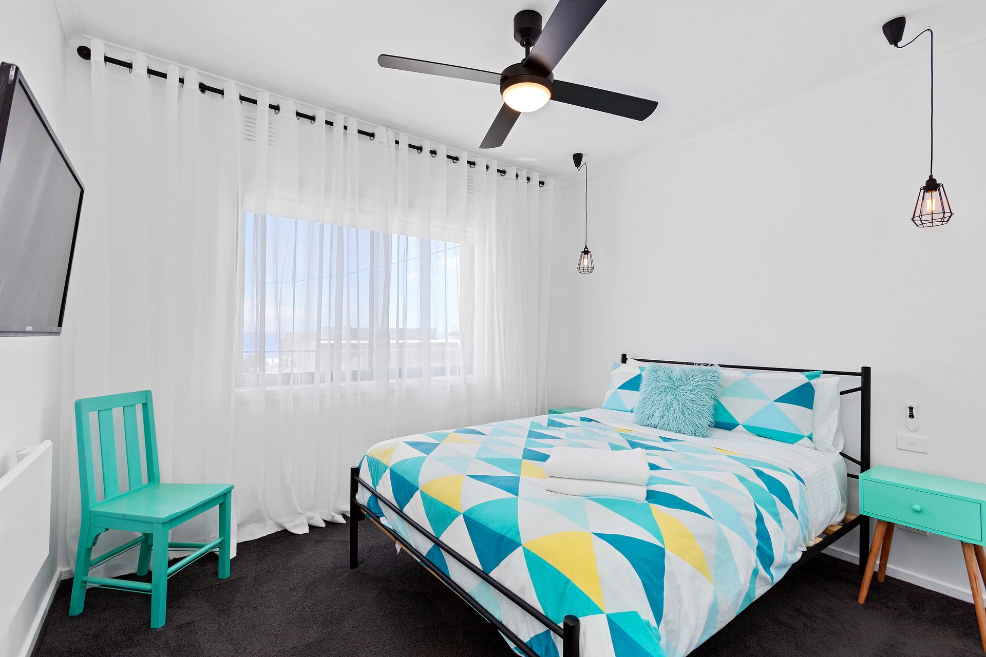 Bedroom 2: Queen bed, portable Nobo panel heater with water views including the Apollo Bay Harbour and a wall mounted LCD TV with built-in DVD player