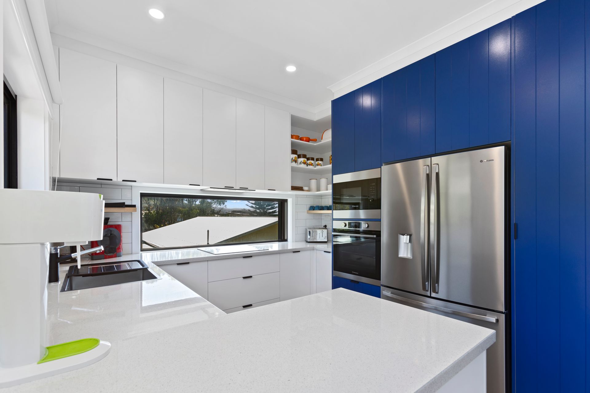 Whether you're a master chef, budding baker, or love socialising in the heart of the house, you'll love this newly renovated modern and contemporary kitchen. Stylish units, clean and crisp lines, superb storage solutions, and built-in appliances make it a comfortable and cool place to hang out. A simple white colour scheme creates a fresh and calming feeling, while a splash of vibrant blue from the back units adds depth. Two large windows with views of the garden below allow plenty of natural light to bounce off the sleek chrome microwave, oven, and double fridge/freezer. With an open-plan area and dining for eight peoples, it truly is a fantastic place to entertain or get culinary creative.