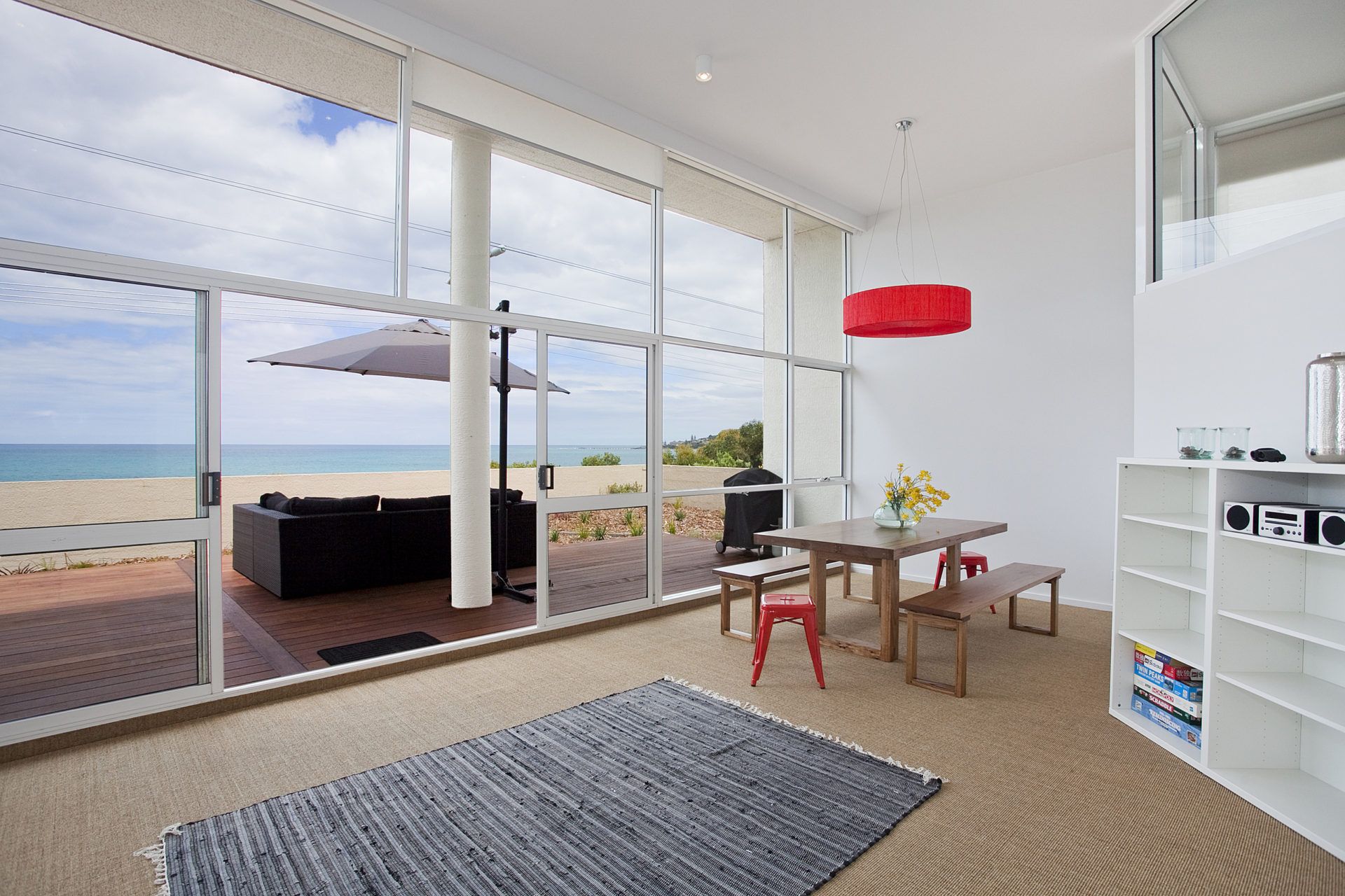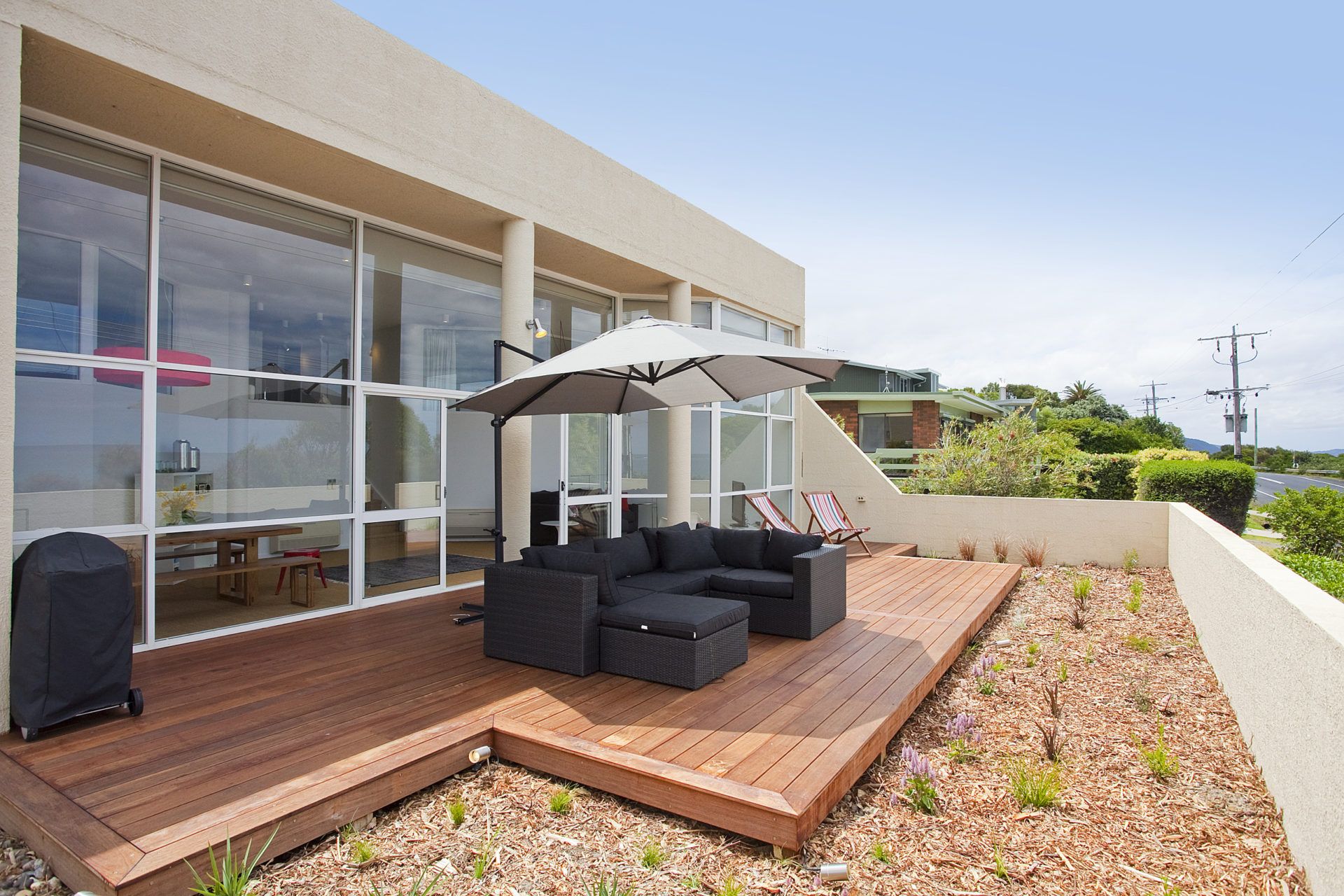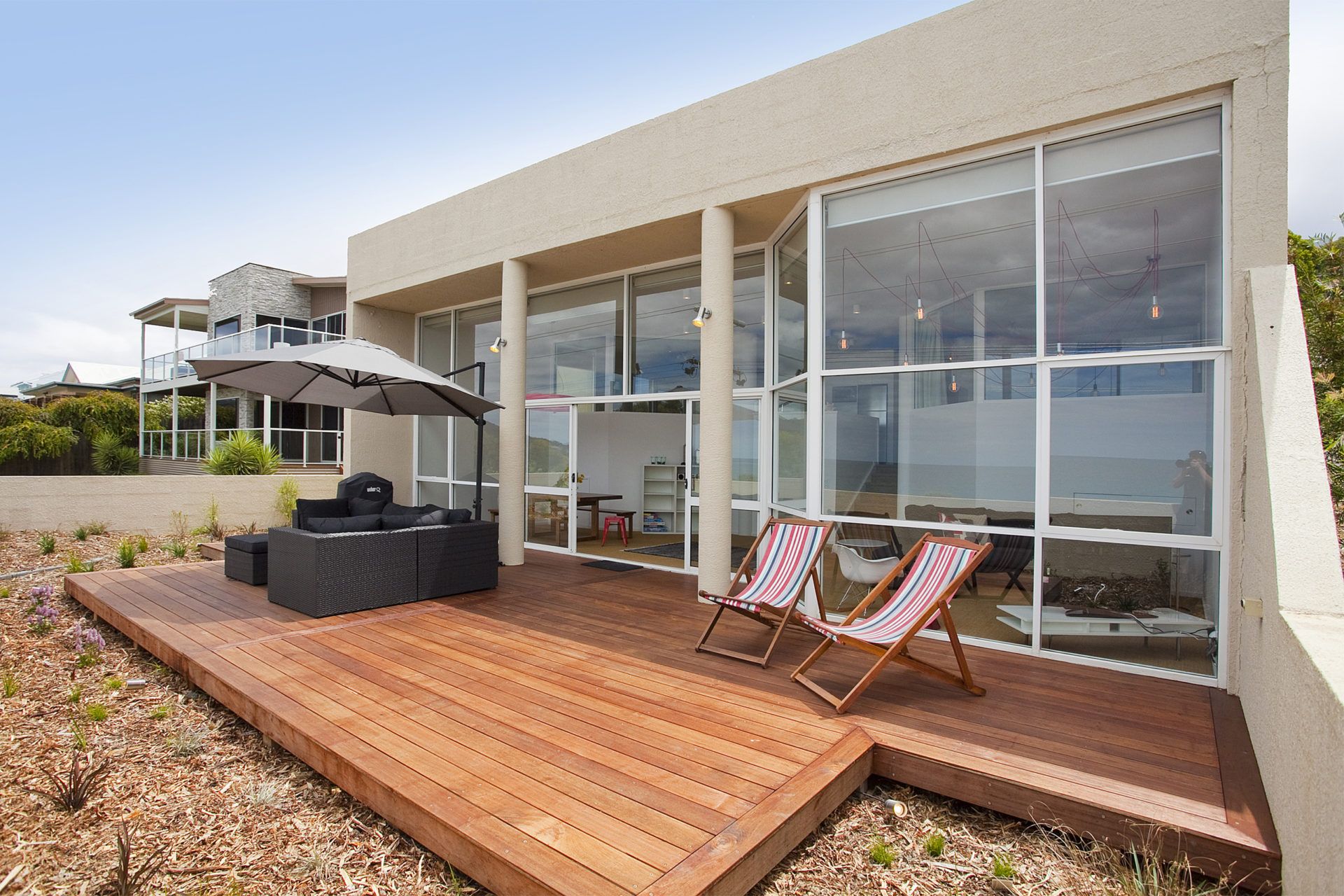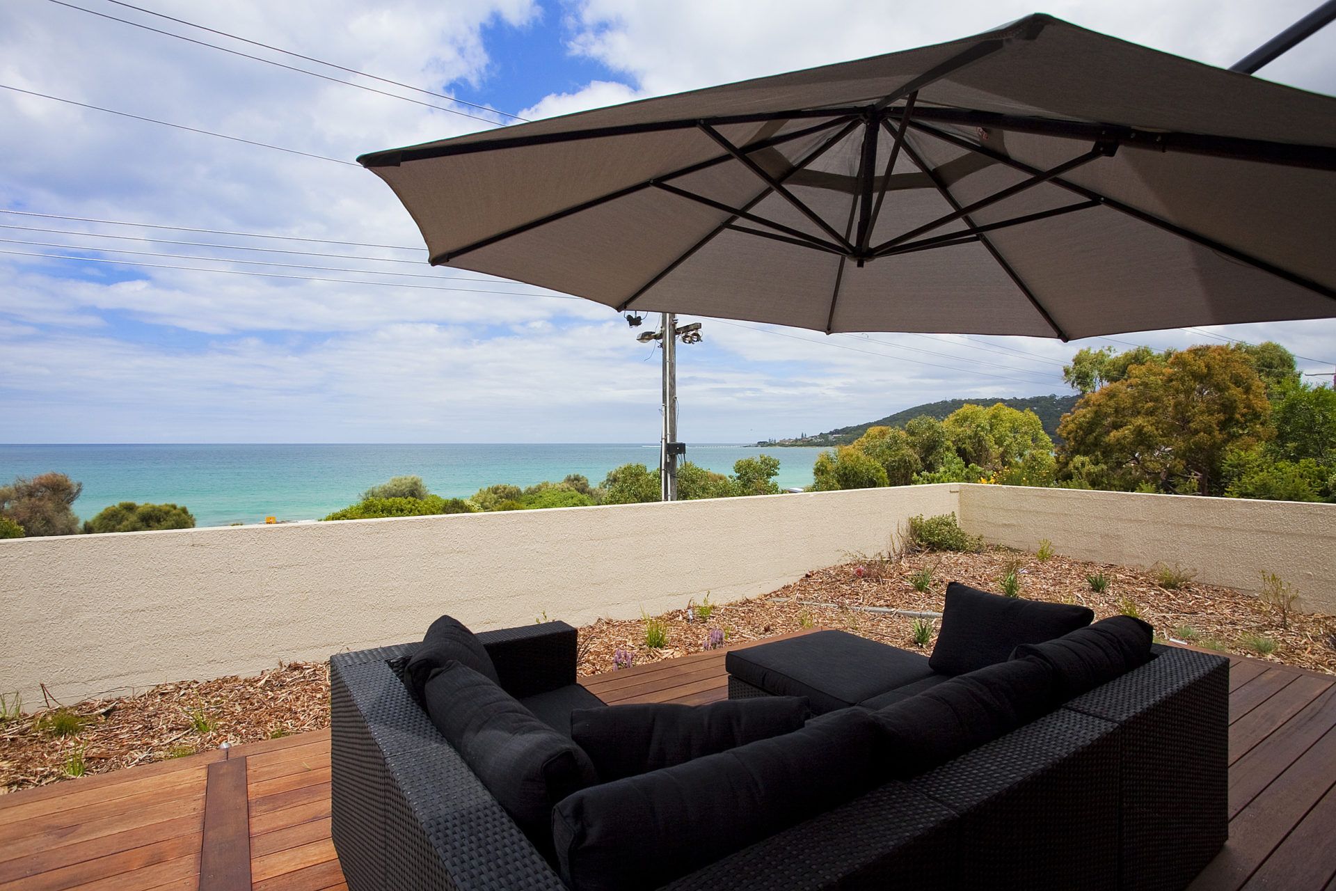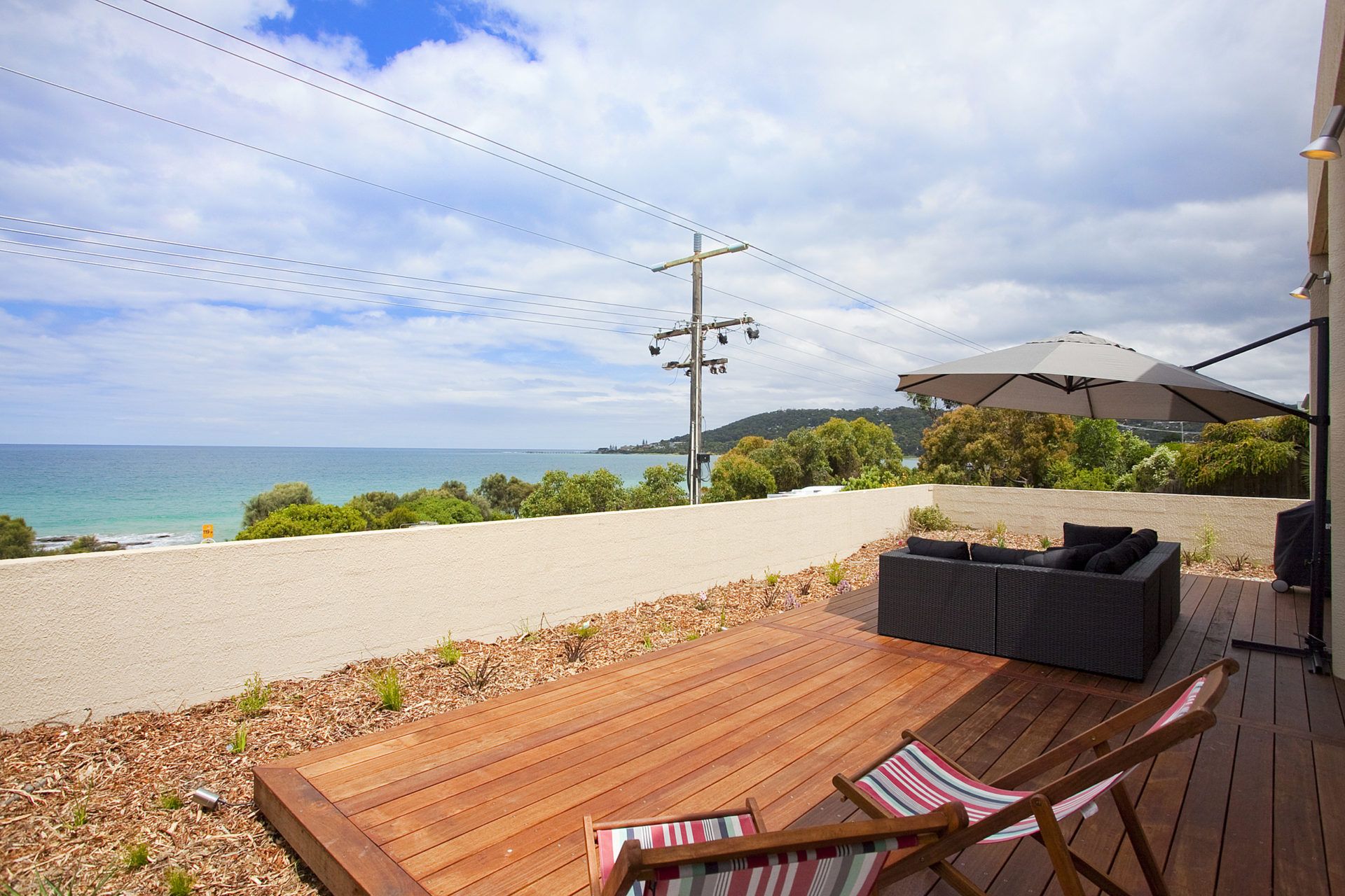 Split over two levels, the top level features two master bedrooms, one fully en suited, both flanking the modern kitchen and all overlooking the open plan living and dining area. Floor to ceiling windows span the front of the apartment, providing generous natural light inside and creating a gateway to the property's most stunning feature, the outdoor deck and surrounding landscaped gardens. Basking in morning sun, or afternoon shade, guests are treated to breathless unobstructed views across Loutit Bay, the pier and beyond.