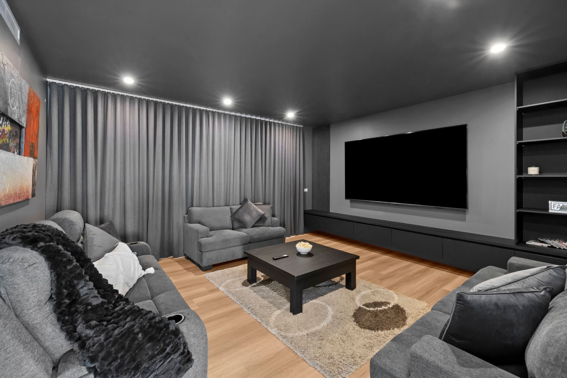 A chef’s kitchen, complete with high-end appliances, stone benchtops, and ample preparation space, makes entertaining a pleasure. Enjoy alfresco dining on the large outdoor deck, or unwind with a glass of wine as the sun sets behind the trees.