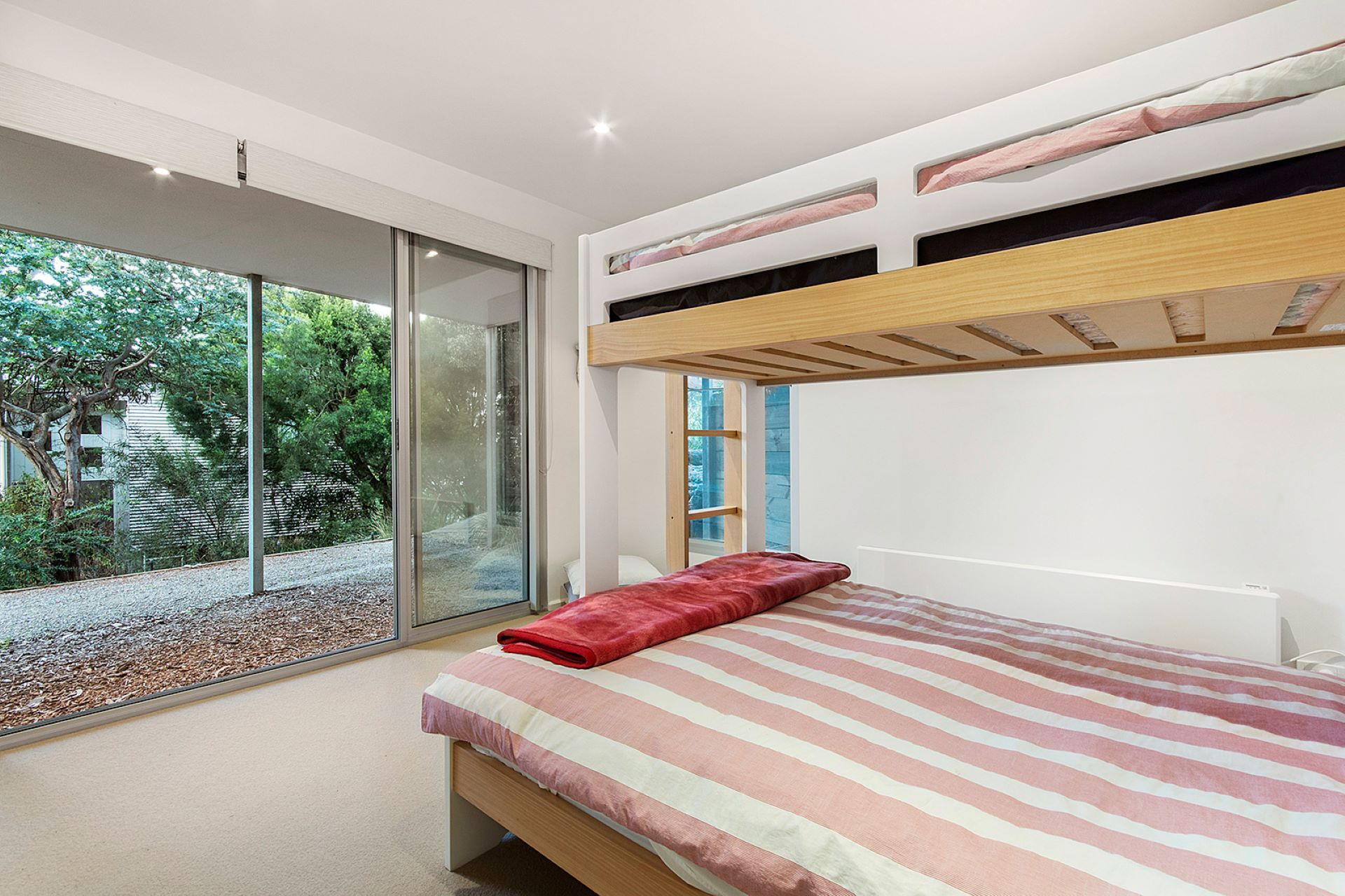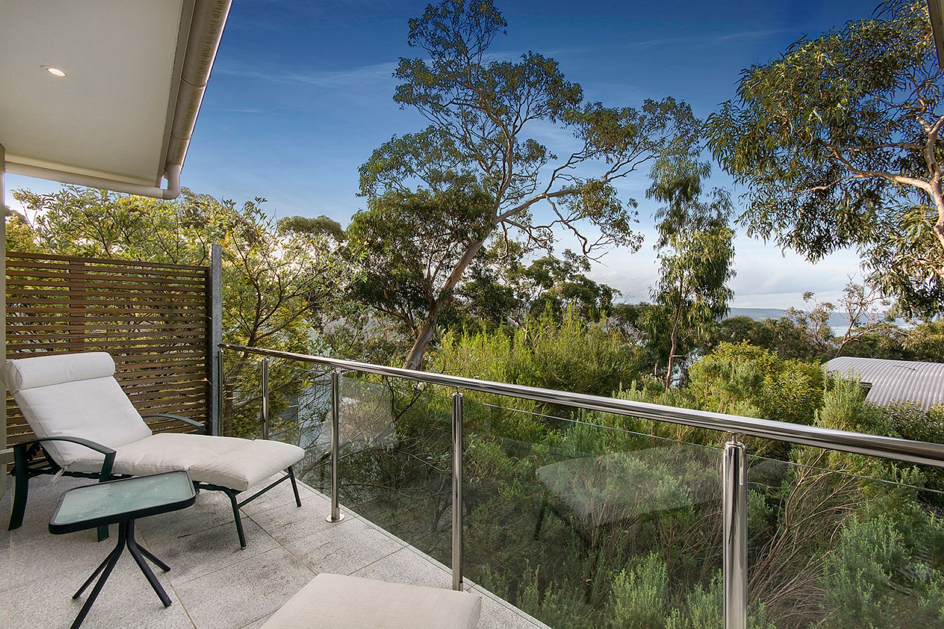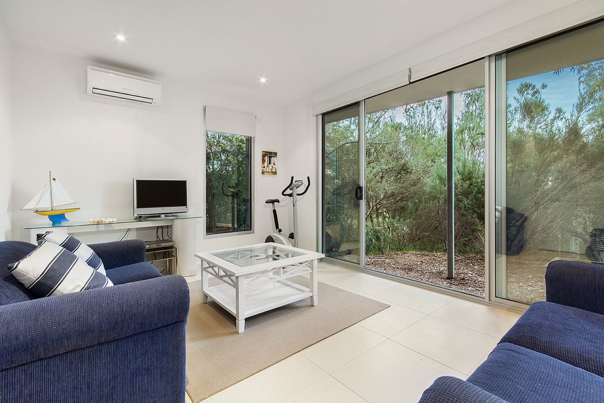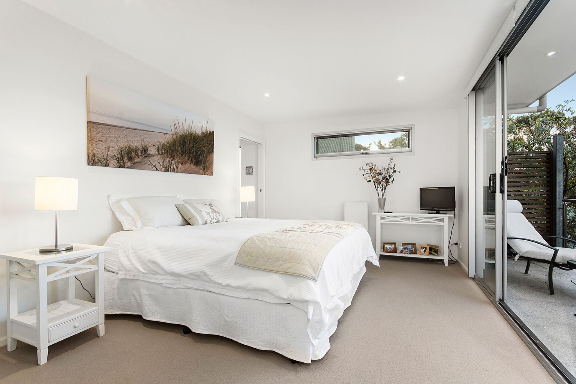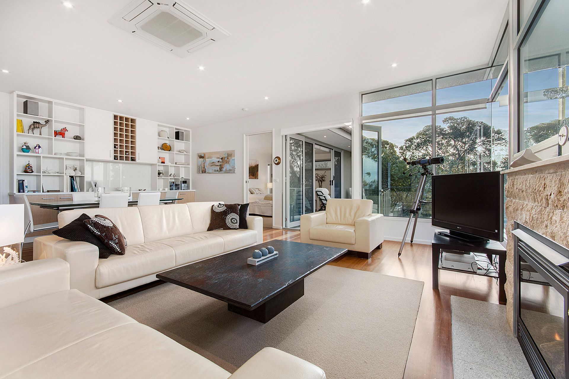 On entry, polished wood floors against Caesarstone and white leather combine to create an elegant, inviting open-plan living space. Gas log fire and sandstone hearth are flanked by two spacious tiled deck areas, all taking in stunning views across Louttit Bay and onto Airey's Inlet Lighthouse.