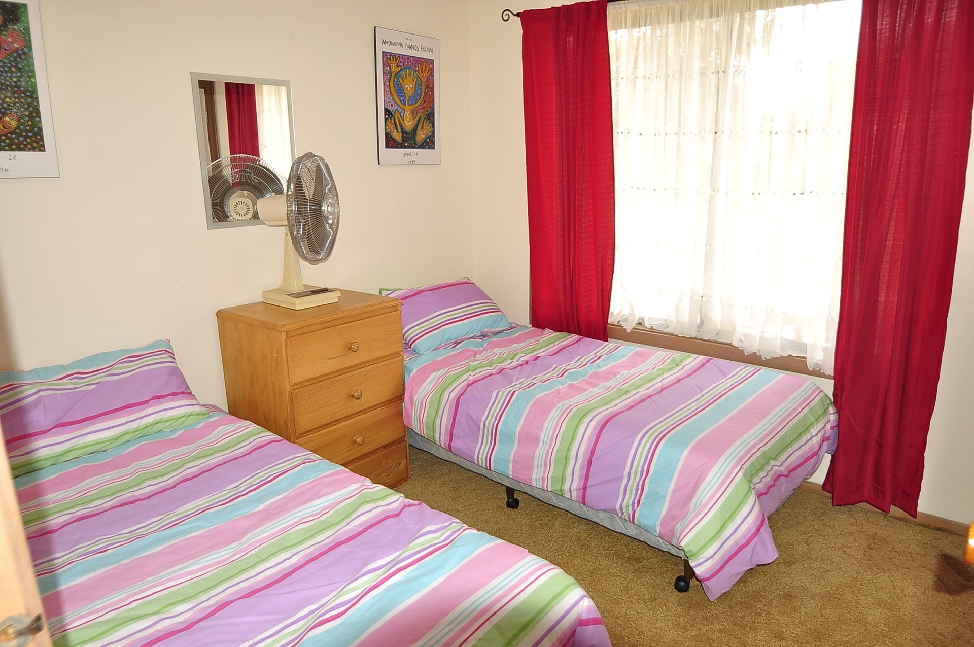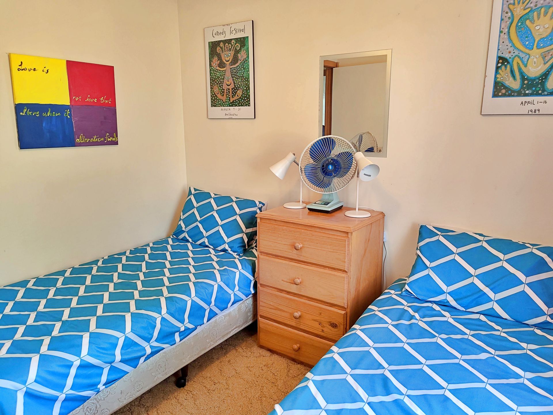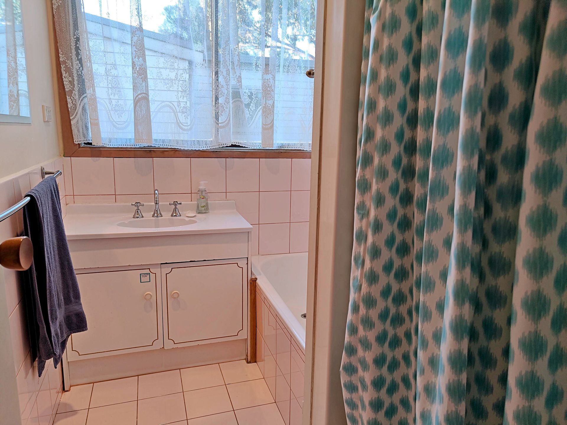 The perfect house for a small family with a queen bed in the main bedroom and 2 single beds in the second bedroom. The bathroom has a bath, vanity, shower and a separate toilet.