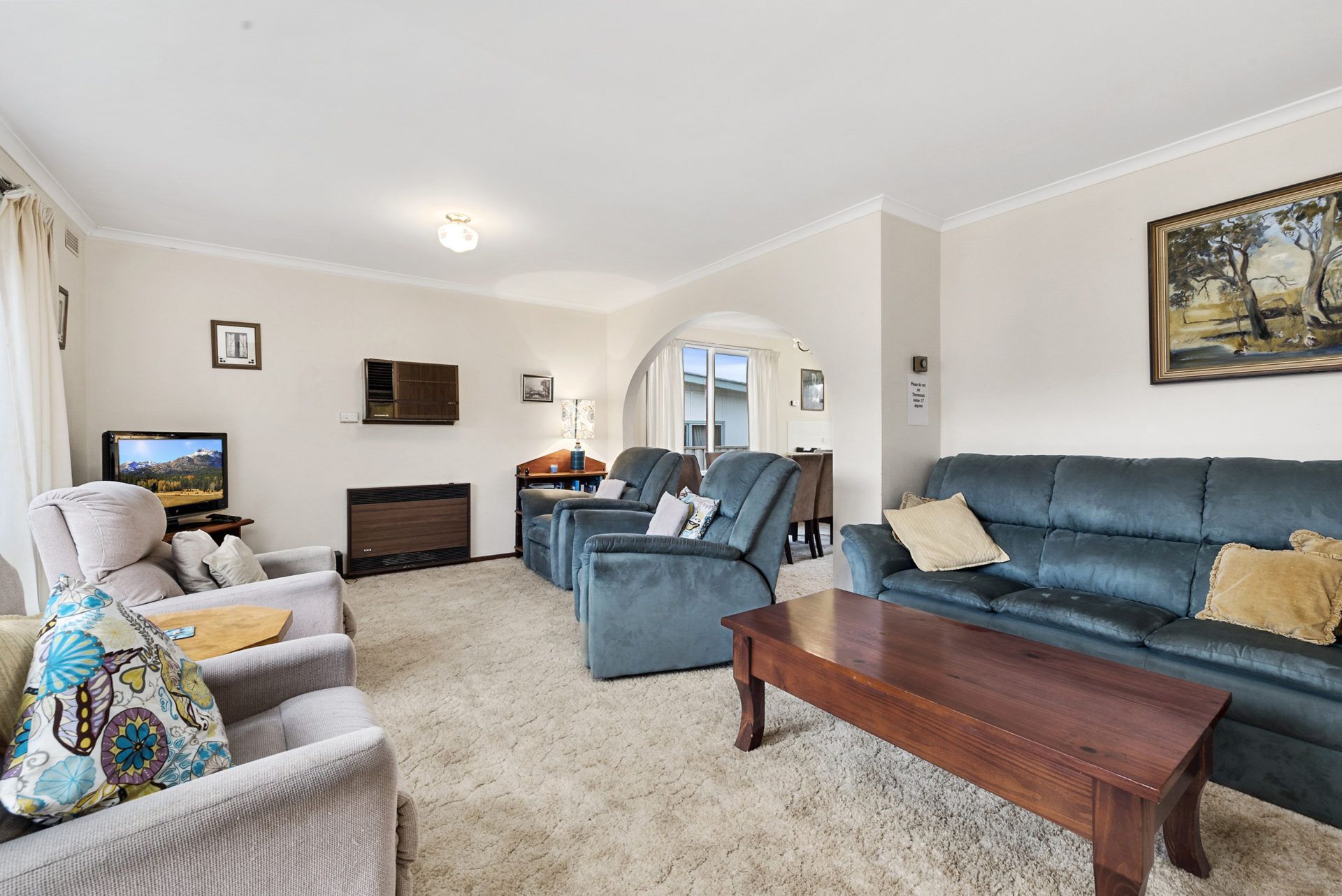 Living area with TV, electric heating, rev cycle air con and lounge furniture