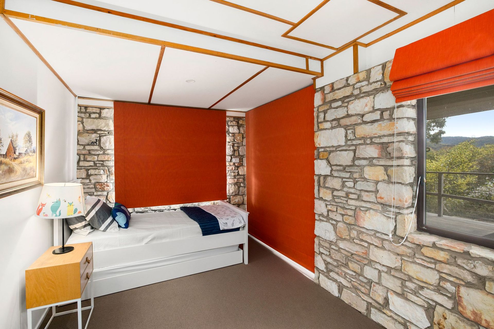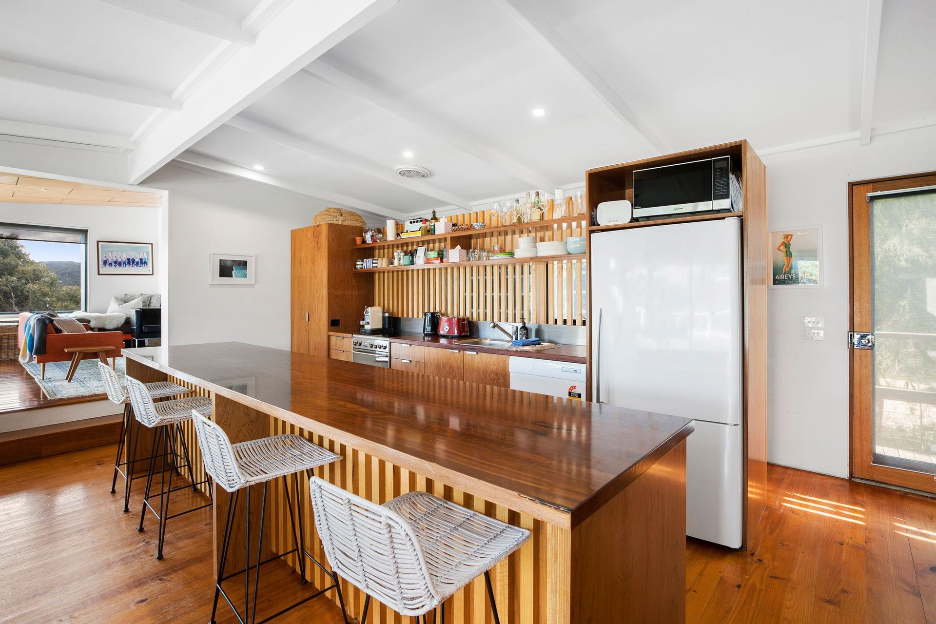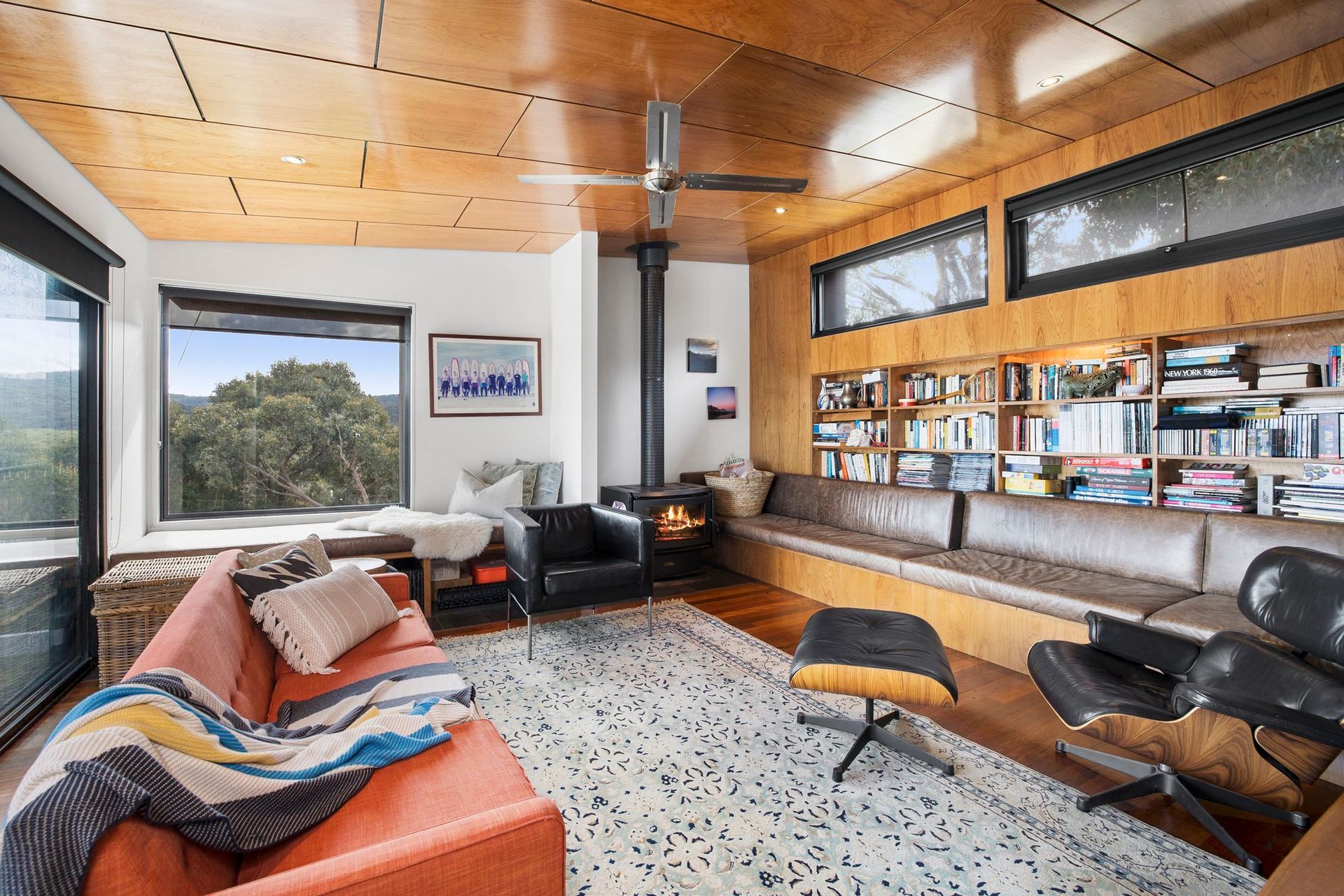 The separate lounge room is a great feature and a place to retreat with in-built seating and timber feature walls and ceiling creating a cool vibe.