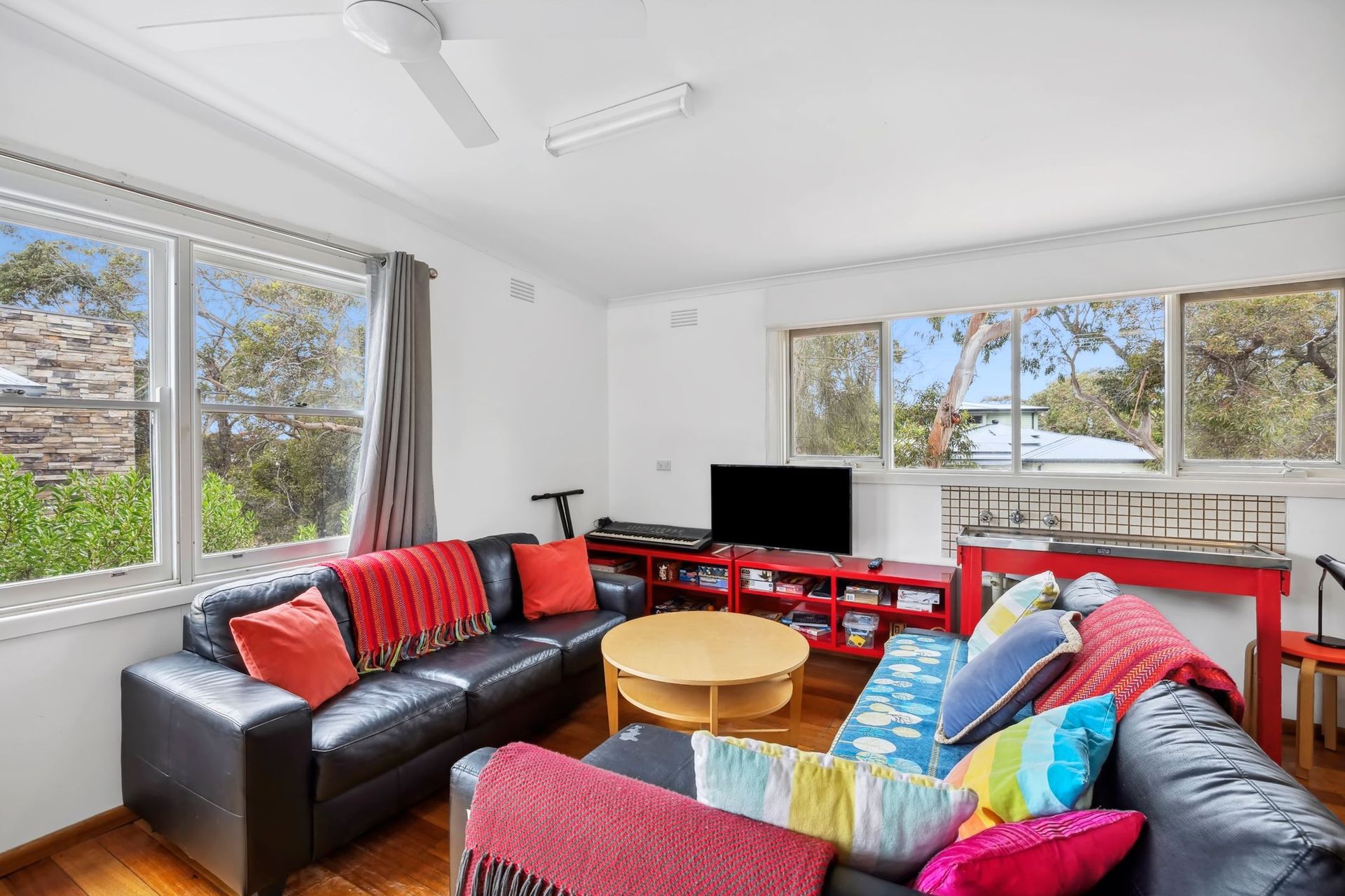 Thoughtfully laid out to accommodate up to 15 guests, the home provides flexibility and comfort across multiple bedrooms and living areas. Upstairs, the second living area doubles as a rumpus room and Bedroom 5, featuring two tri bunk beds, a TV, table tennis, and games—perfect for kids or group stays.