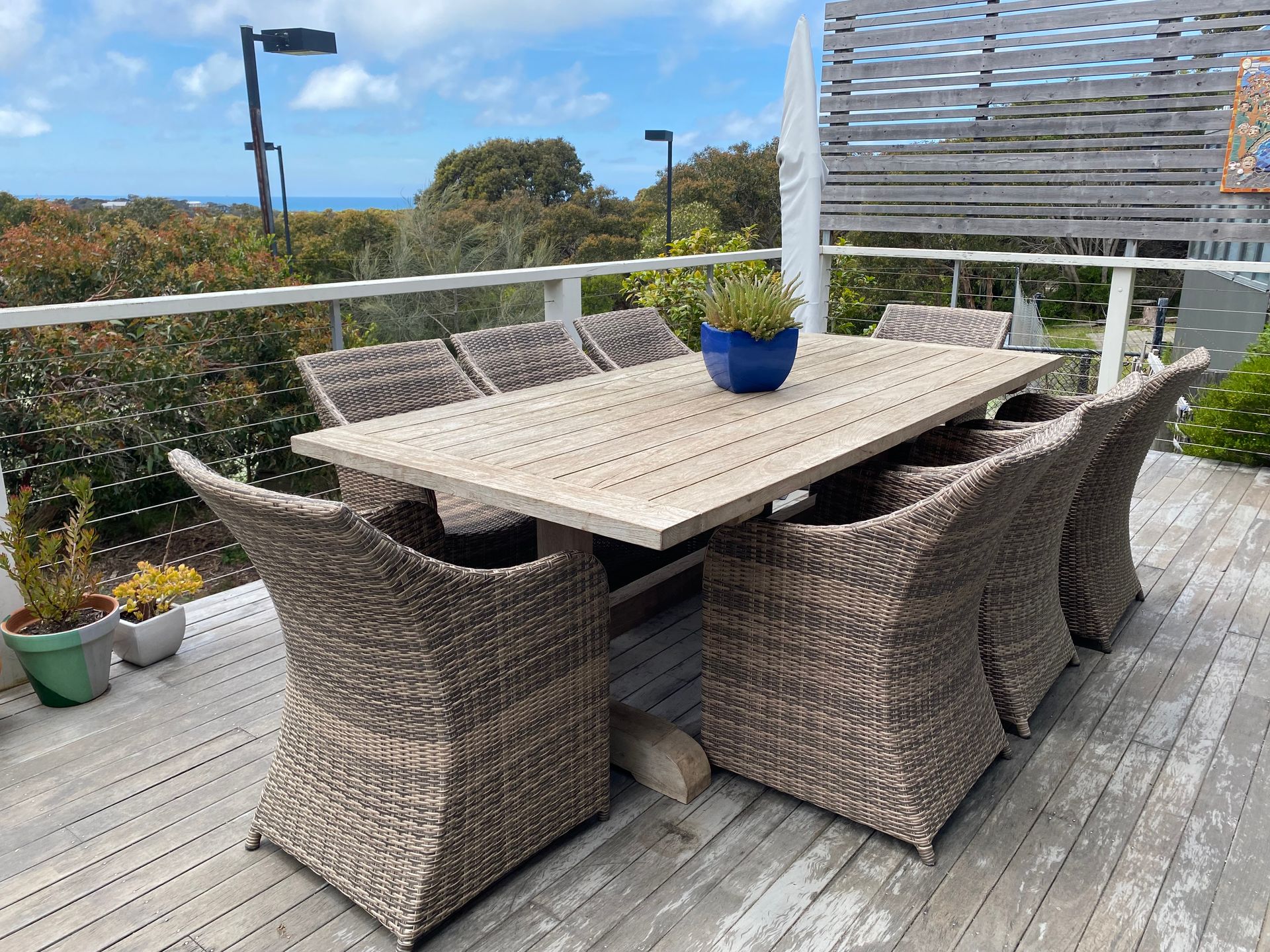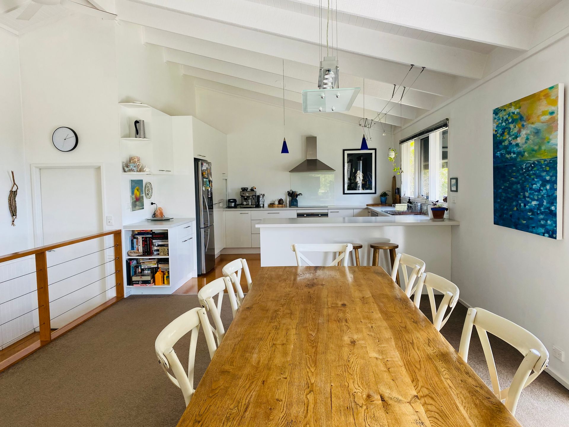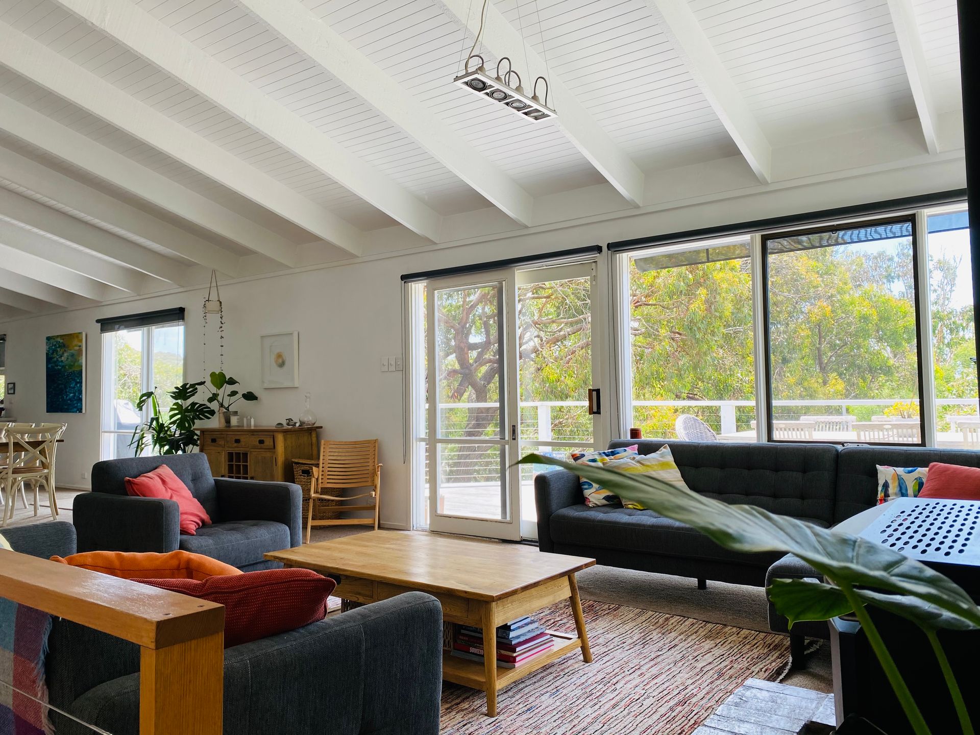 A beautifully presented holiday house which easily caters for 2 families. The open plan kitchen/dining/living area opens out onto a large furnished deck area with distant ocean views.