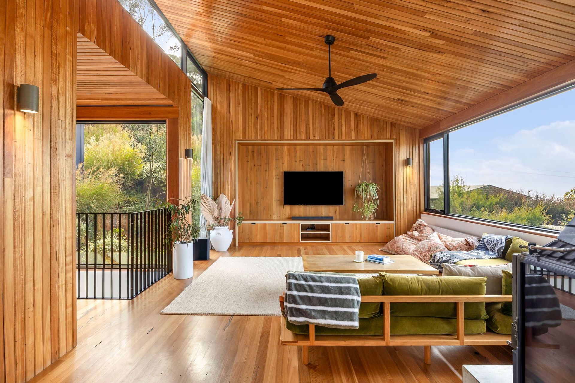 The thoughtfully designed layout balances shared living with private retreats. A king master suite enjoys its own upper-level position with ensuite and balcony, while additional bedrooms on the lower level provide flexible accommodation for families or mixed groups. Multiple bathrooms across the home ensure ease and comfort, particularly for larger bookings.