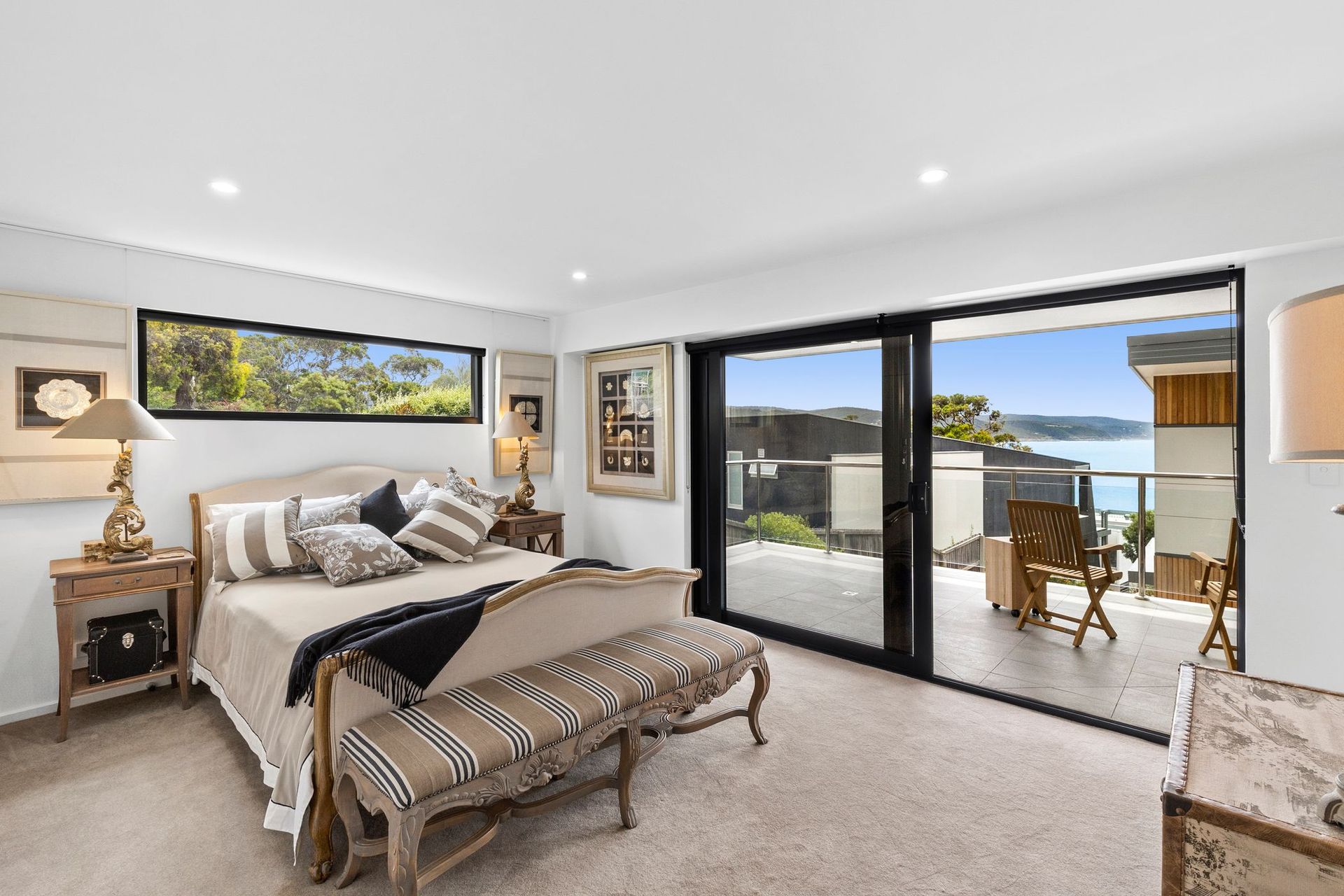 Ascending to the top level finds a classic open plan layout feeding those breathtaking views from the kitchen at the rear all the way through to the upper-level tiled deck area with outdoor furniture and large BBQ. North facing means there is no escaping the ever-changing dappled sunlight across the ocean throughout the day. It is truly mesmerizing.