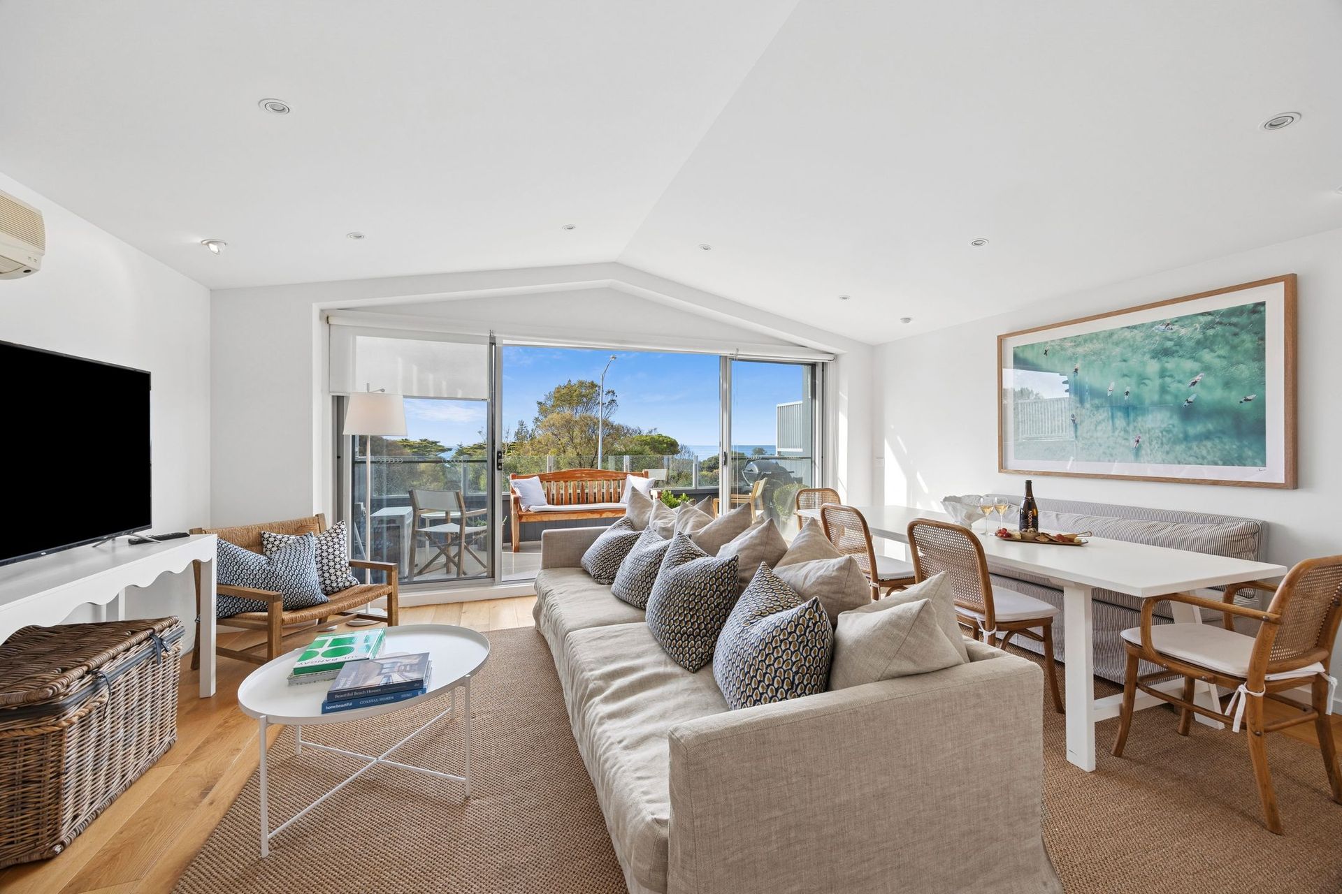 Designed for effortless holidays, the open-plan living and dining area flows seamlessly onto a sunny balcony where you can enjoy the sea breeze, fire up the BBQ, or unwind after a day by the water. Fresh coastal styling, warm timber tones and quality furnishings create an inviting atmosphere, enhanced by abundant natural light throughout. The well-equipped kitchen has everything you need for easy holiday meals, while the comfortable lounge with smart TV offers the perfect place to relax.