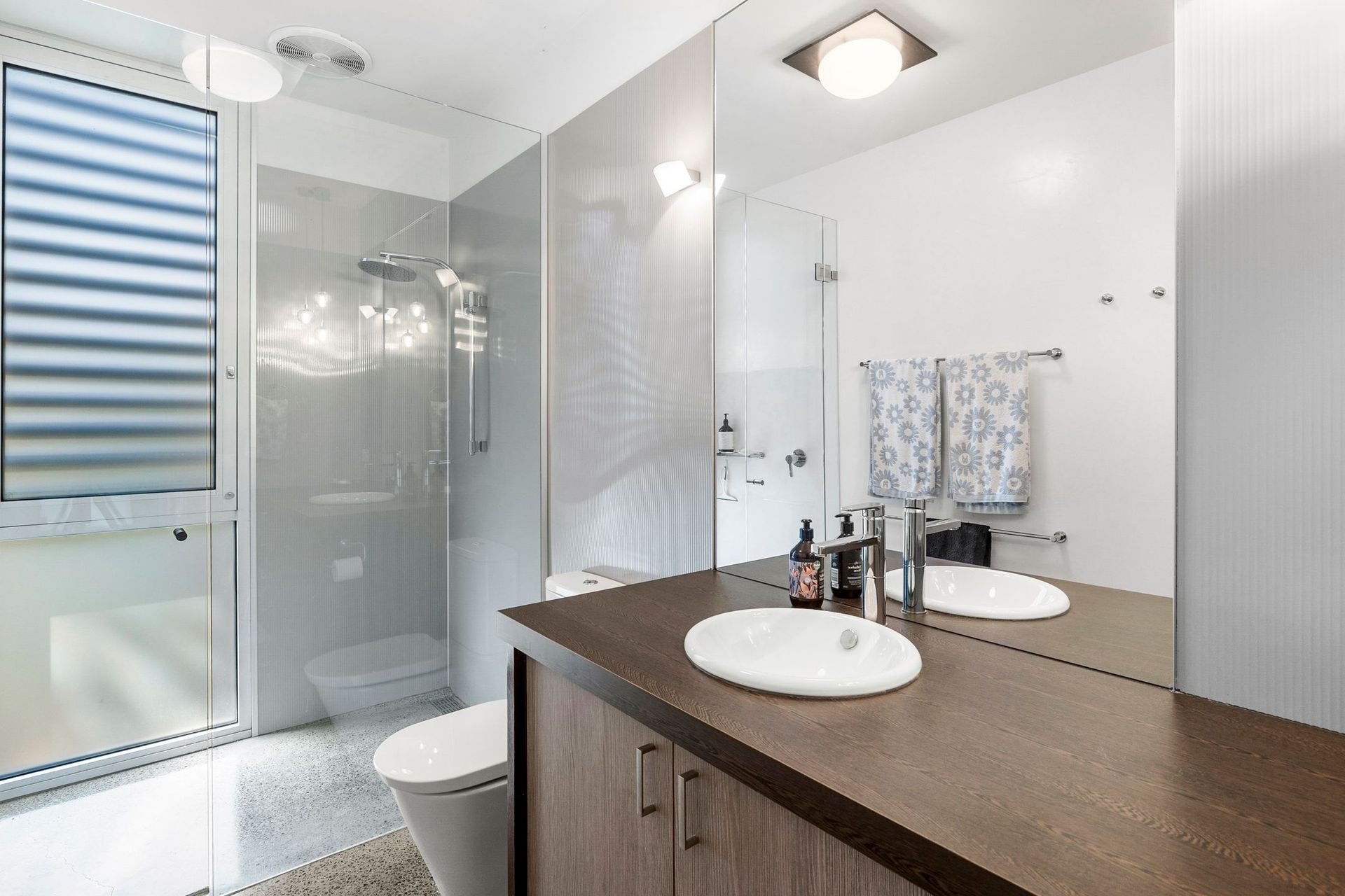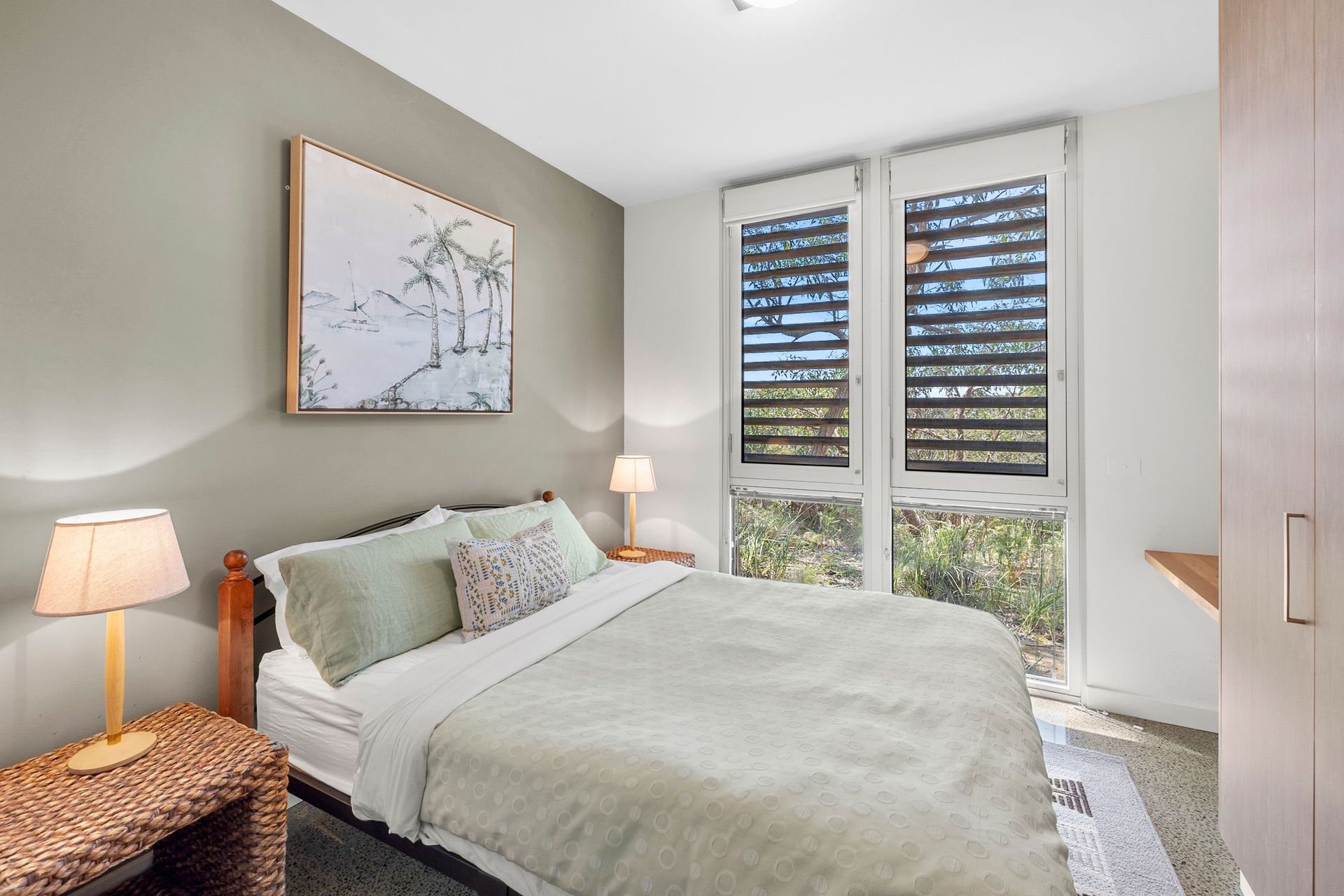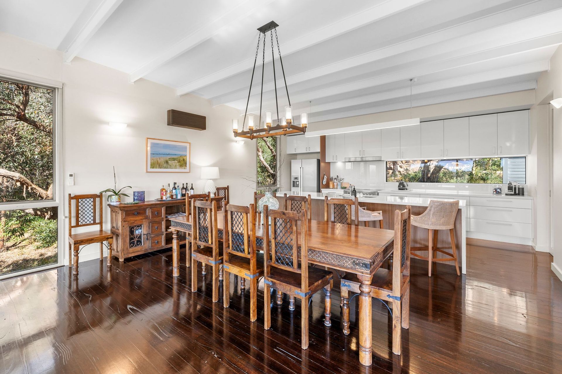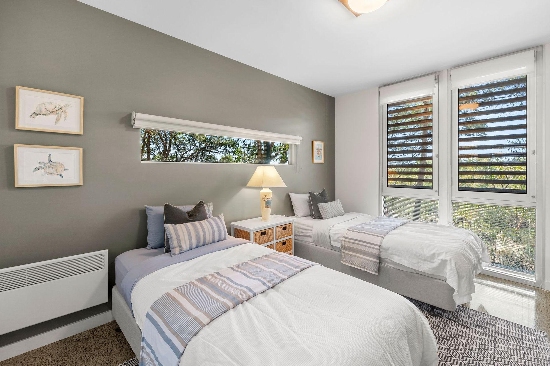 Downstairs, the ground level is beautifully presented with polished concrete floors and smart interior design. Two bedrooms (one with Queen Size bed and another with two King Singles) are supported by a central bathroom with bath and shower.