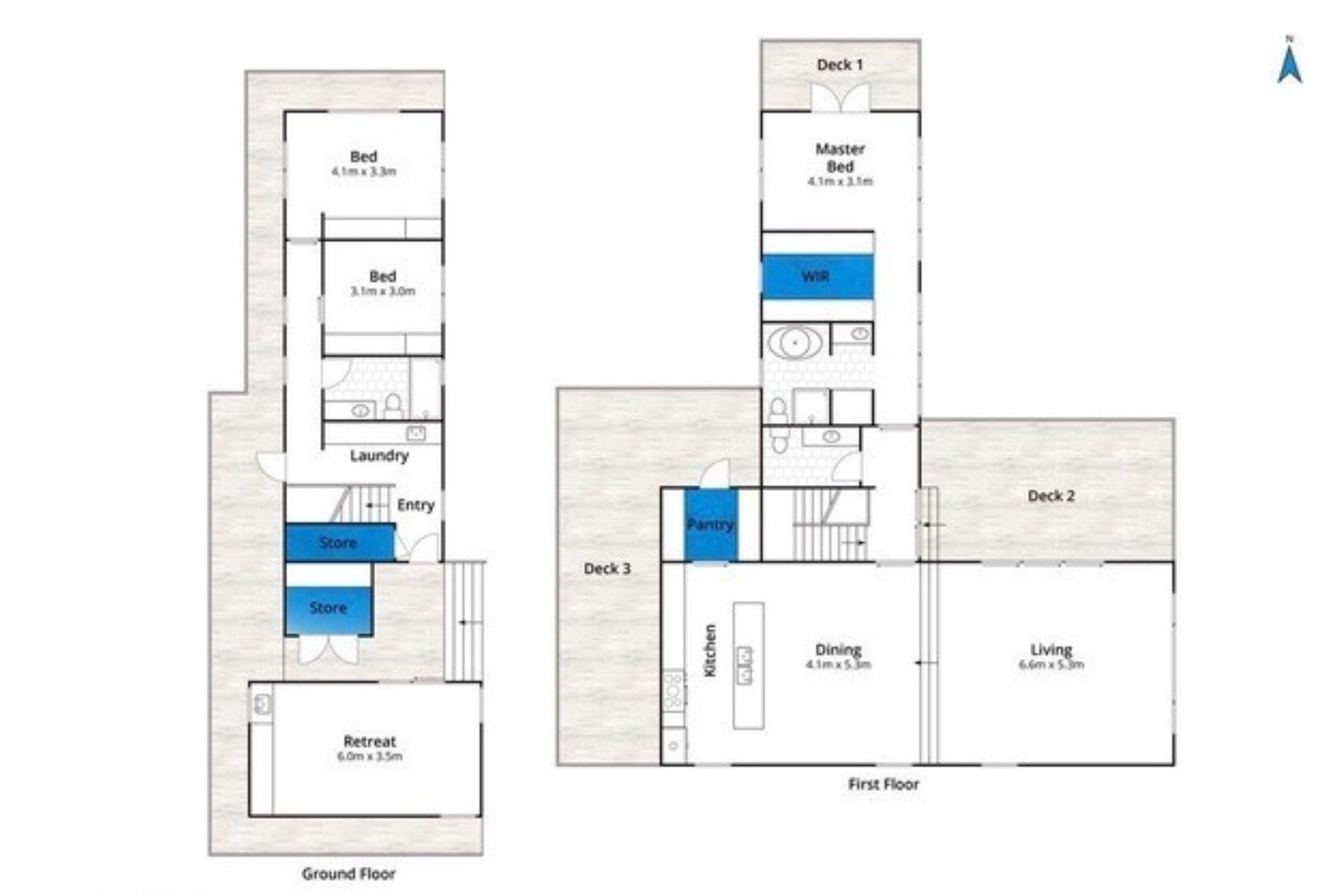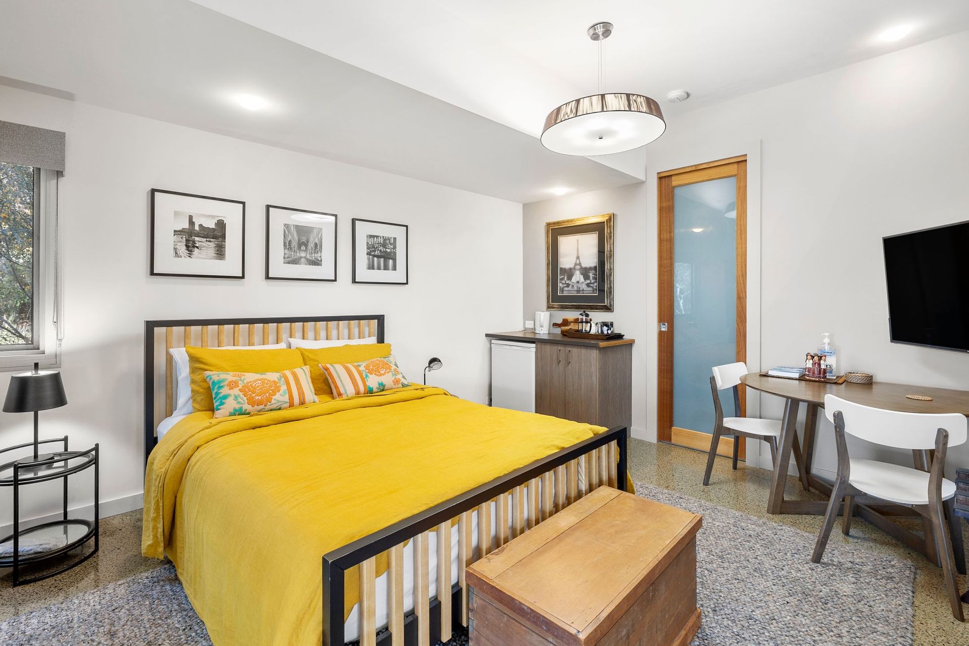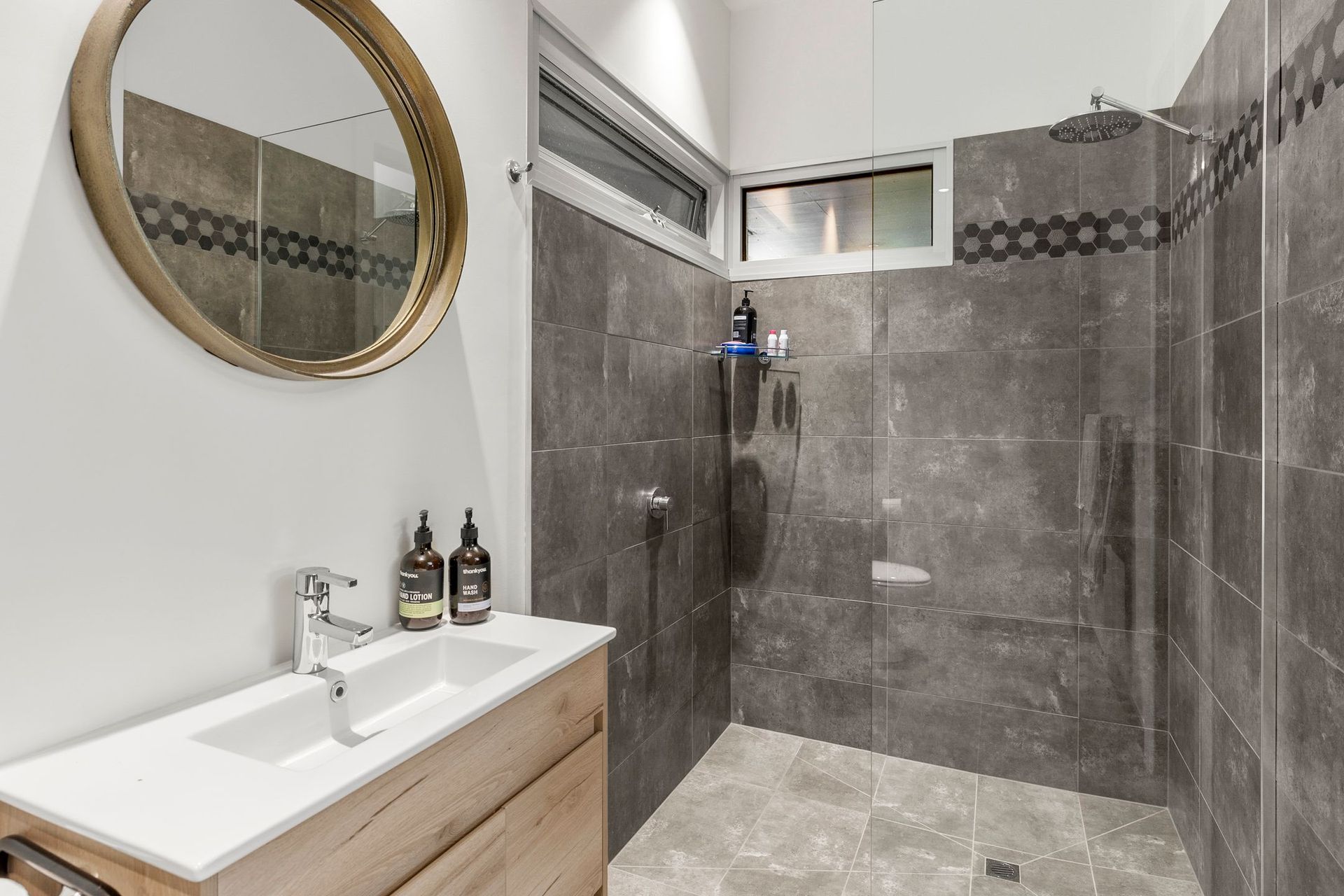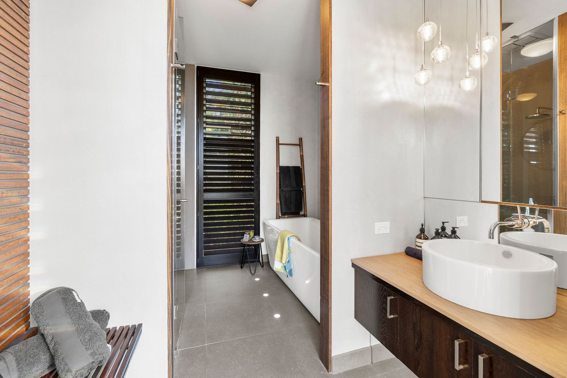 Downstairs, the ground level is beautifully presented with polished concrete floors and smart interior design. Two bedrooms (one with Queen Size bed and another with two King Singles) are supported by a central bathroom with bath and shower.
