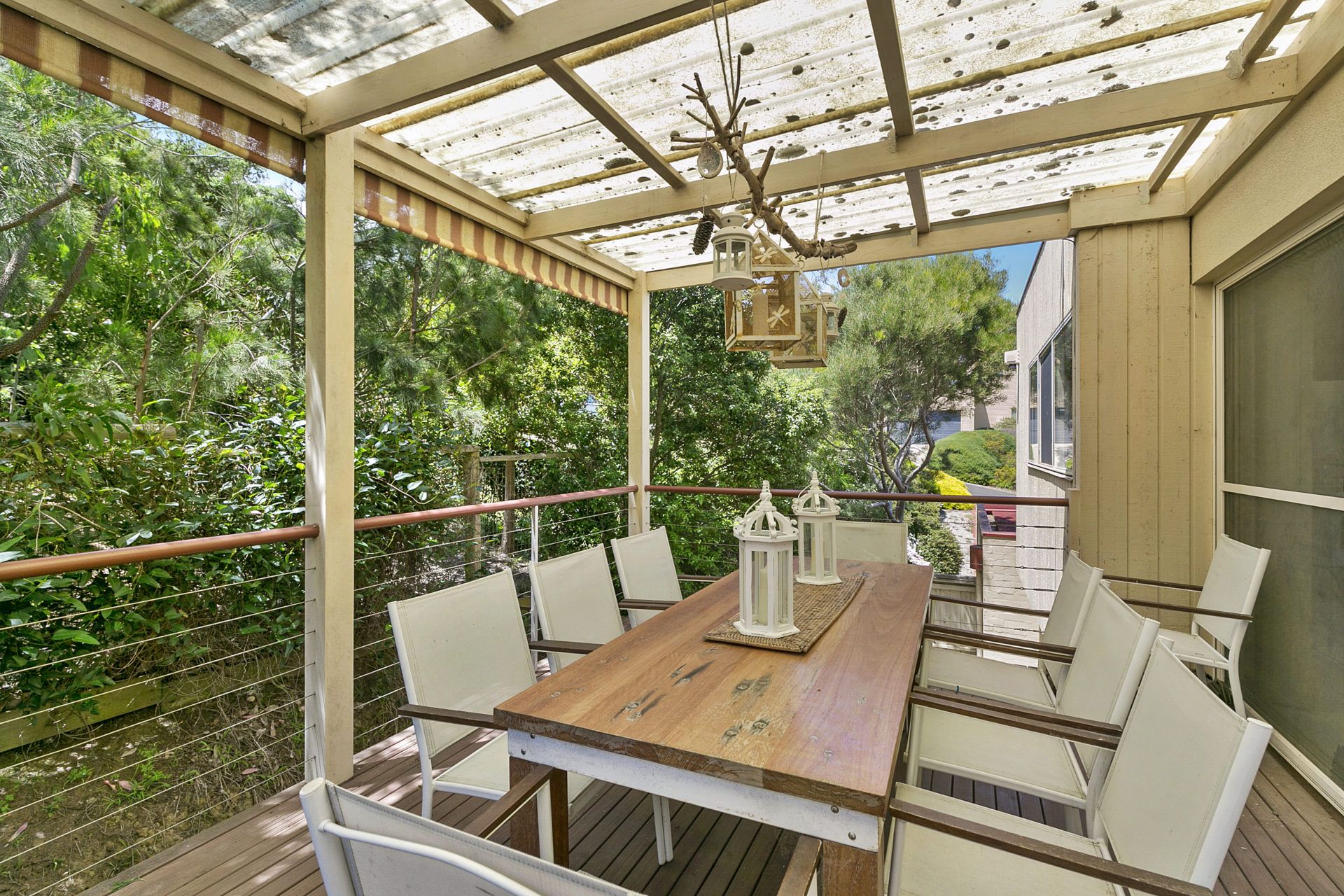 2 decks. One is a covered outdoor dining area off the kitchen complete with gas BBQ. The second is accessed from the living area and is the perfect viewing platform for the amazing view.