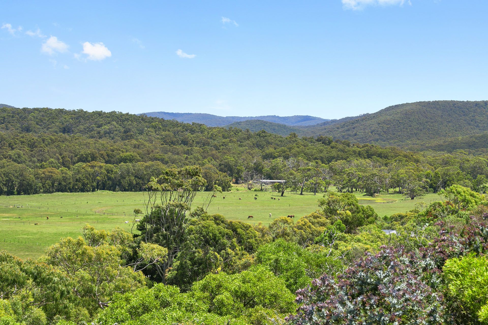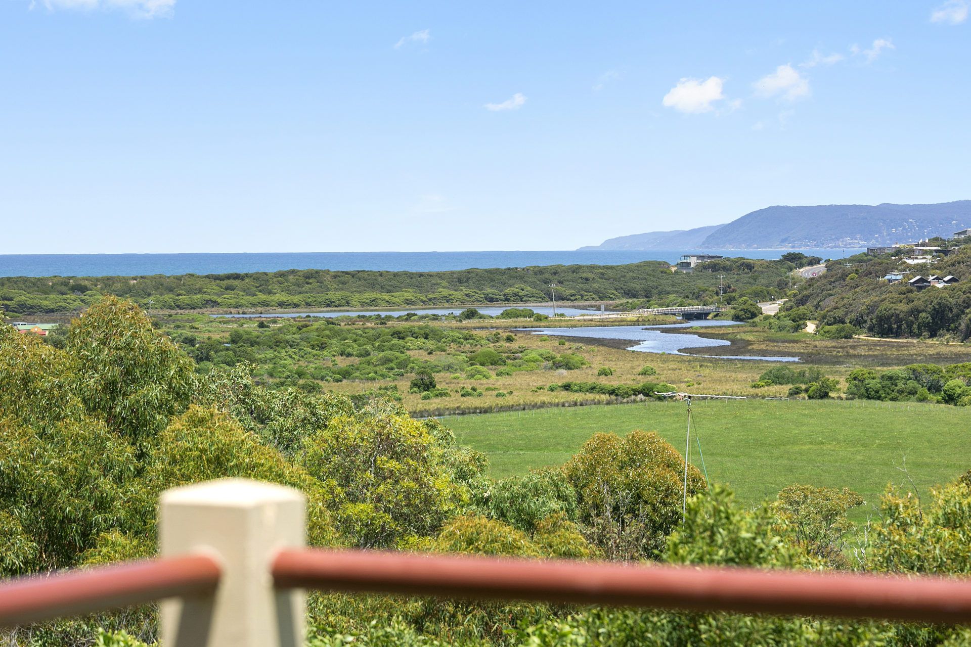 This charming two-storey holiday home offers a breathtaking 180-degree panorama, showcasing sweeping ocean views to Lorne, the picturesque river valley, and the misty hills of the National Otway Park. You'll also spot horses and kangaroos grazing in the distance, adding to the serene natural beauty.