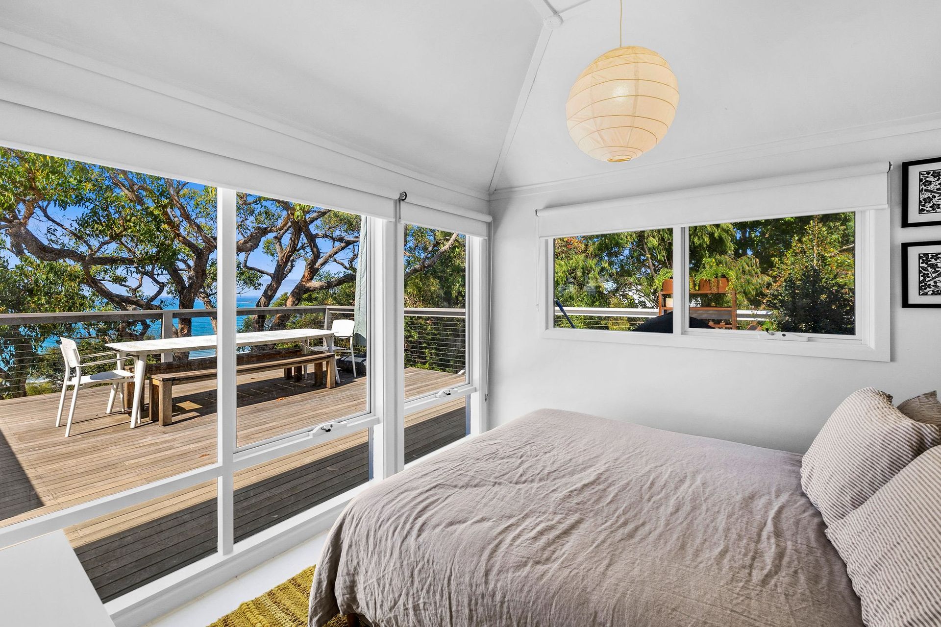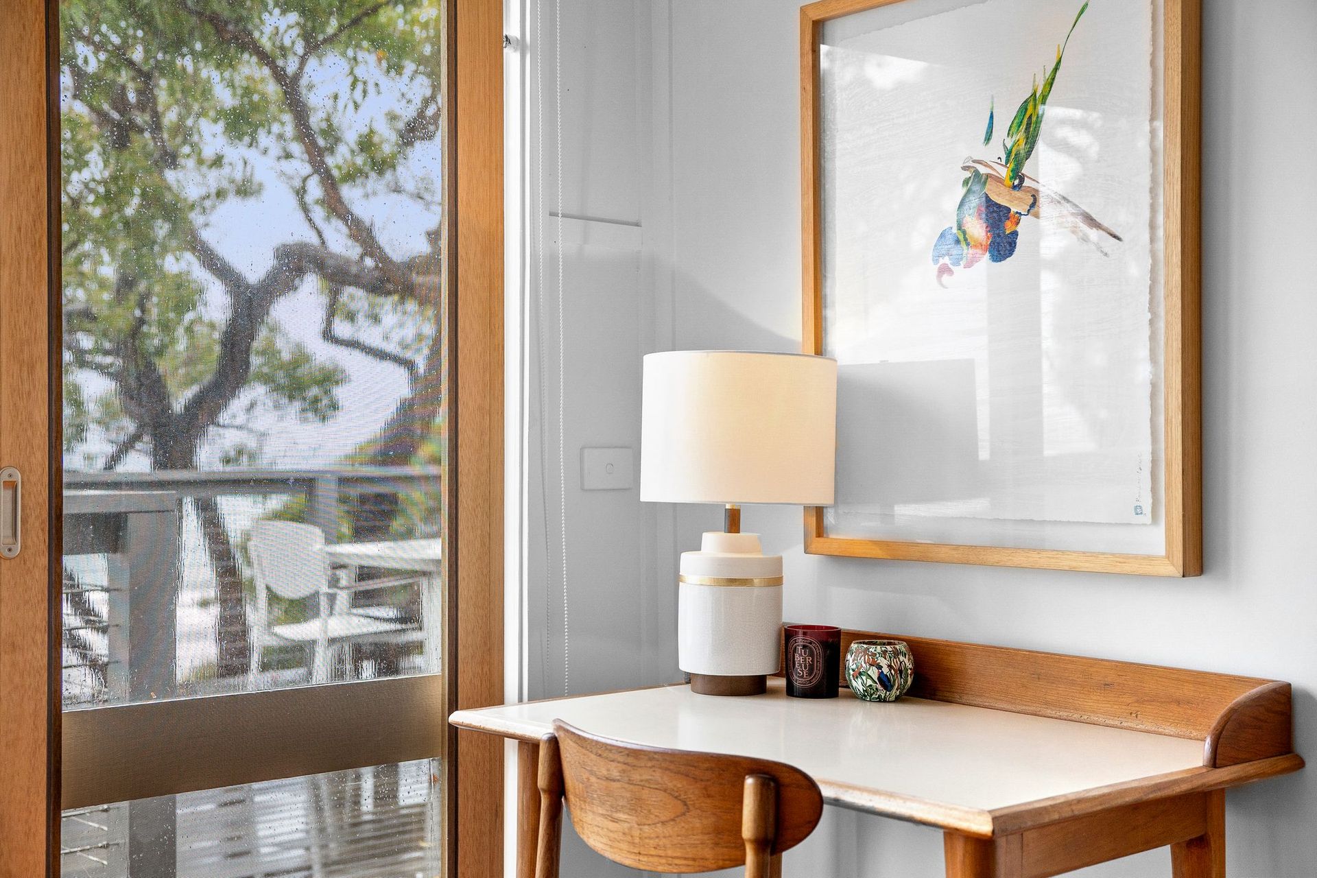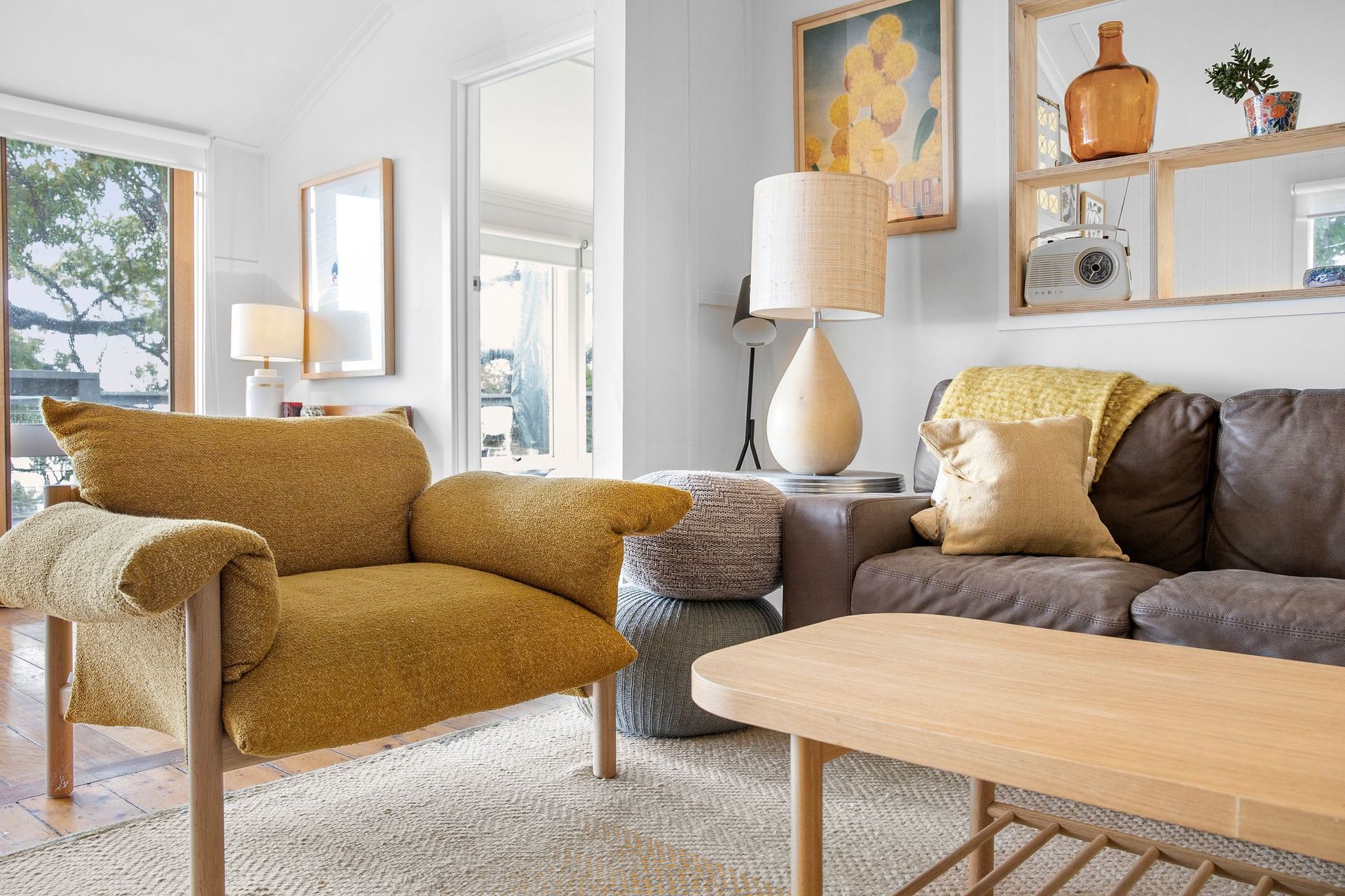 Heading upstairs you will find two bedrooms, both with Queen size beds sharing a main bathroom and all flanking the lounge and funky galley style kitchen. This whole space feels as modern as it does all original. Classic retro furnishings with all original hardwood floors and paneled ceilings. The views up top are pretty impressive too, as is the huge outdoor deck and landscaped gardens surrounding the whole home.