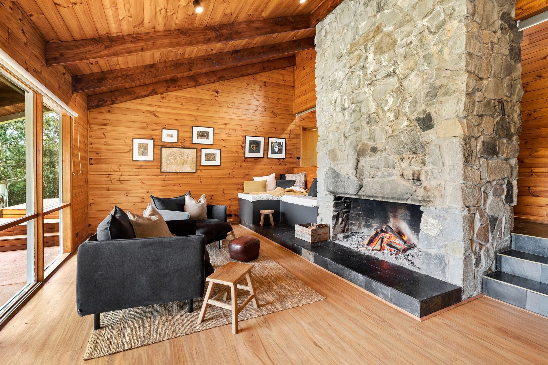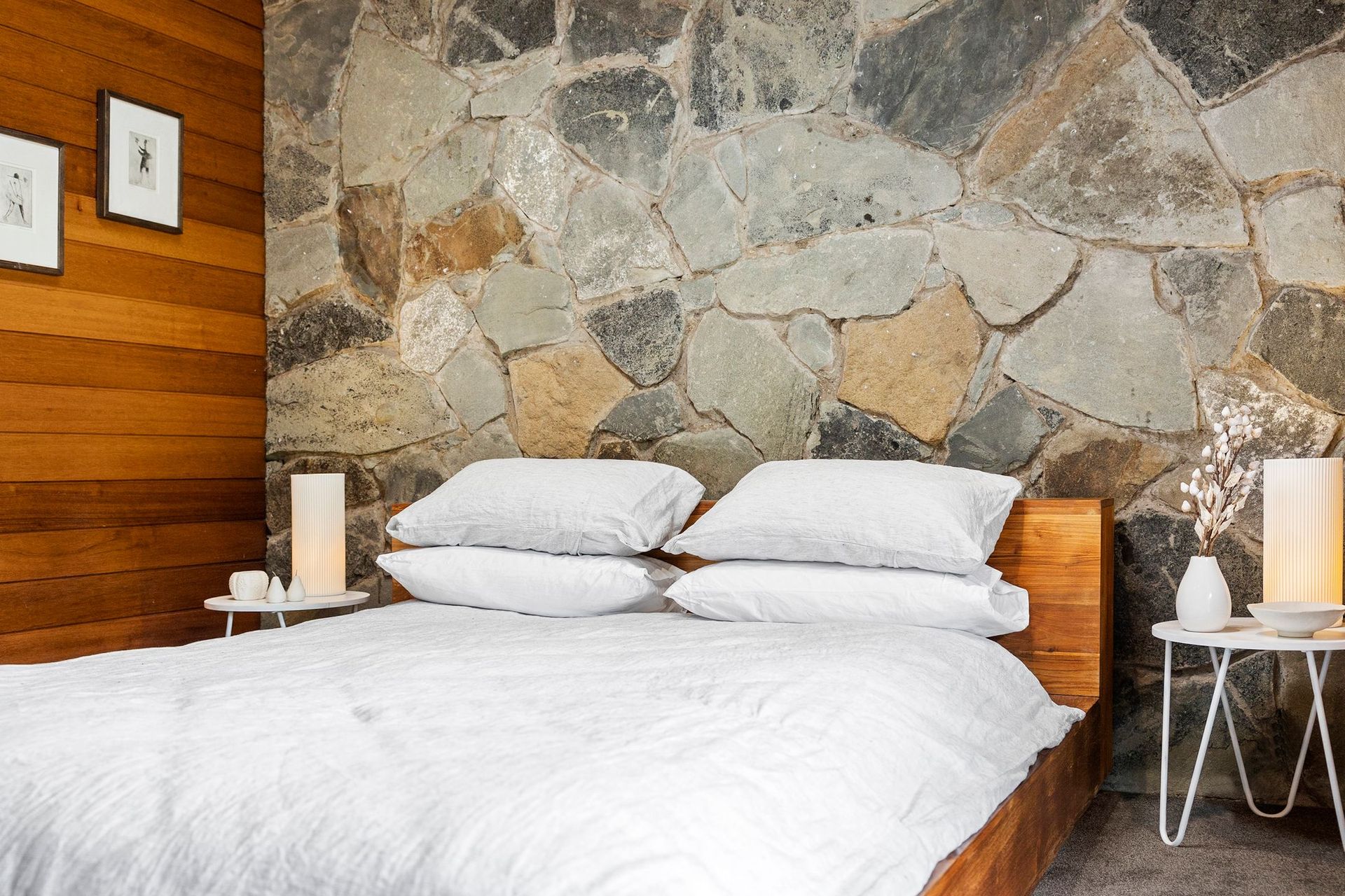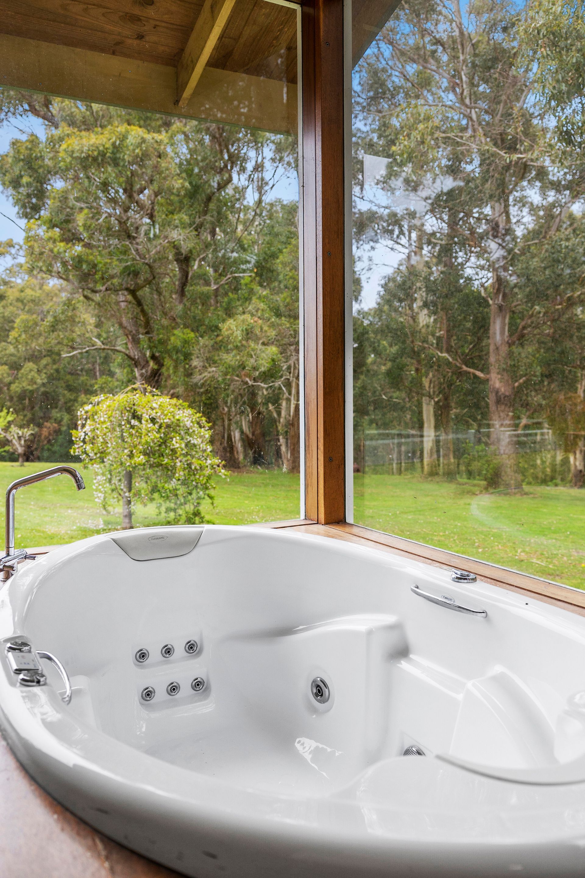 The master bedroom, featuring a wall of stone opens out onto a private ensuite complete with a built-in spa. The spa room itself is surrounded by floor to ceiling windows and allows guests the opportunity to soak away the day with a glass of wine surrounded by nature.