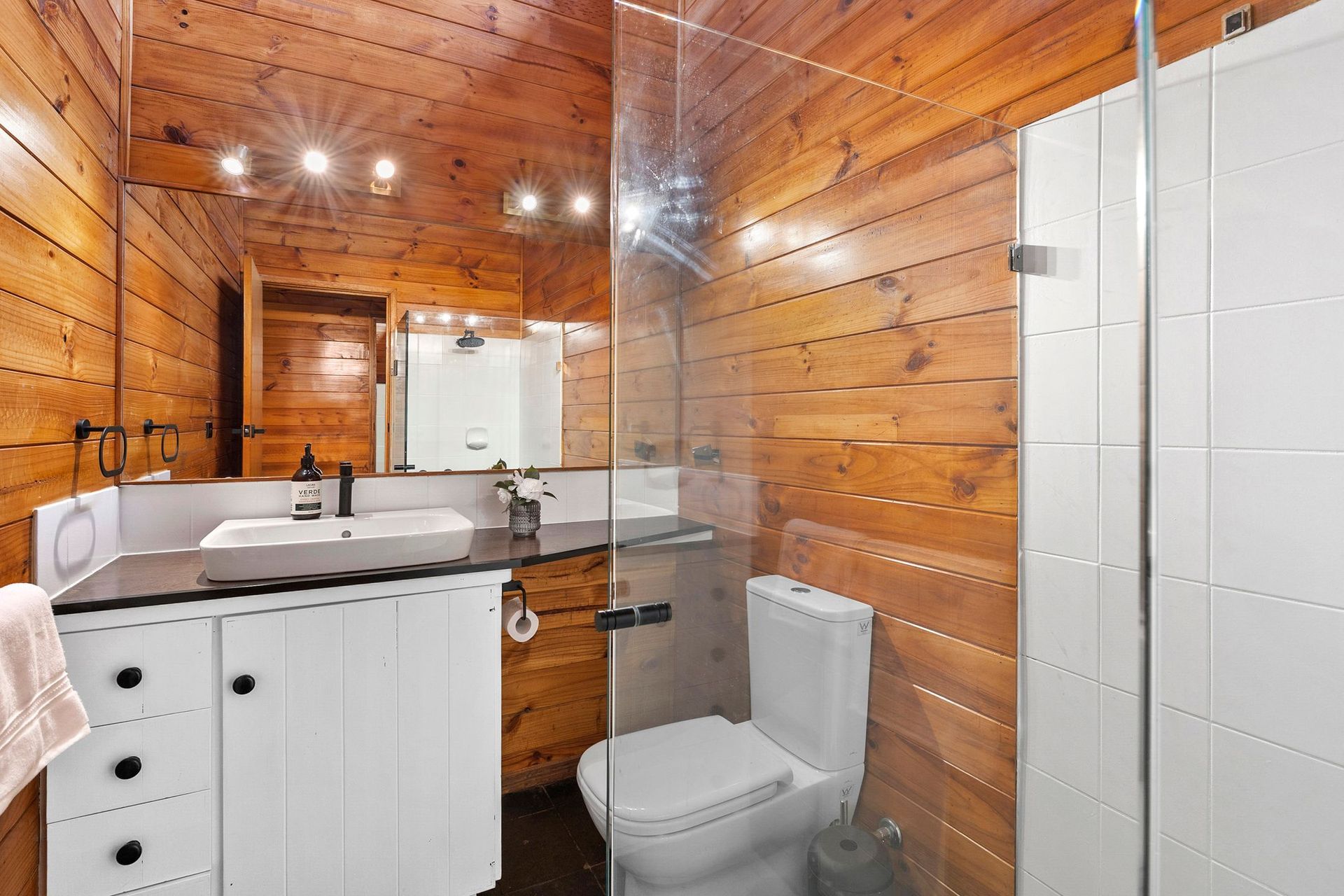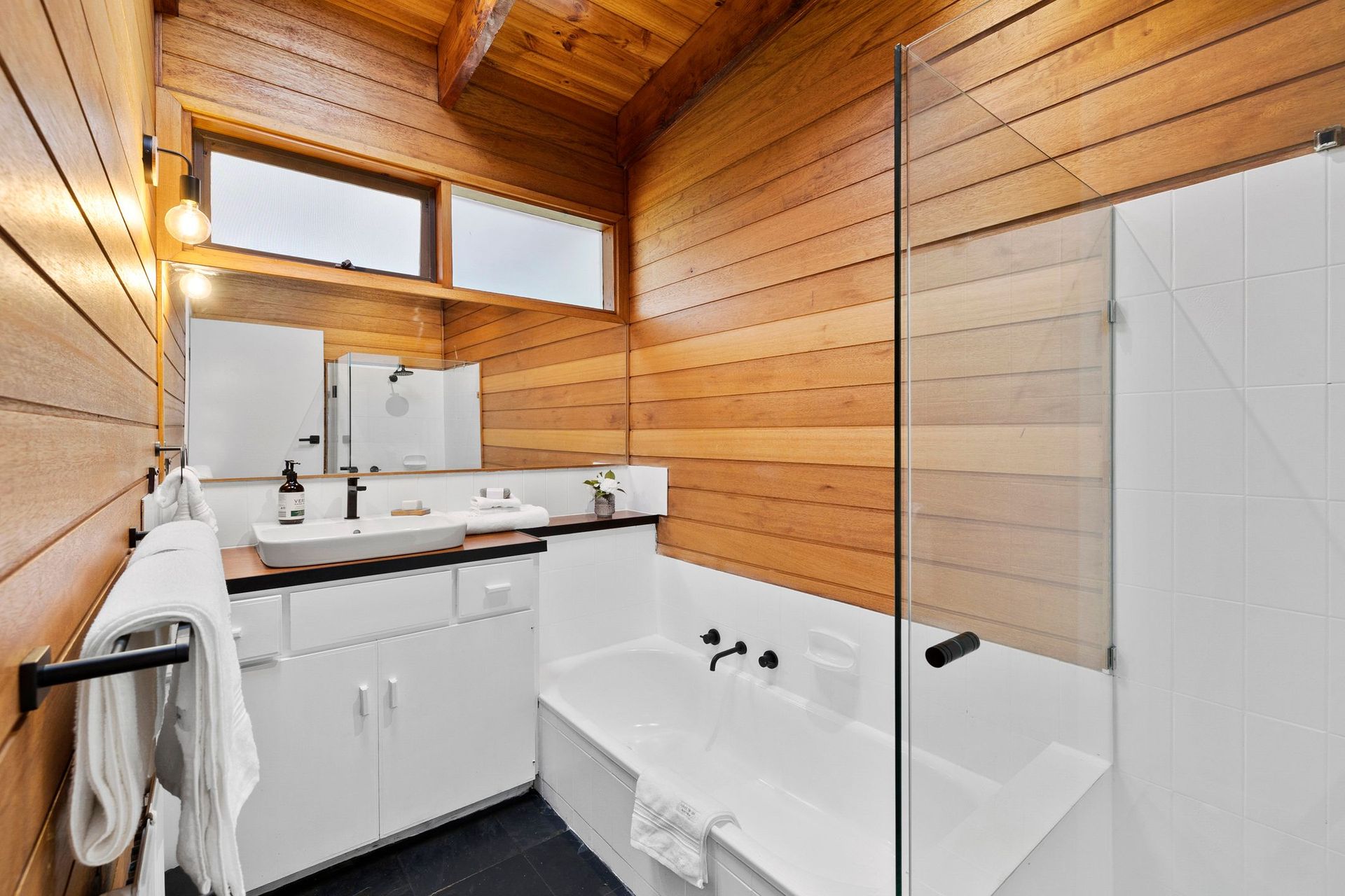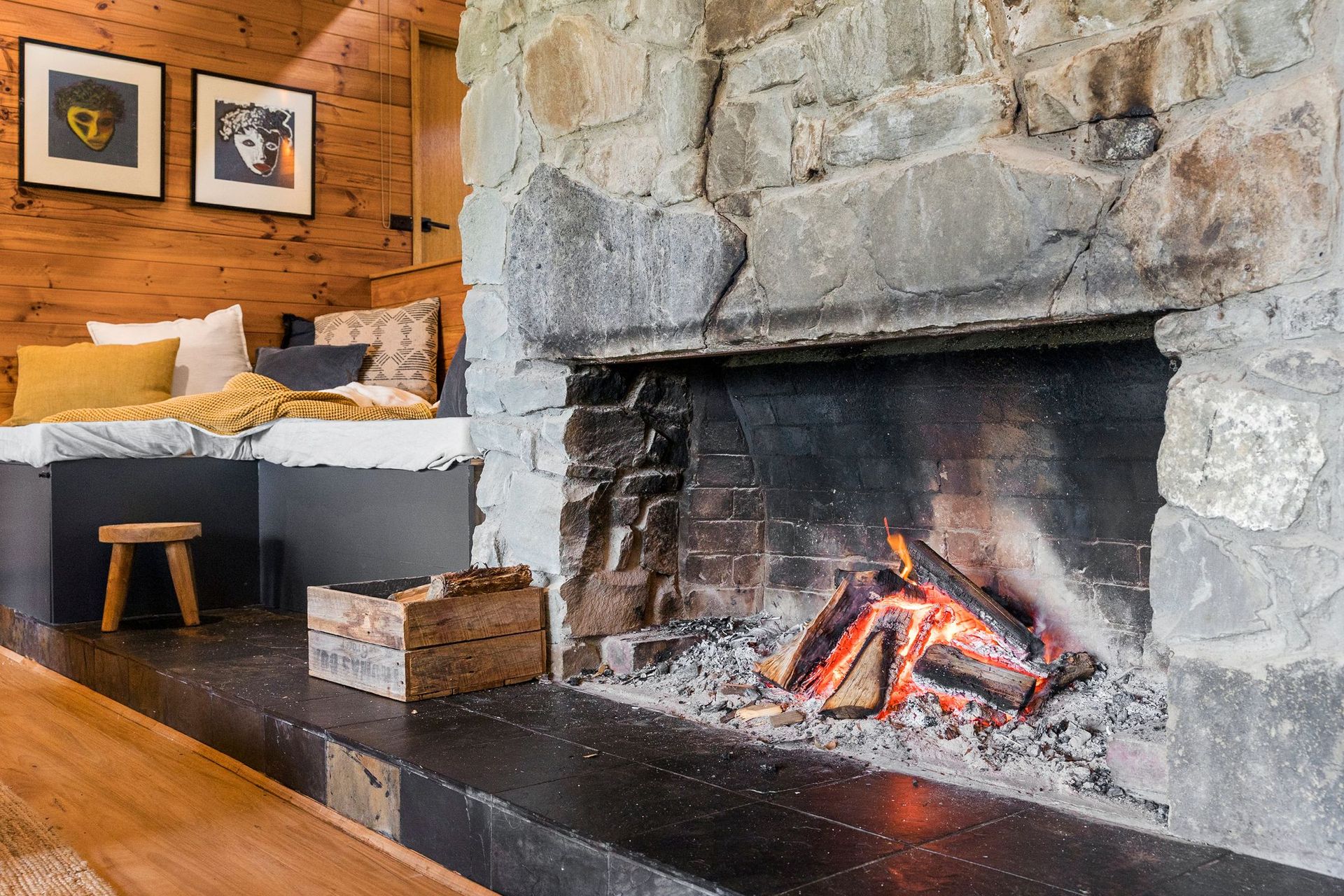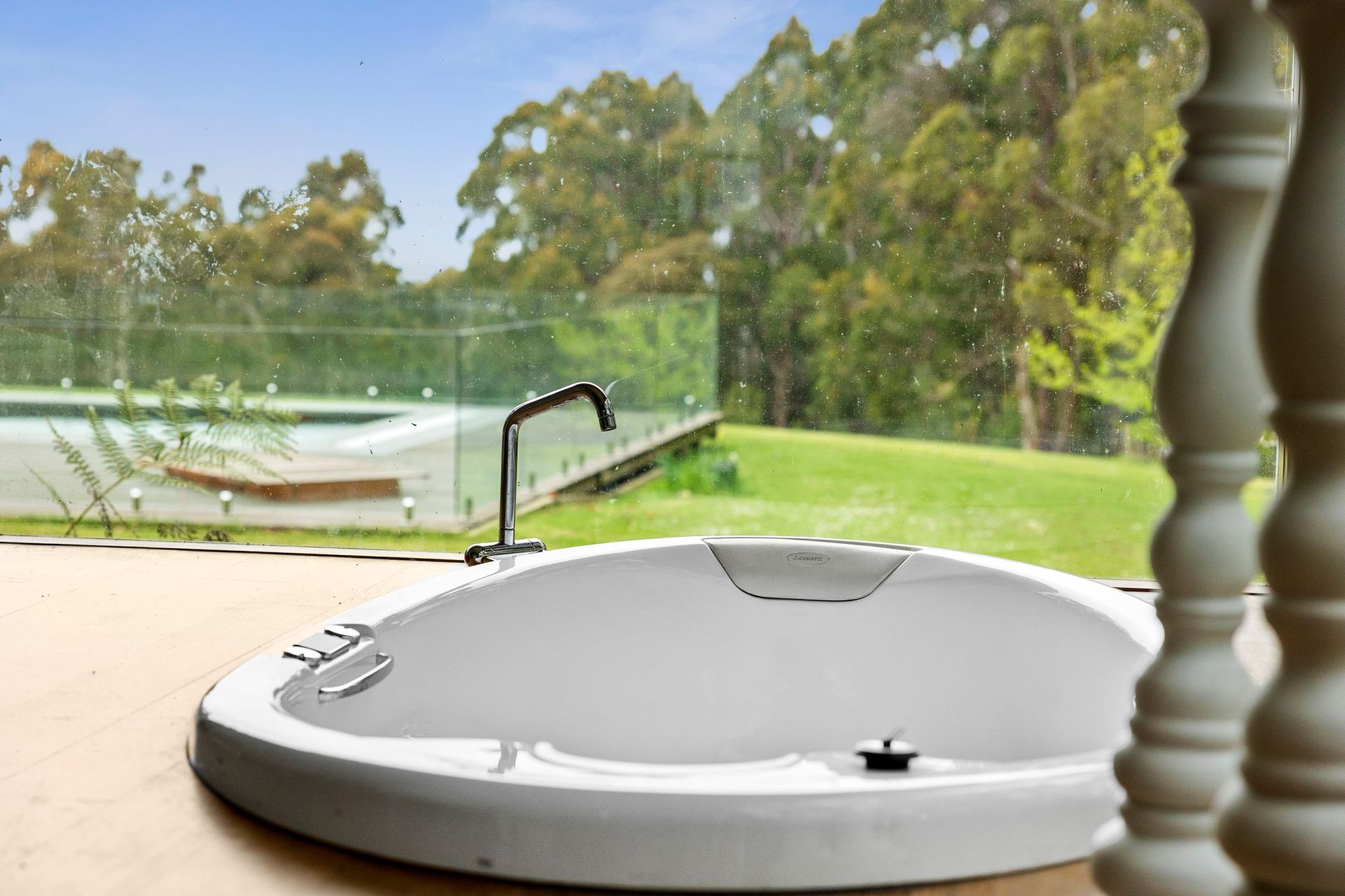 The master bedroom, featuring a wall of stone opens out onto a private ensuite complete with a built-in spa. The spa room itself is surrounded by floor to ceiling windows and allows guests the opportunity to soak away the day with a glass of wine surrounded by nature.