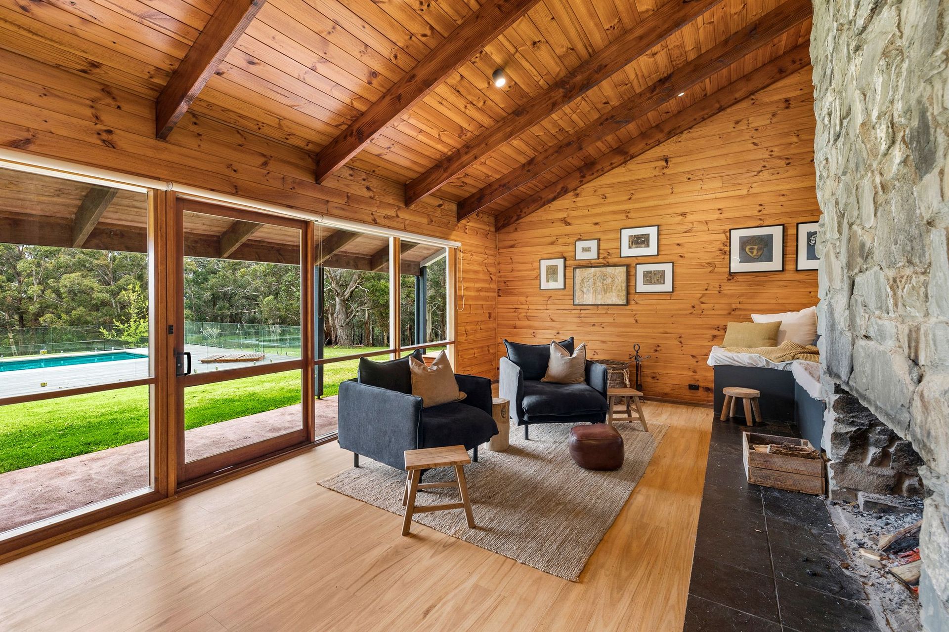 To the rear of the home, a sizable country kitchen/dining area flows onto an alfresco area with BBQ and ample seating for the entire family. A sunken lounge boasts a wonderous floor to ceiling stone open fire place, smart TV, reading chairs and a view out to the impressive solar heated pool. The pool is surrounded by undulating green grass, towering local gums and rewarding glimpses of the ocean.