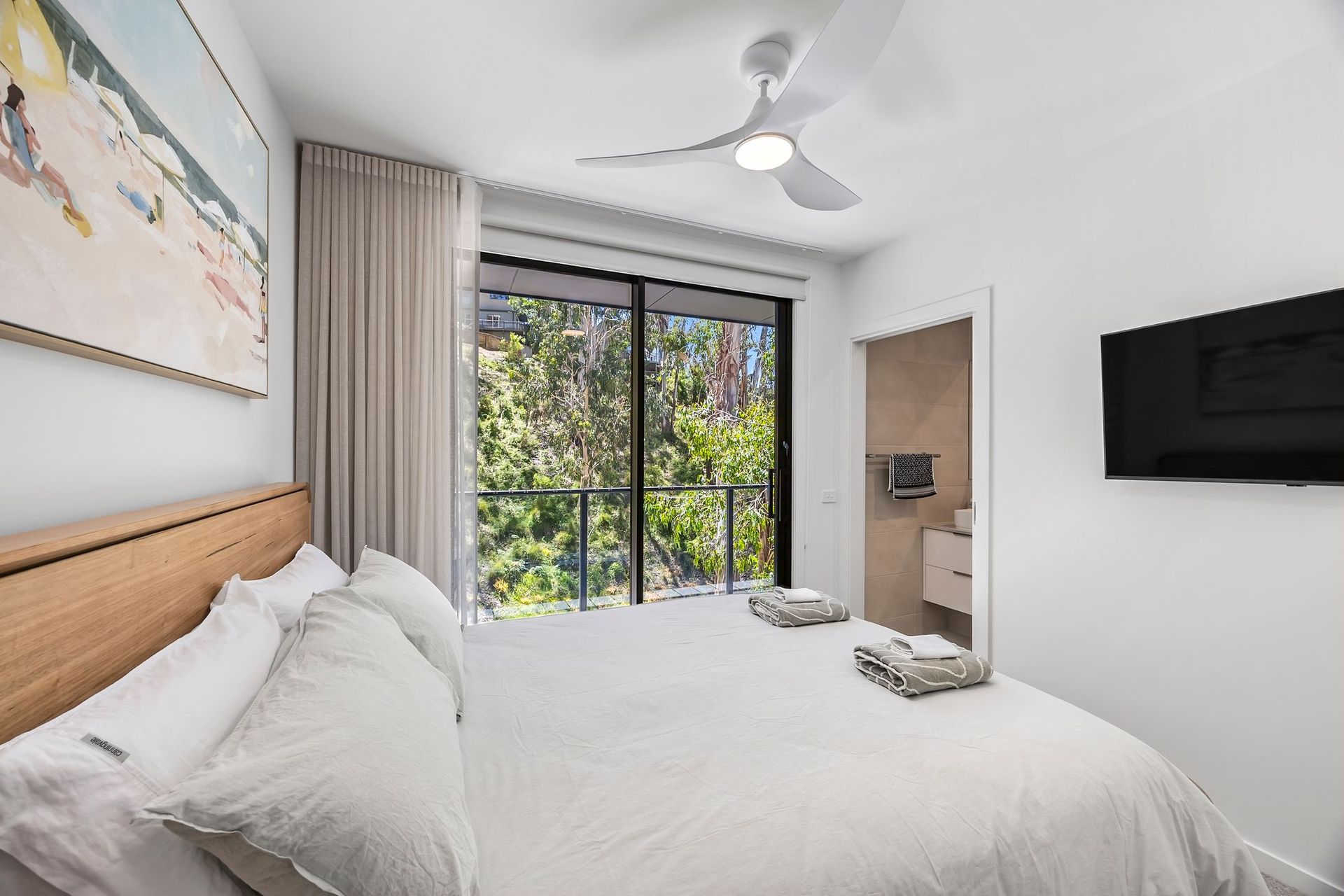 Bedroom 1: Queen, En suite, Balcony Access, Built in Robe, Smart TV