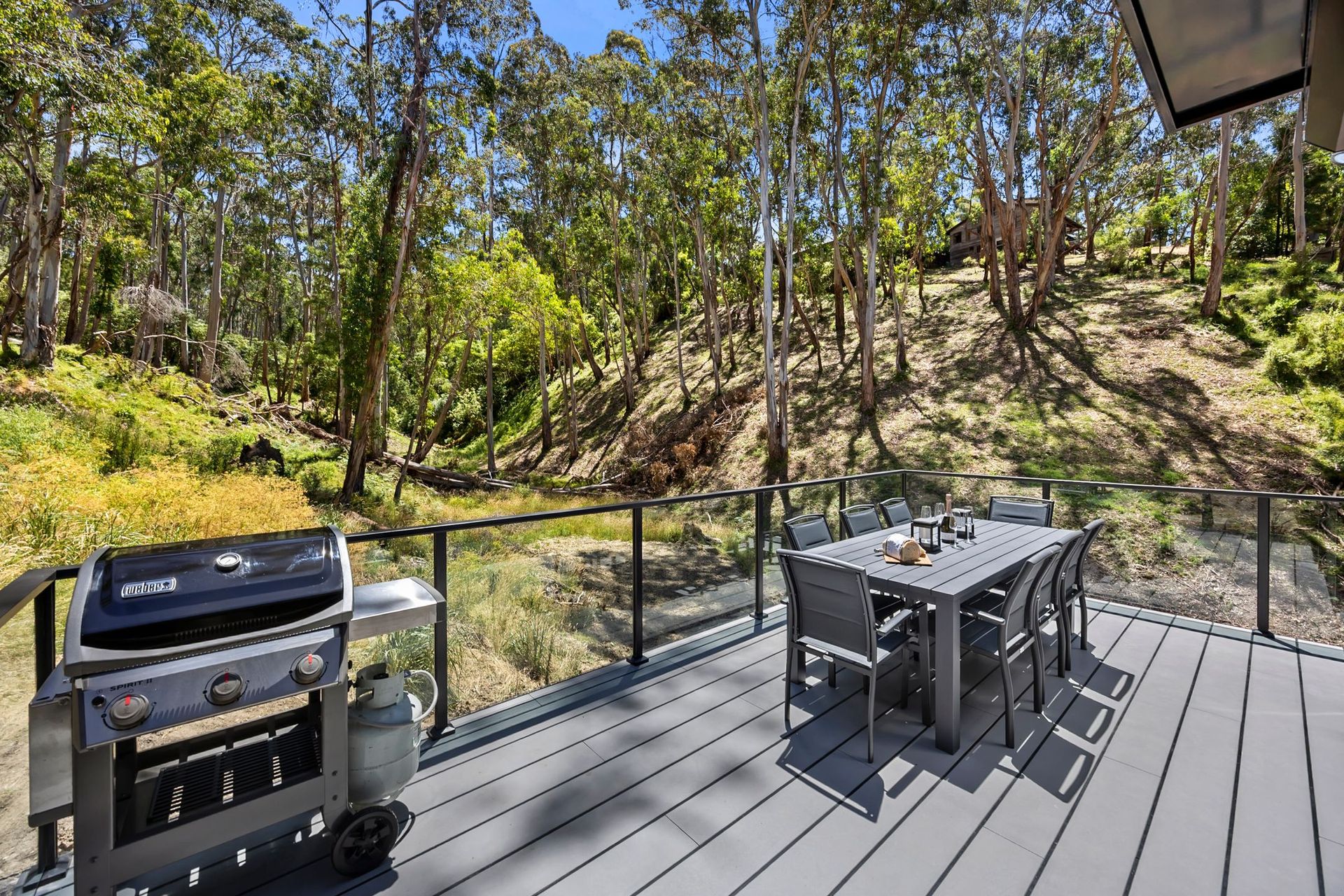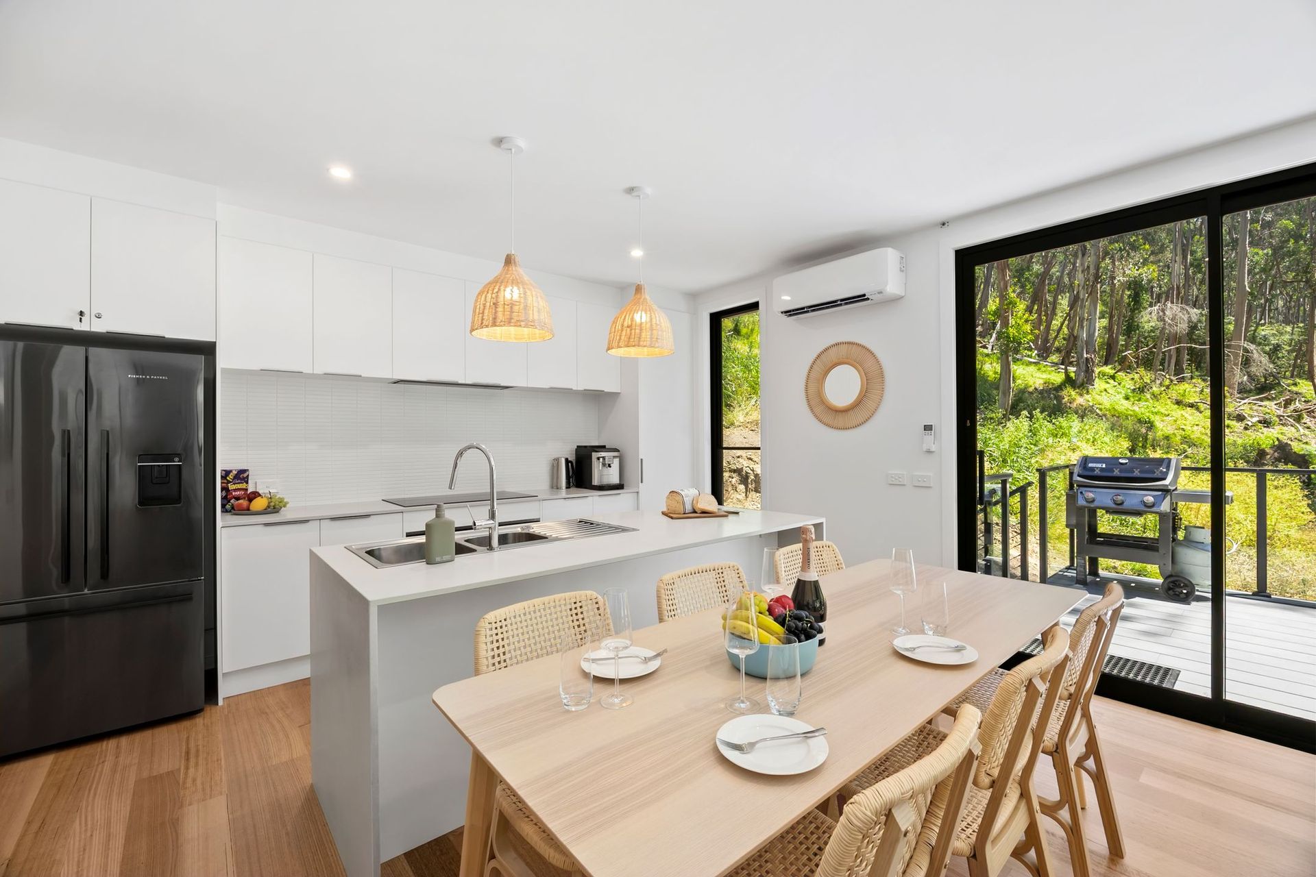 Step inside to an open plan living, dining, and kitchen area that invites you to unwind after a day by the sea. With modern furnishings and all the essentials for a stress-free stay, you’ll feel right at home. Slide open the doors, breathe in the fresh coastal air, and enjoy alfresco dining on the deck—whether it’s a BBQ under the stars or a morning coffee as the bushland wakes around you.