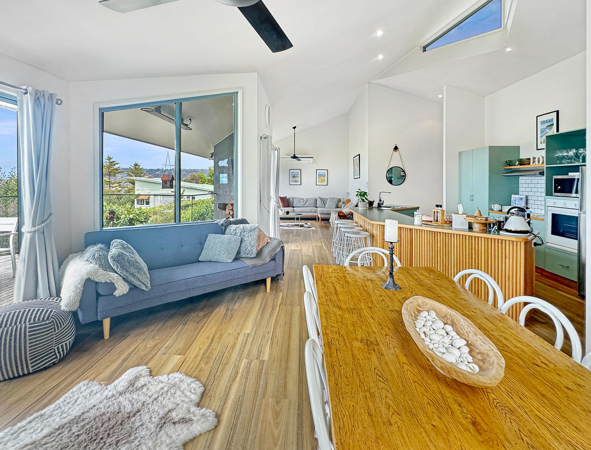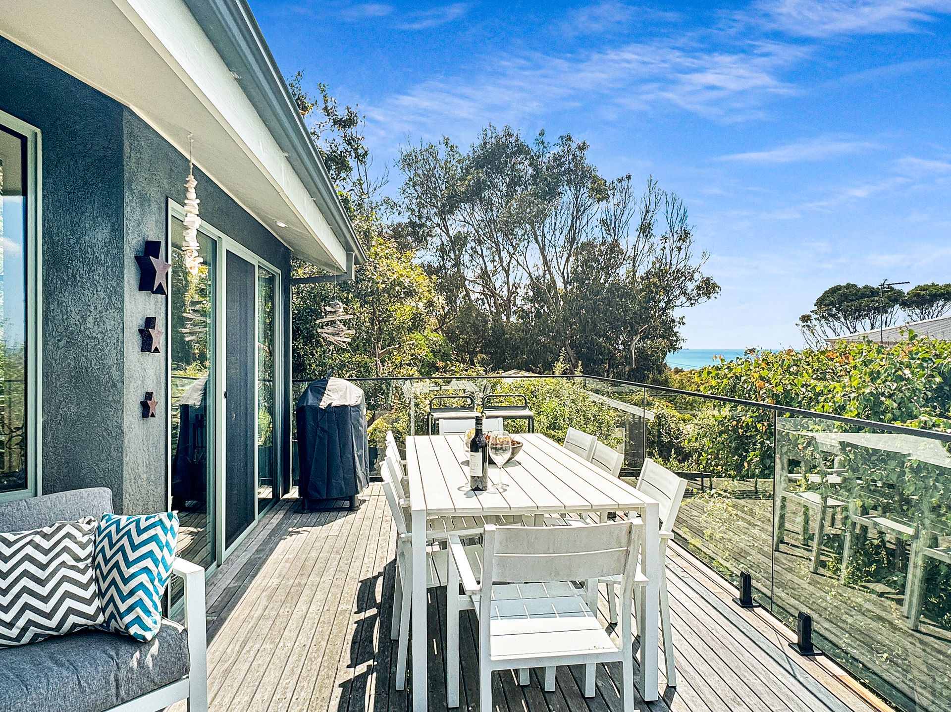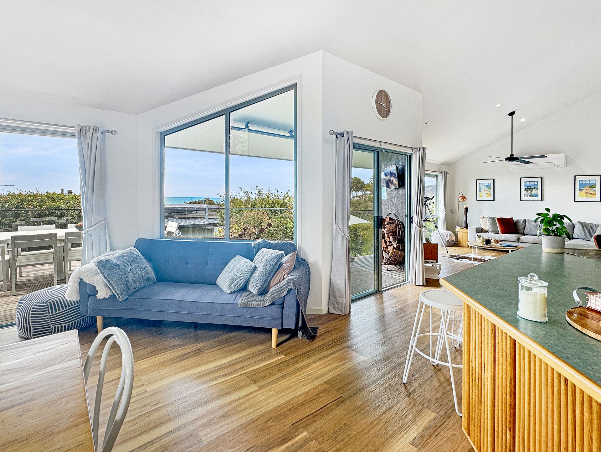 The open-plan living space flows seamlessly onto a large deck equipped with a BBQ, outdoor lounge, and TV, all while offering sweeping views from Aireys Lighthouse to the Lorne Pier. The fully equipped kitchen ensures effortless entertaining, whether you’re hosting family or friends.