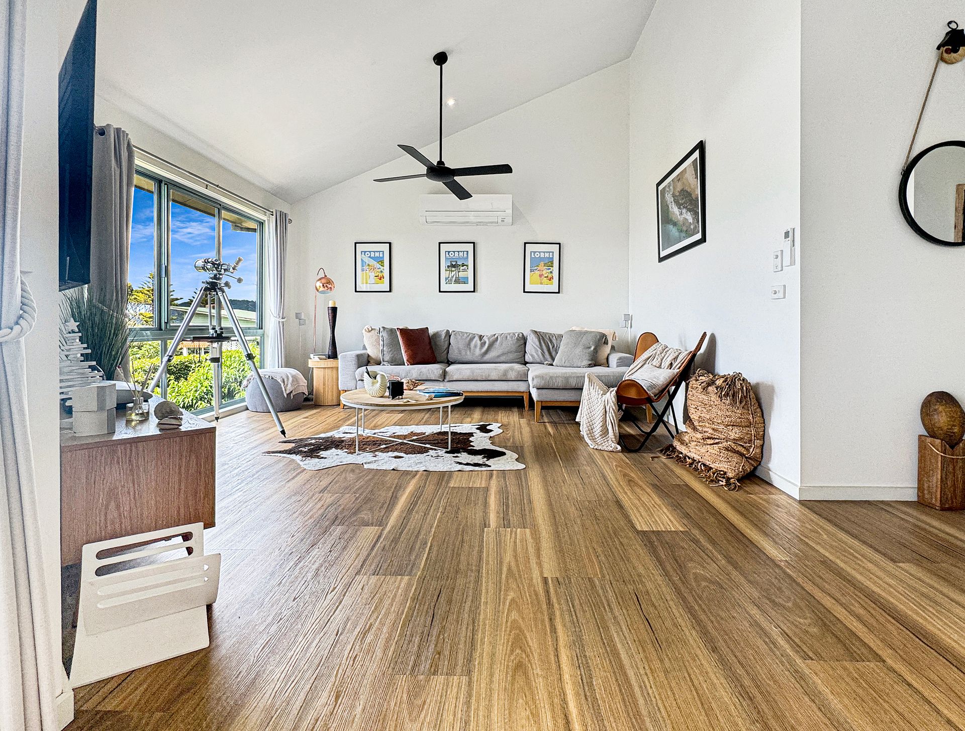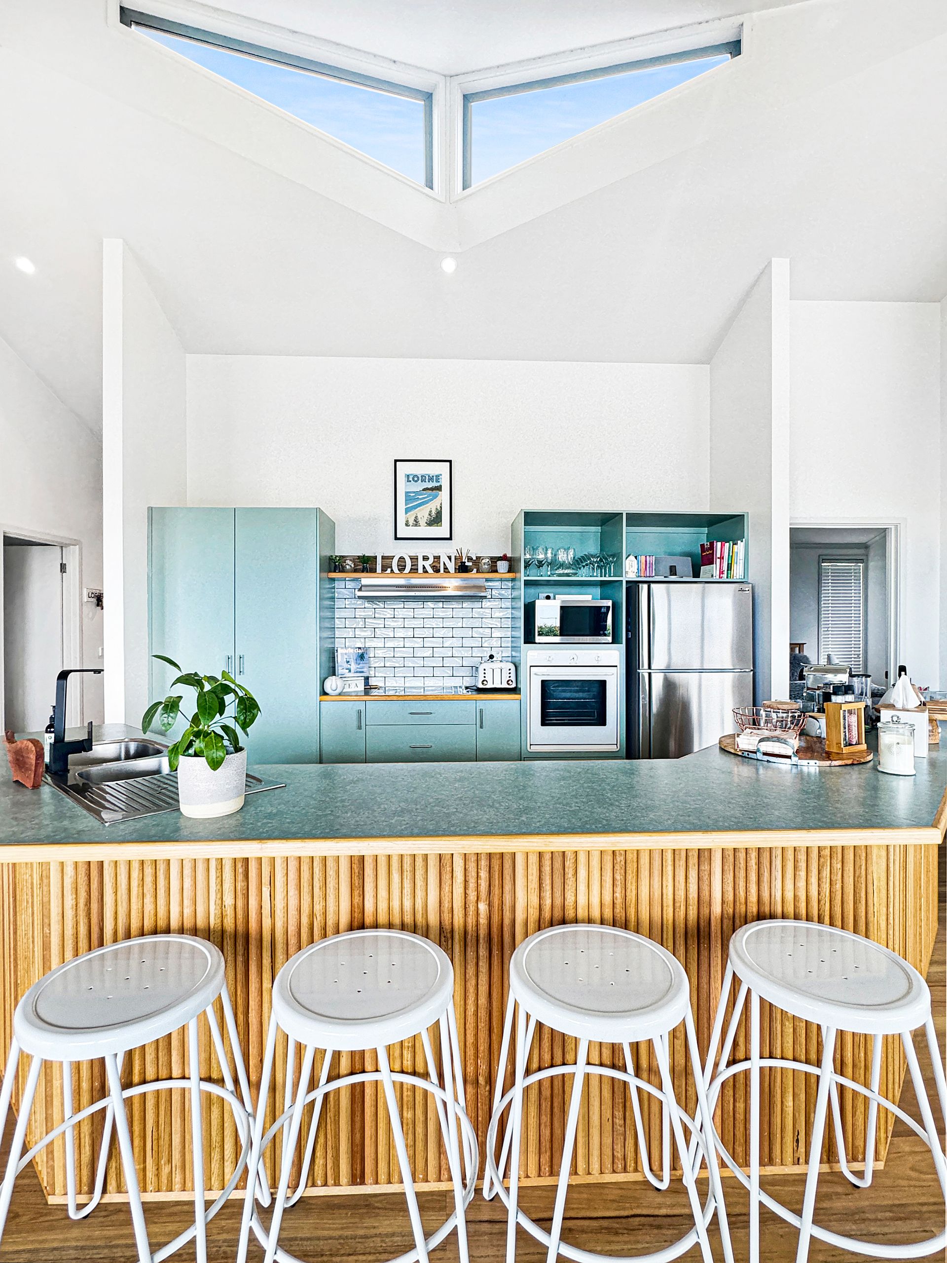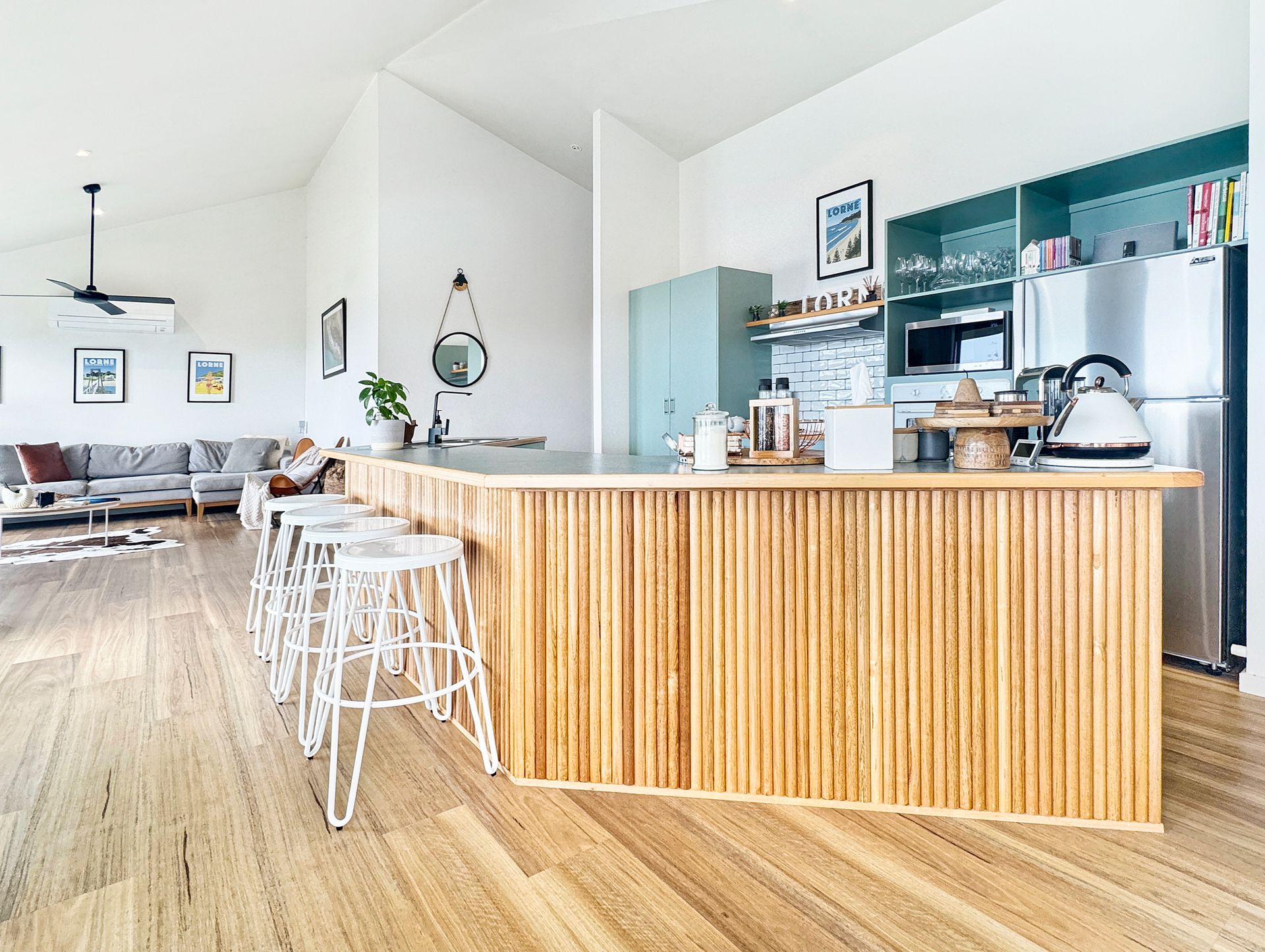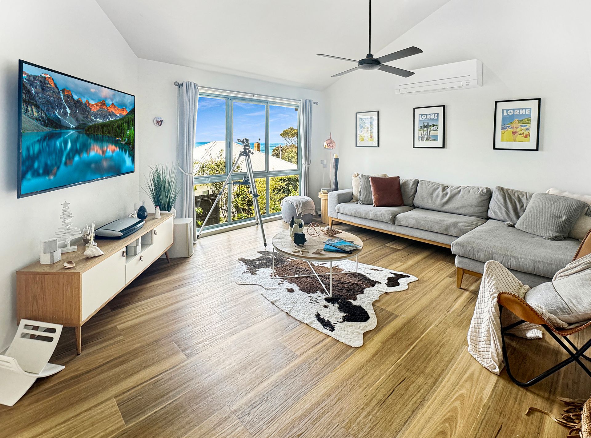 The open-plan living space flows seamlessly onto a large deck equipped with a BBQ, outdoor lounge, and TV, all while offering sweeping views from Aireys Lighthouse to the Lorne Pier. The fully equipped kitchen ensures effortless entertaining, whether you’re hosting family or friends.