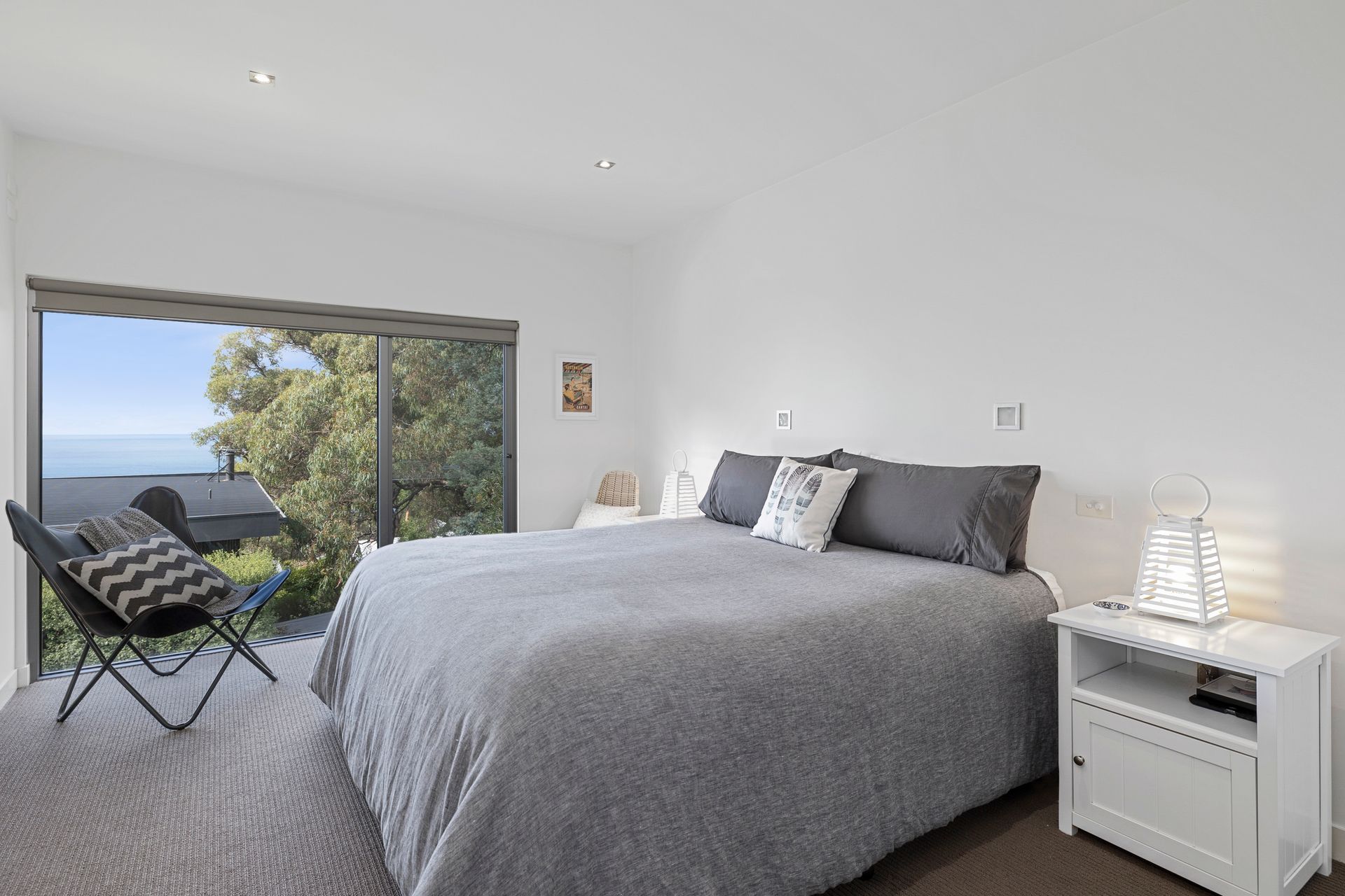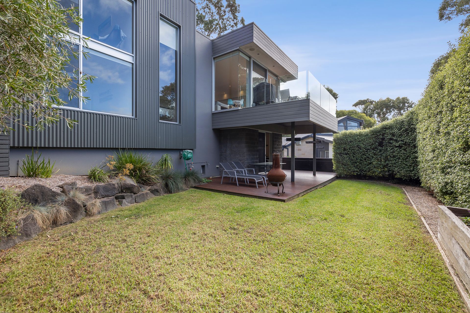 Outside has every bit as much to offer as in. Up top it’s all about sea views, long BBQ lunches and ice cold drinks in the sun. Down below offers something different again with an outdoor chimenea, day lounges, green grass and manicured landscaping.