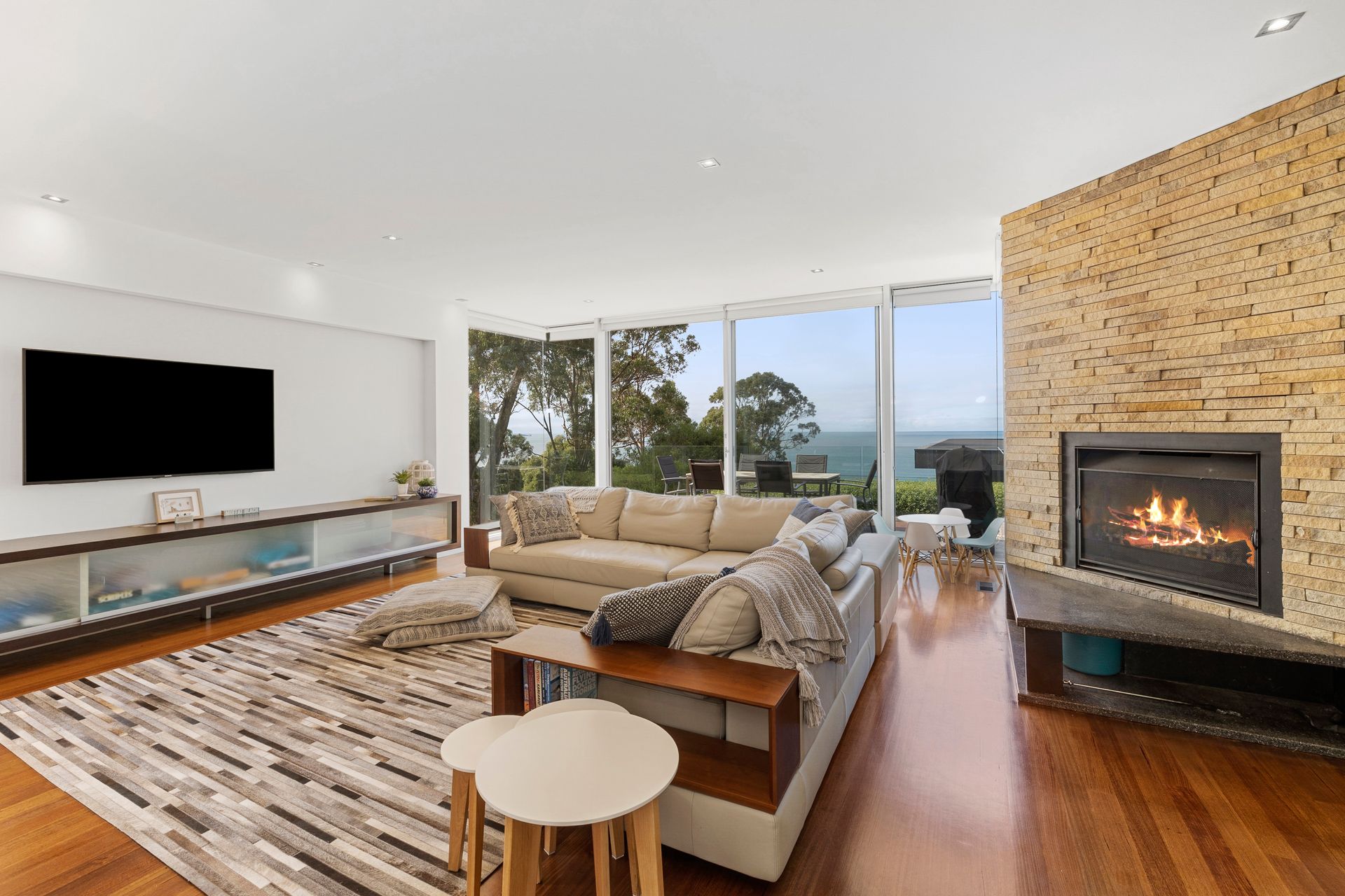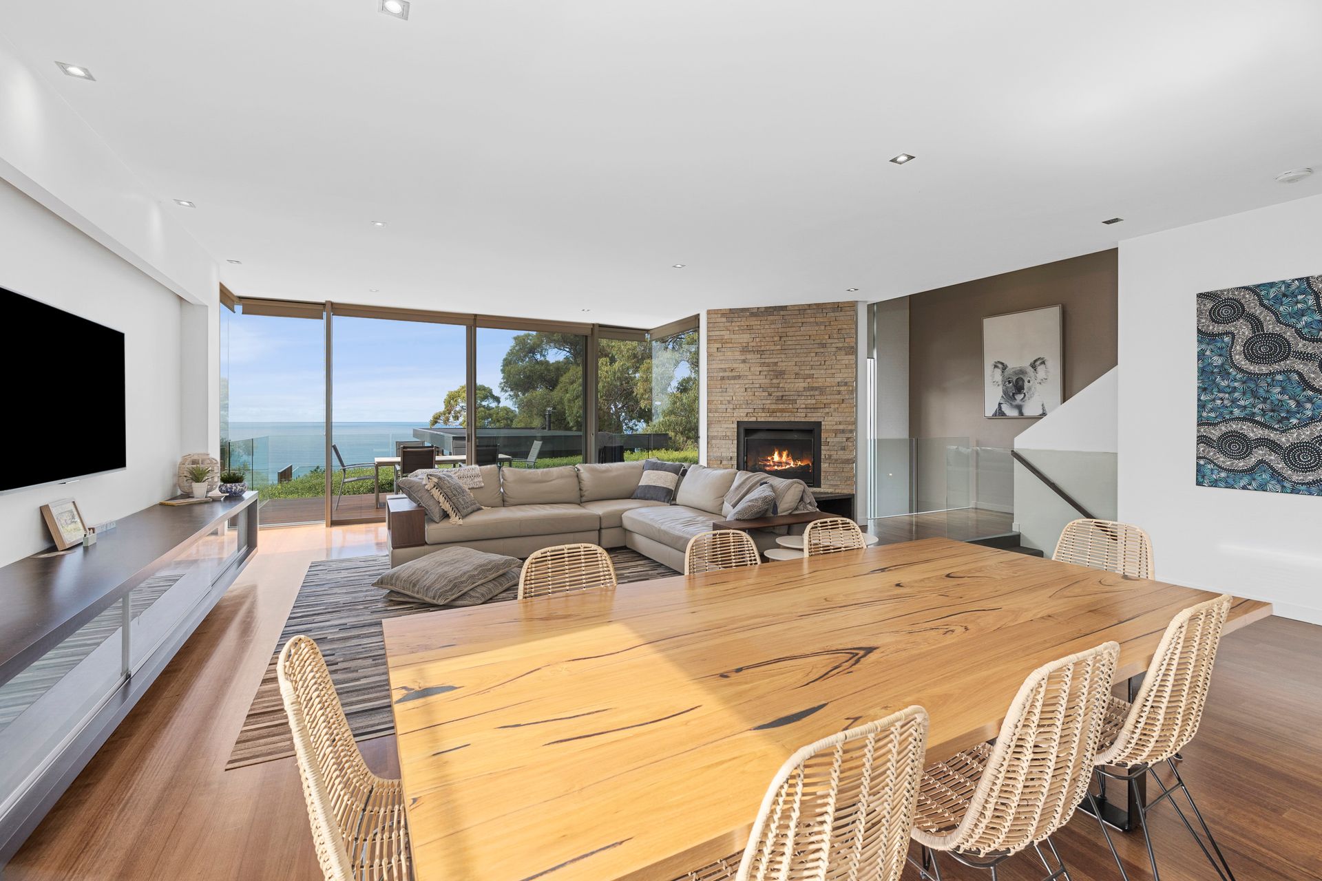 The main access from the street enters onto the mezzanine level which welcomes you with an open plan living area complete with obligatory ocean views, abundance of natural light, polished timber floors and warm open fire. Lounge, dining and kitchen comfortably accommodate family or friend gatherings.