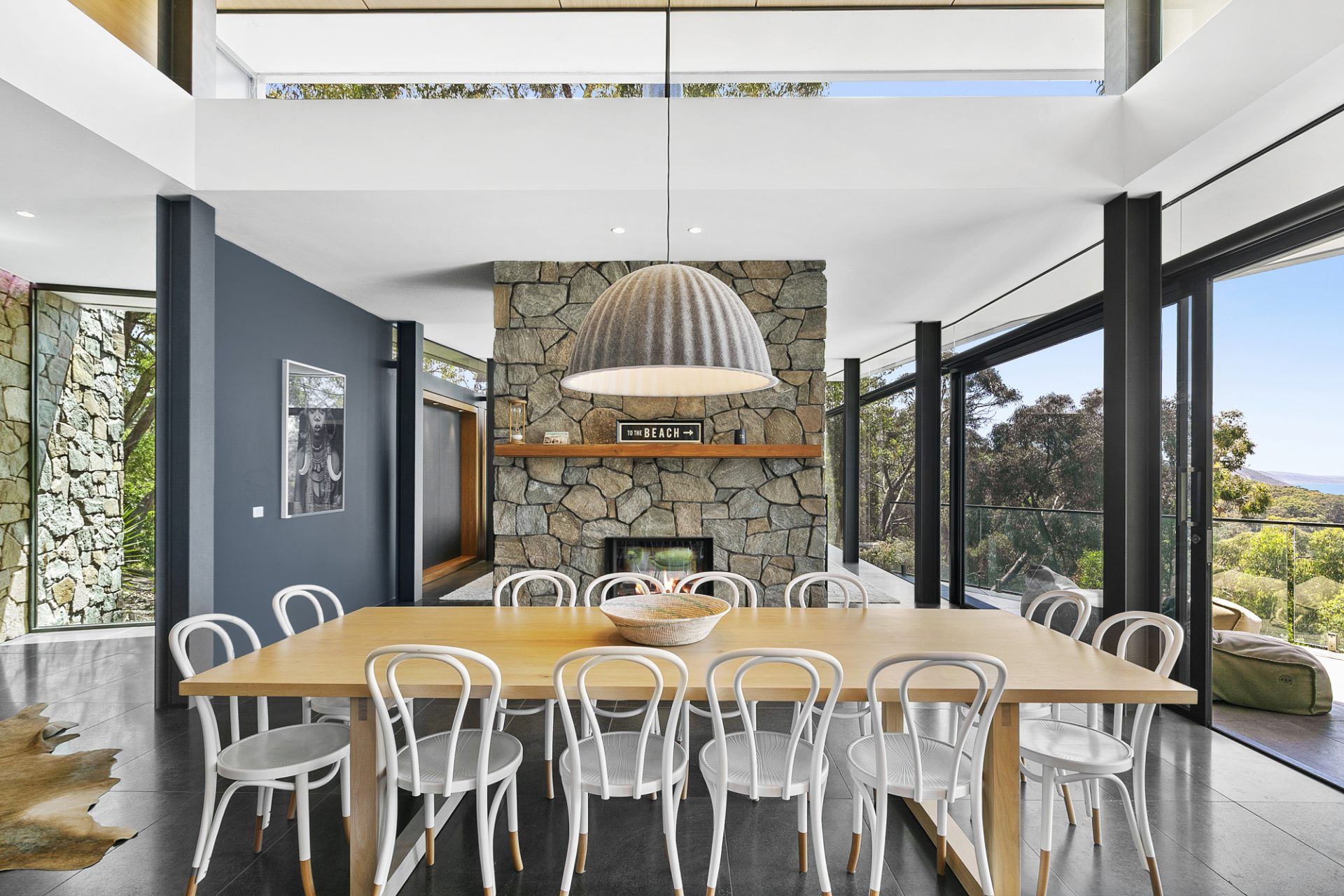 Perched high within a prestigious, covetable enclave, the home enjoys the privacy and quietness of bush surrounds. Yet it is only one minute drive or an 8 minute walk from Lornes main cafe and shopping strips. Expanses of floor to ceiling windows offer glorious views of Louttit Bay, the Erskine River estuary and the surrounding trees this is truly where the Otways meet the Southern Ocean.