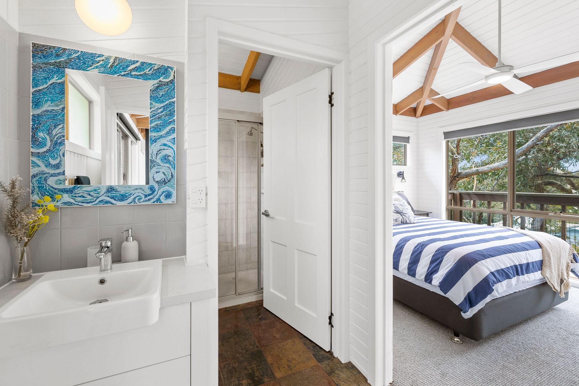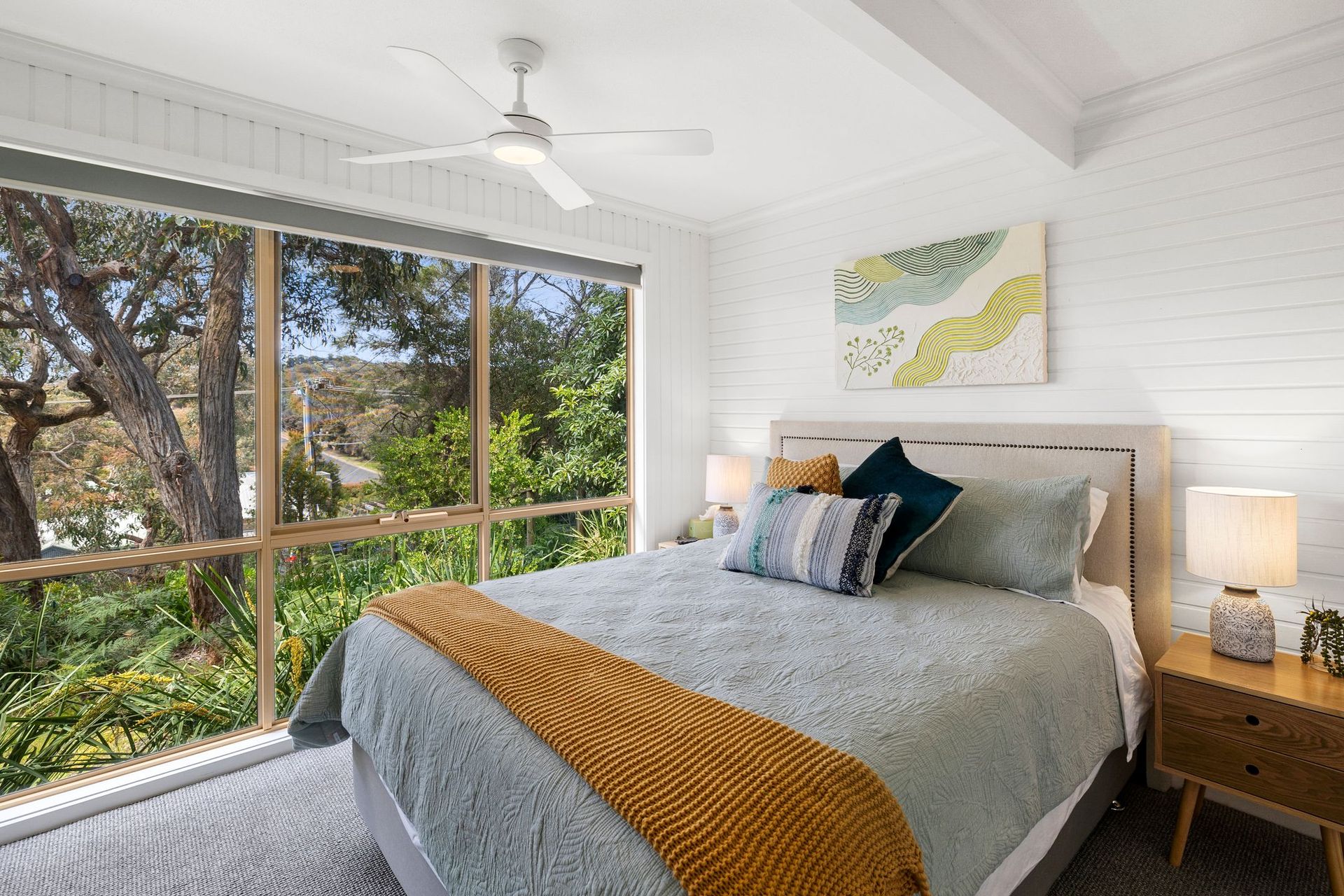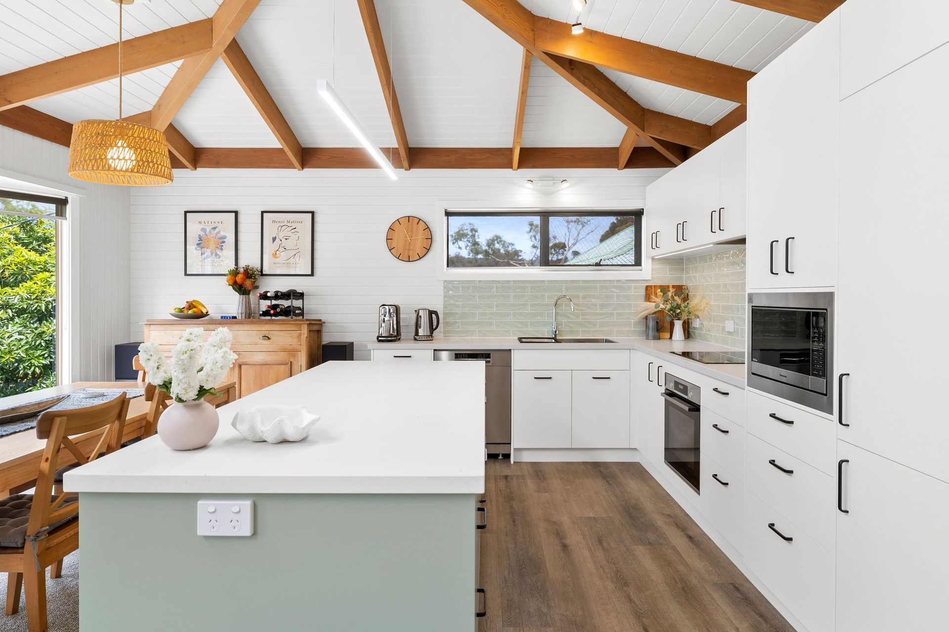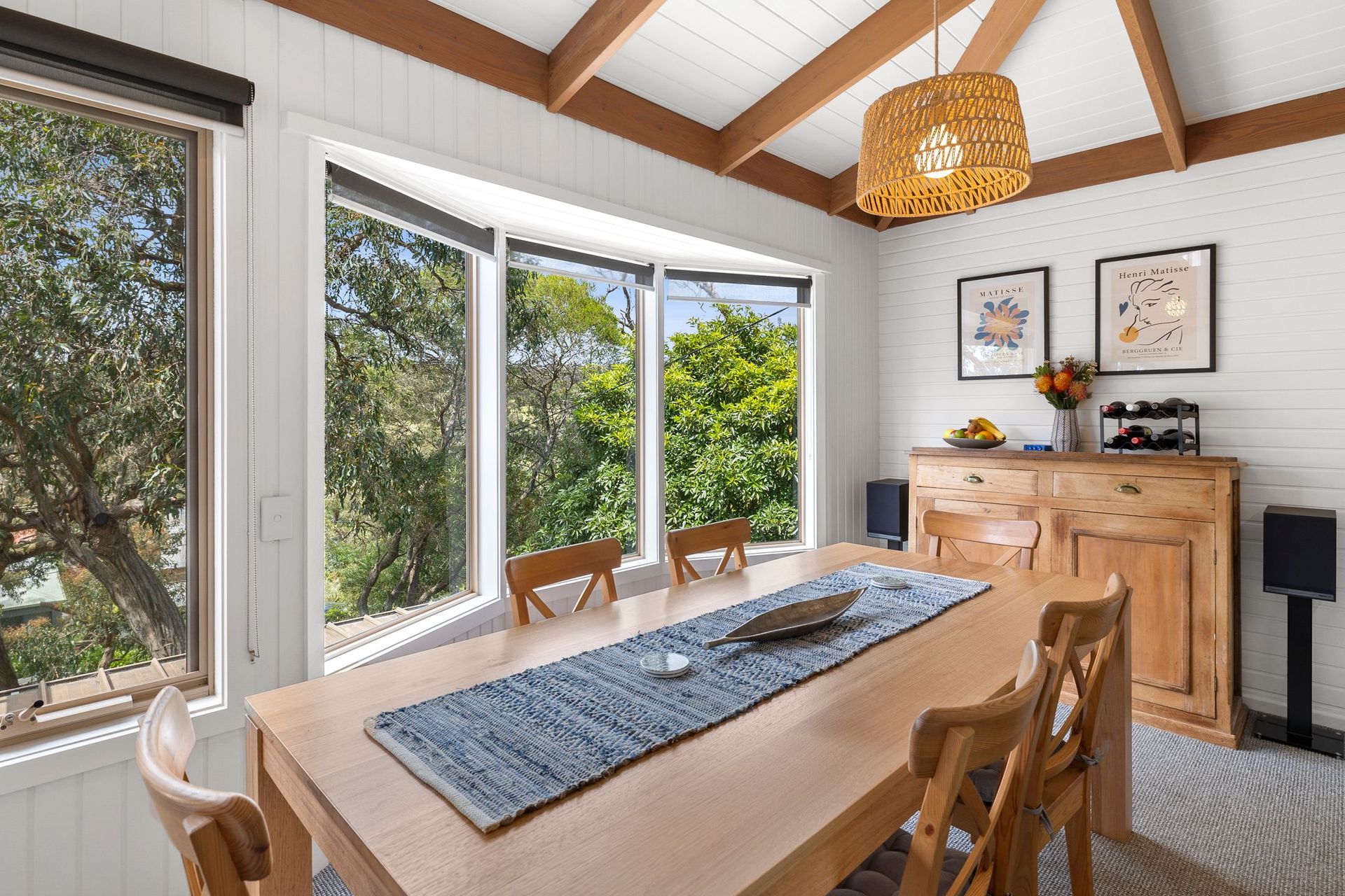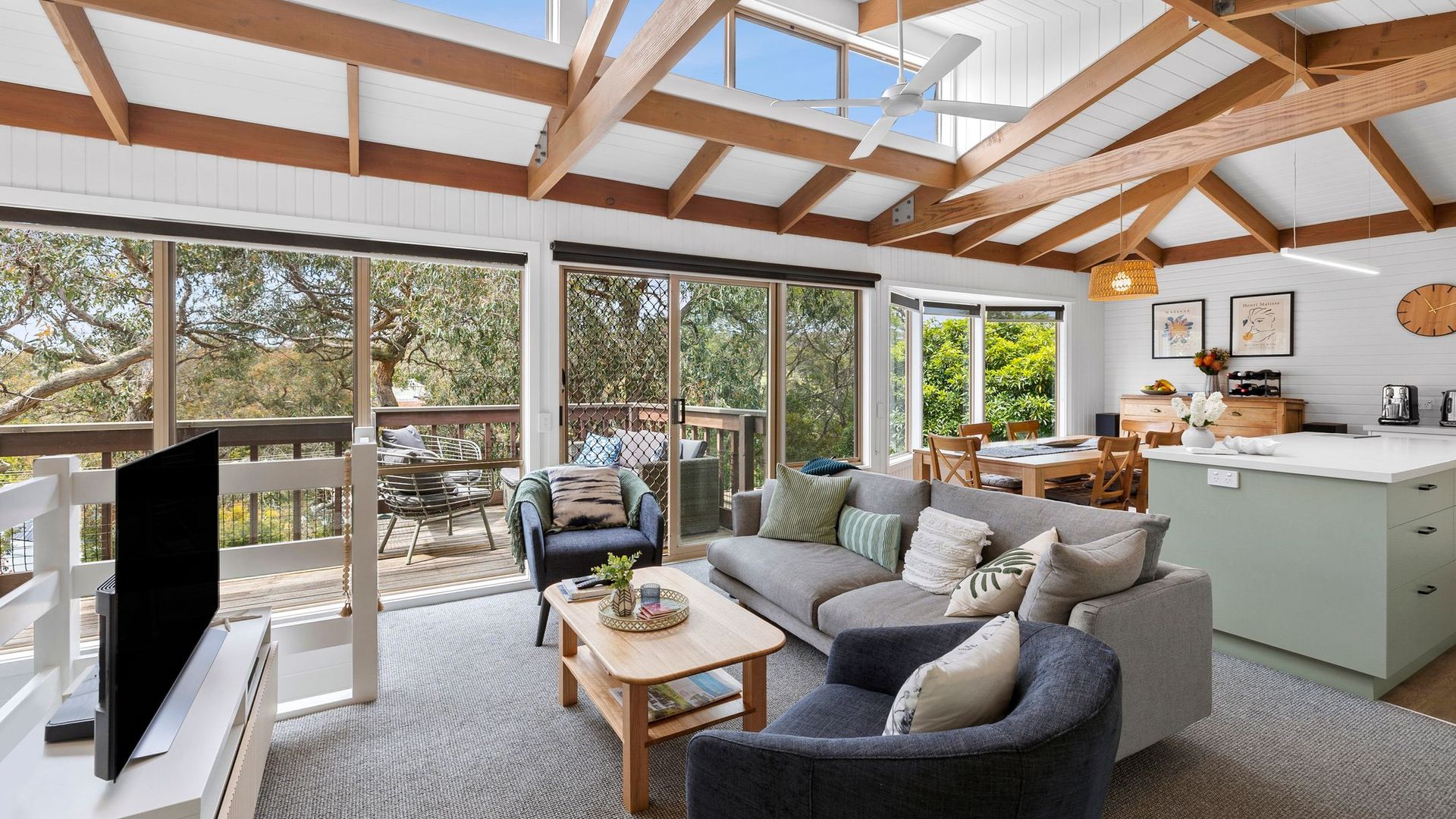Inside, you’ll see a spacious and airy living room with Wi-Fi, a flat-screen TV, a Bluetooth-enabled sound system. The house is well supplied with books and board games. Even though the place is cool with the fresh air from the surroundings and sliding doors, the living room has split-systems air-conditioning and a ceiling fan for your comfort.