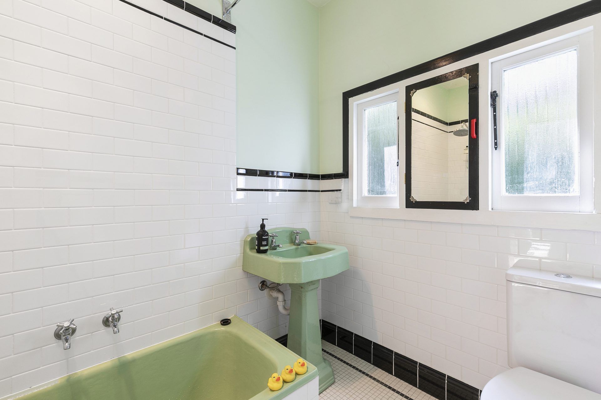 The art deco bathroom is perfect for a long soak in the tub.