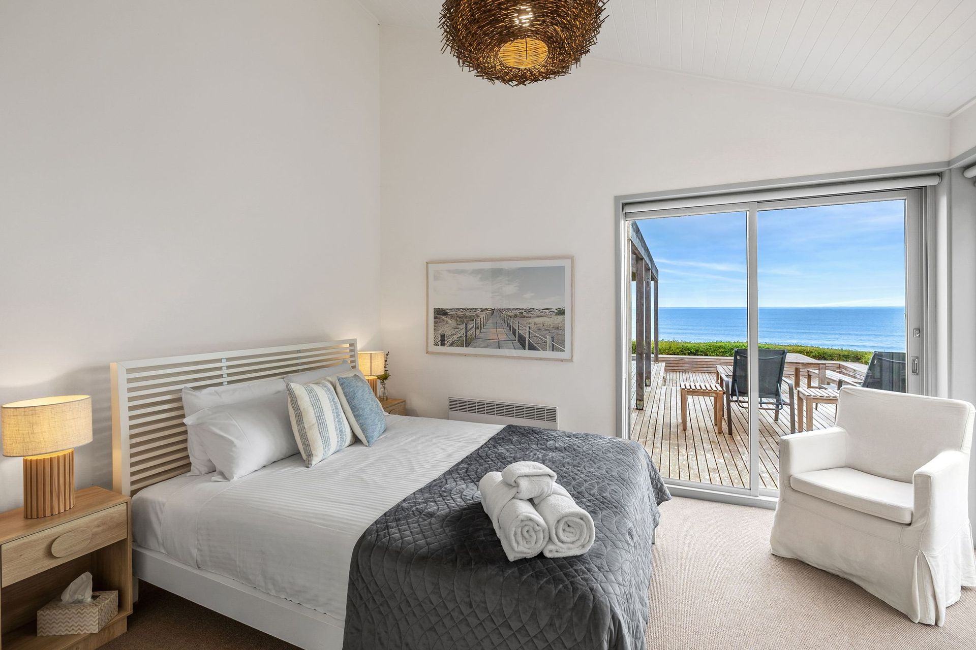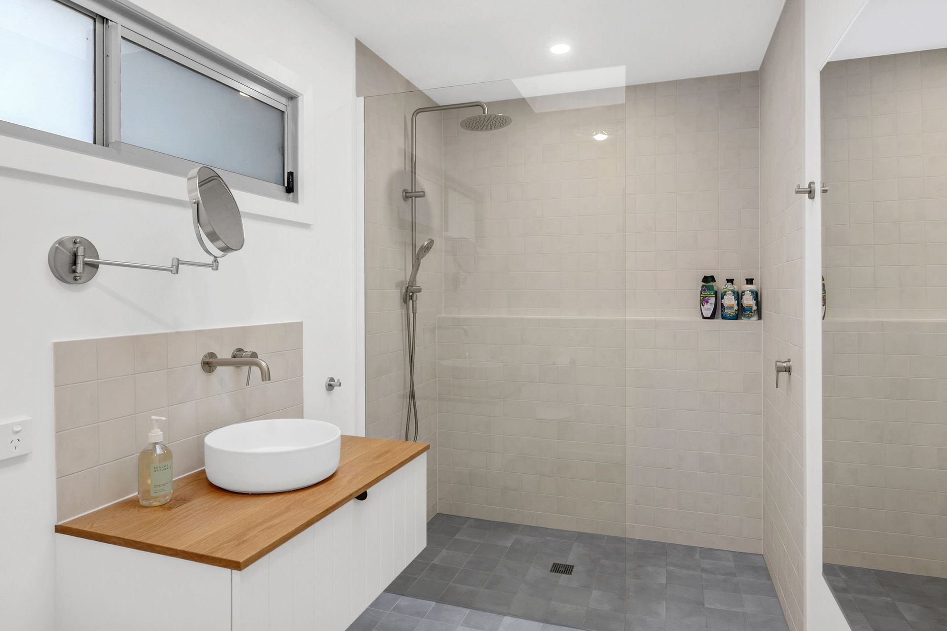 Master bedroom with Queen size bed. En-suite with corner spa and ocean views! Second bedroom also with Queen size bed and ensuite with double shower. Third bedroom has 2x King single bunks. Main bathroom with shower, wc and vanity.