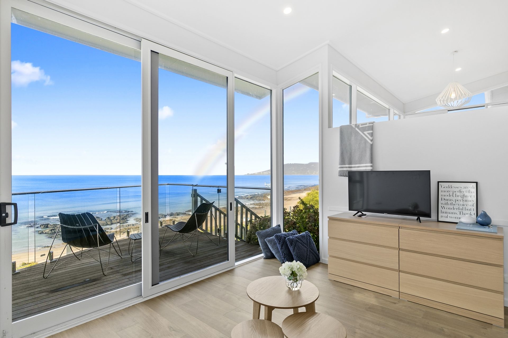 Easily accessible, this single level property consists of a large open plan kitchen/living/dining zone, separate study/reading retreat, master bedroom with ensuite - all areas are flooded with vast walls of glass capturing all those 180 degree water views and the majestic outlook of the Lorne shore line and the iconic Lorne Pier.
