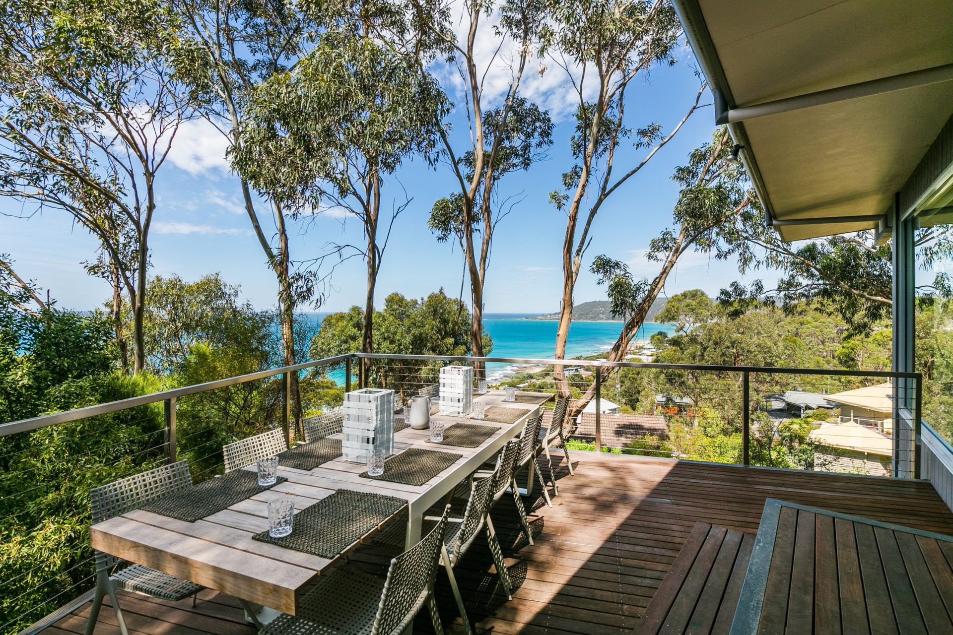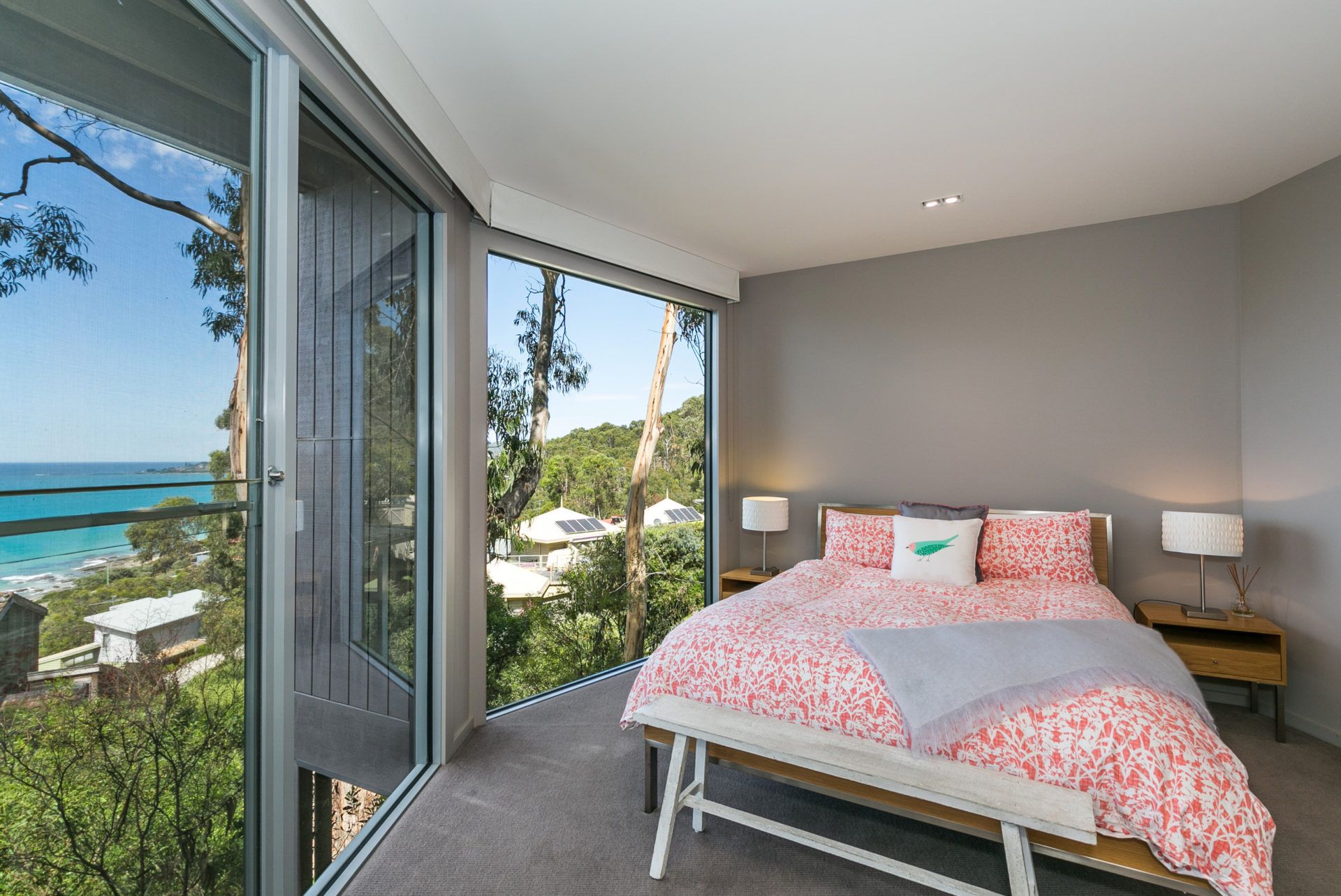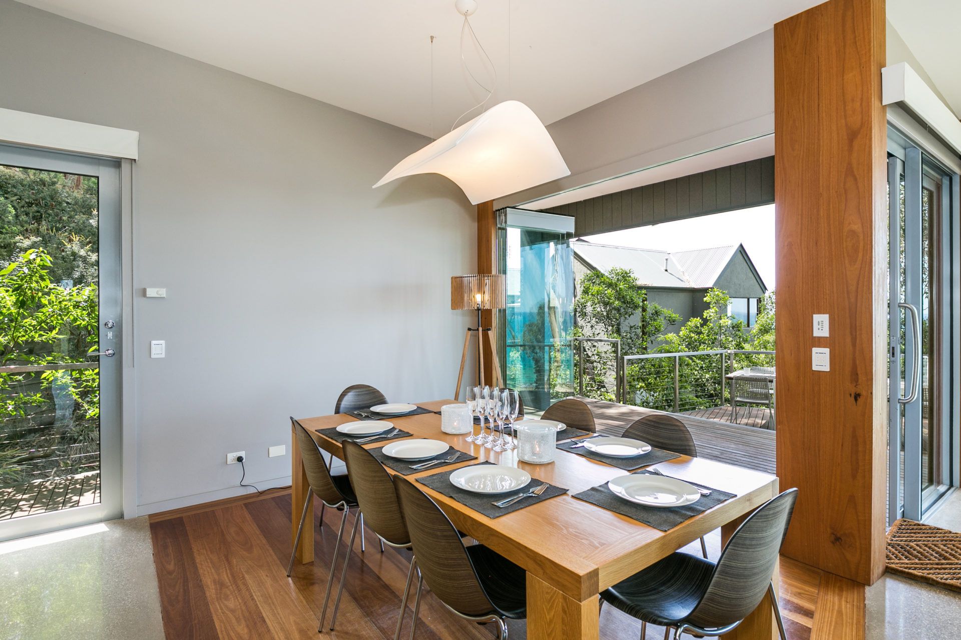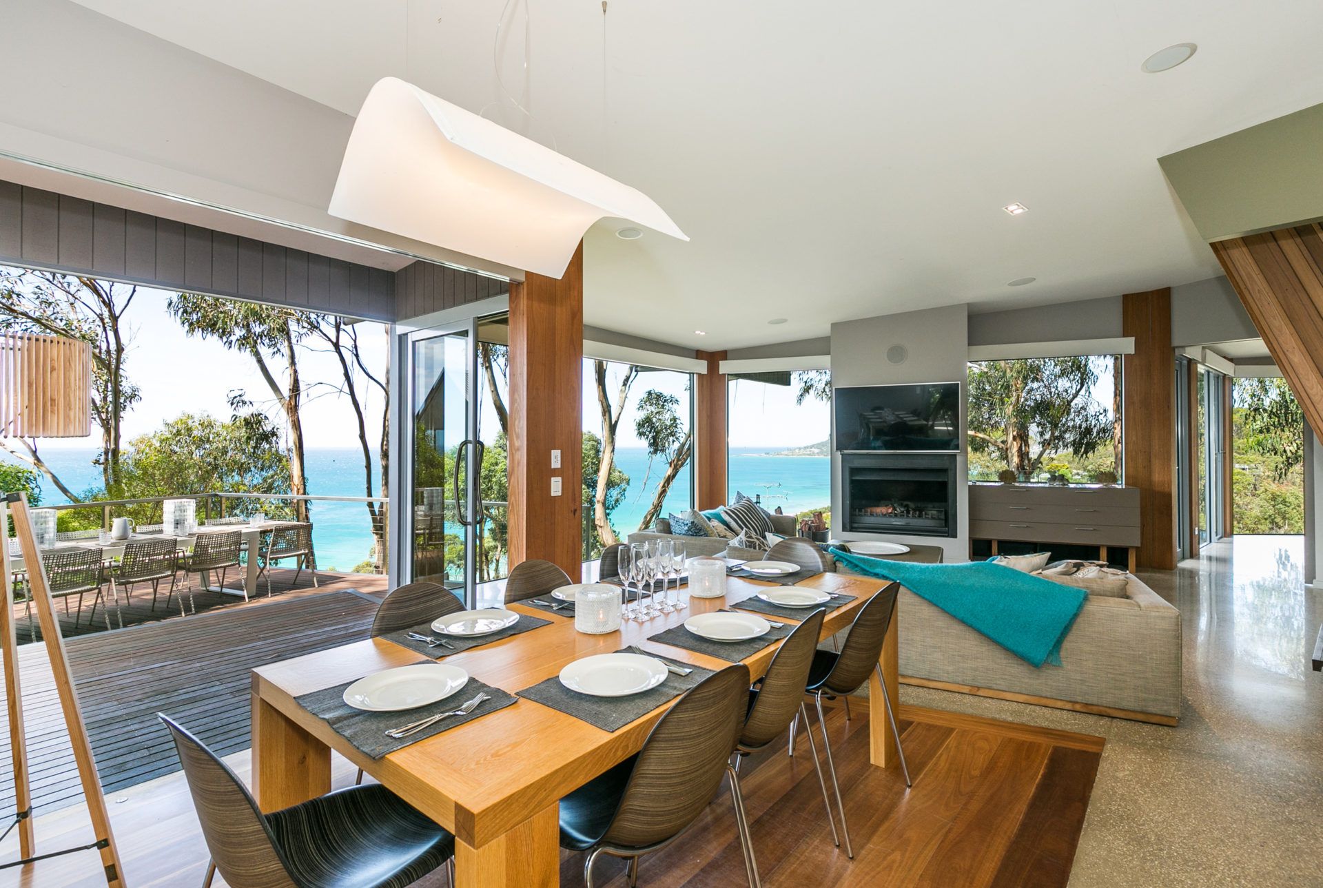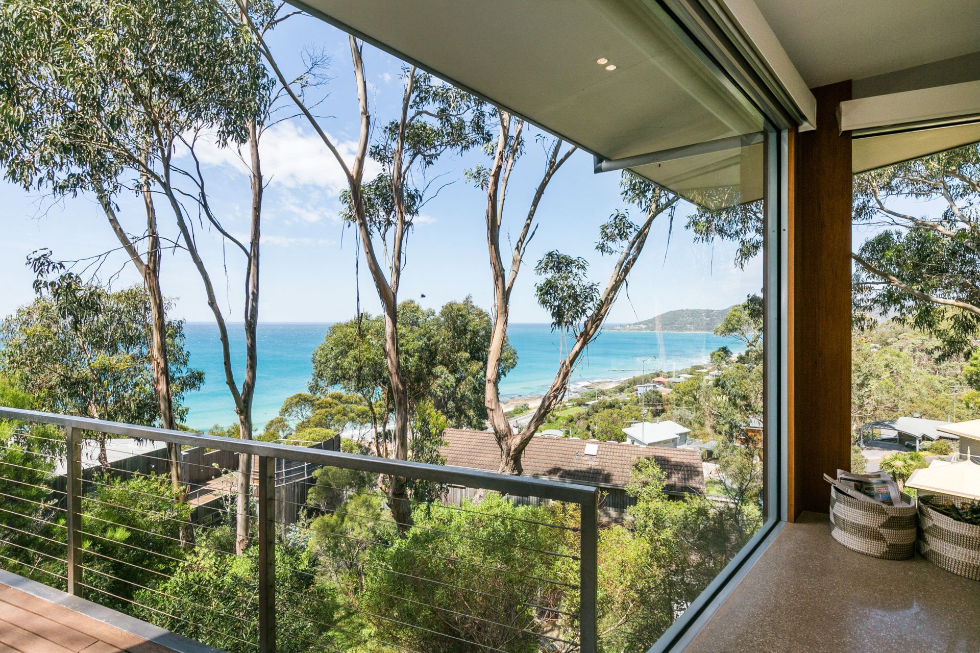 A high-end architecturally designed home in the quieter part of Lorne, within walking distance of the beach. Perfectly suited for couples, the whole family or large groups (sleeps up to 10), this coastal property maximizes the awe-inspiring ocean views from each room, whilst maintaining its privacy in a bush setting. Featuring high-end facilities and luxurious interiors designed to blend with and complement the natural surrounds, you will not be disappointed with this architectural masterpiece.