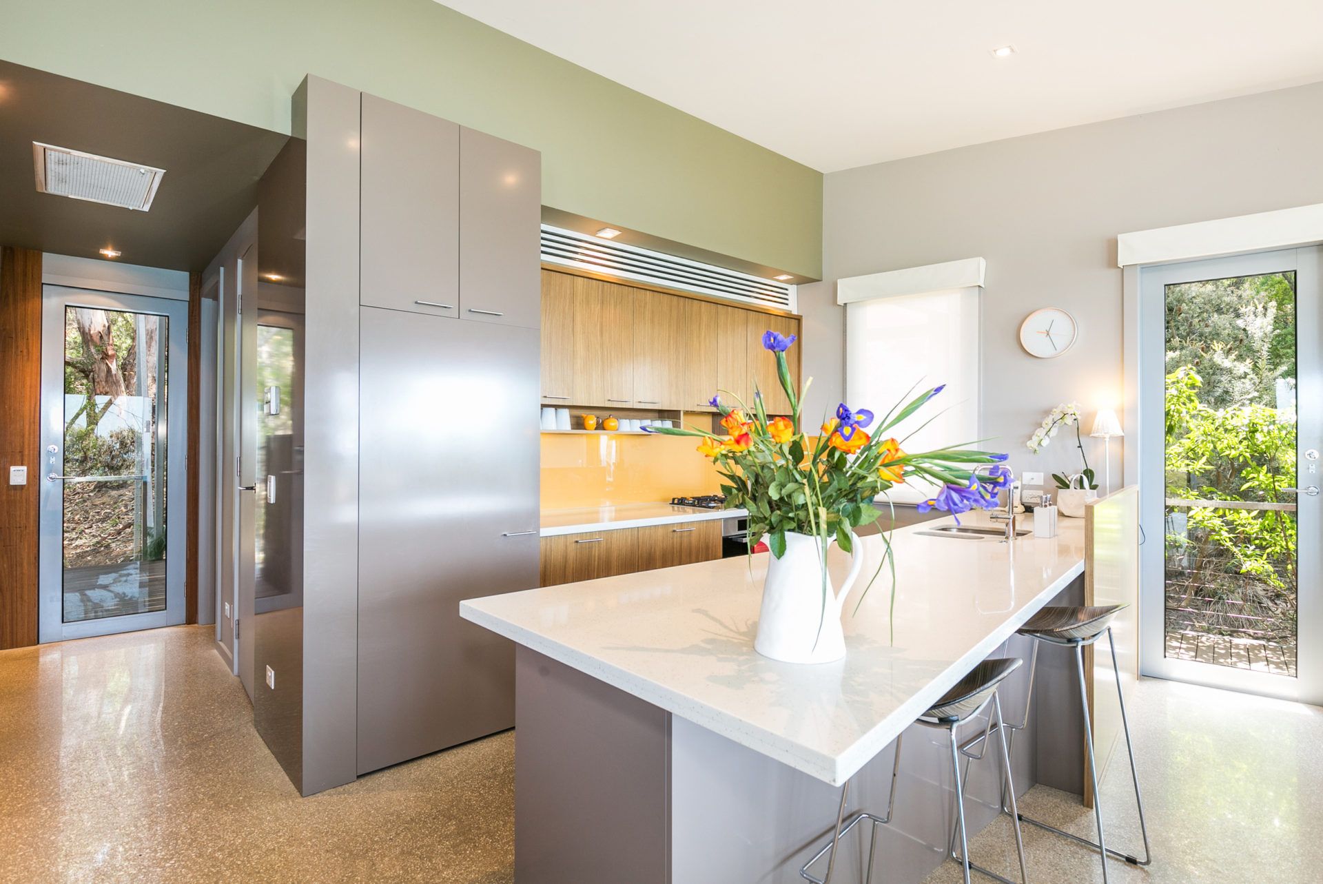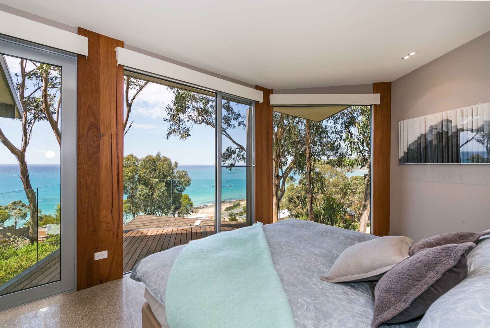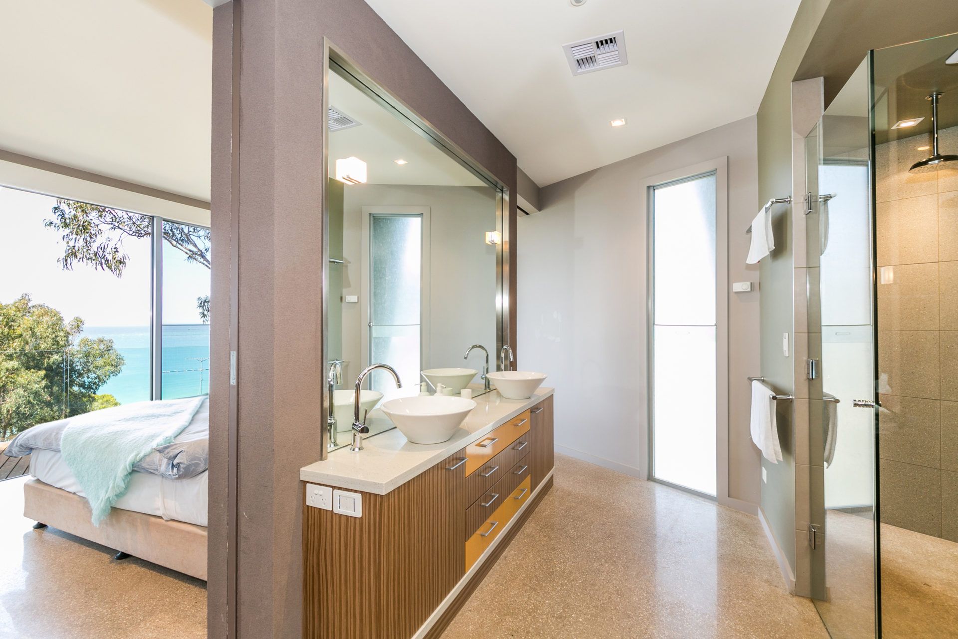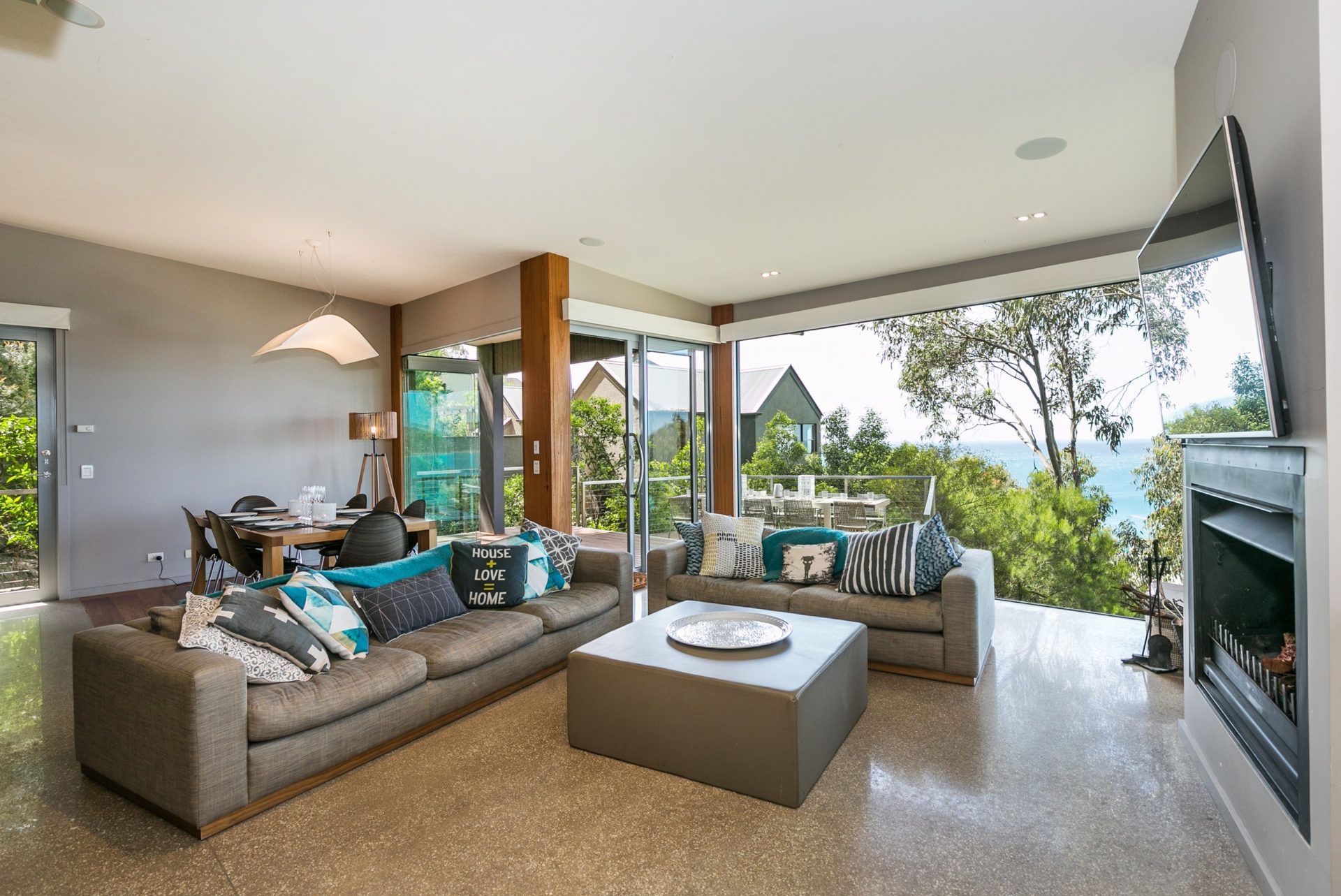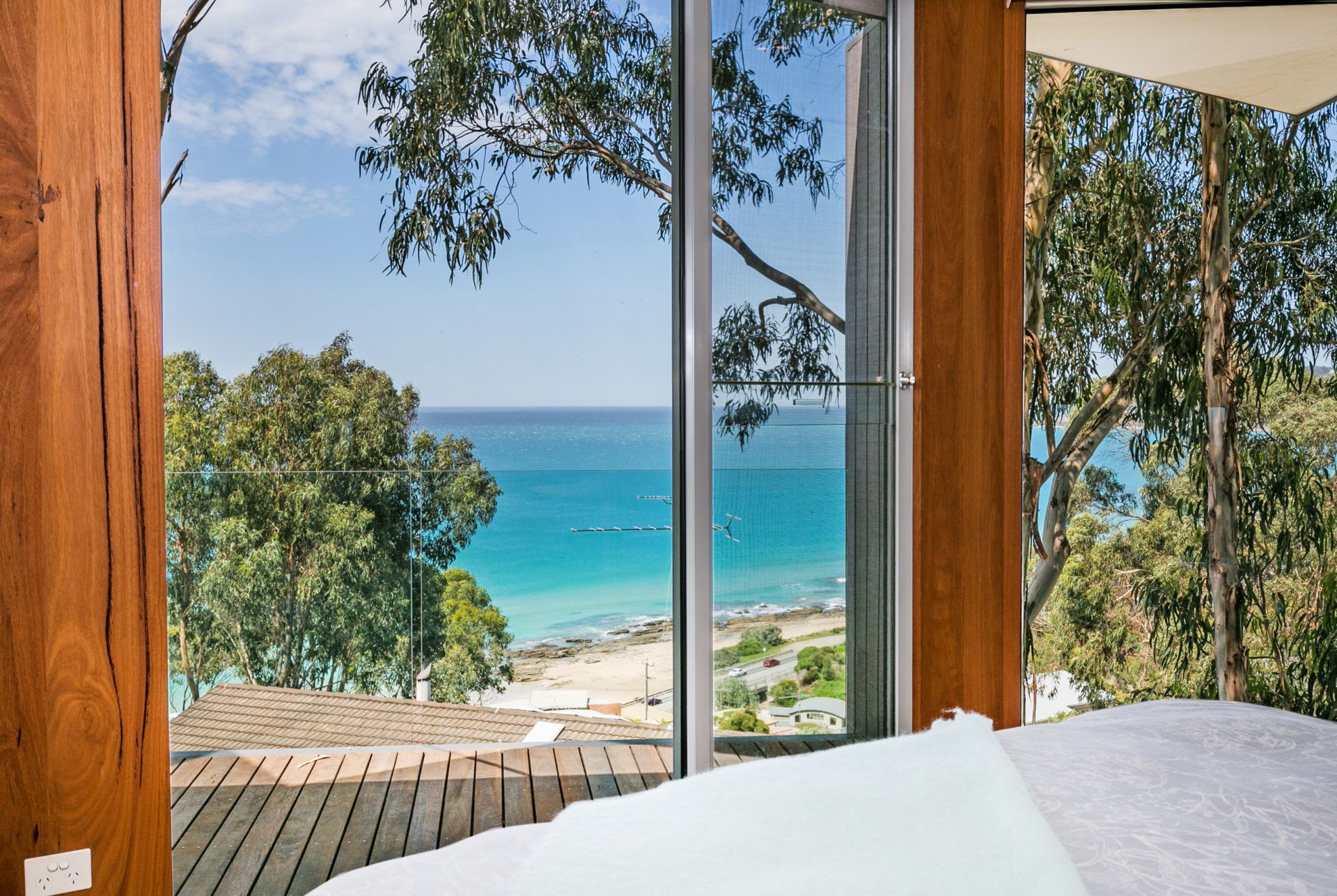 A high-end architecturally designed home in the quieter part of Lorne, within walking distance of the beach. Perfectly suited for couples, the whole family or large groups (sleeps up to 10), this coastal property maximizes the awe-inspiring ocean views from each room, whilst maintaining its privacy in a bush setting. Featuring high-end facilities and luxurious interiors designed to blend with and complement the natural surrounds, you will not be disappointed with this architectural masterpiece.