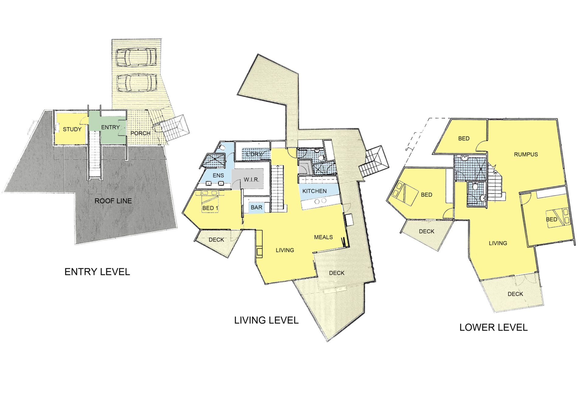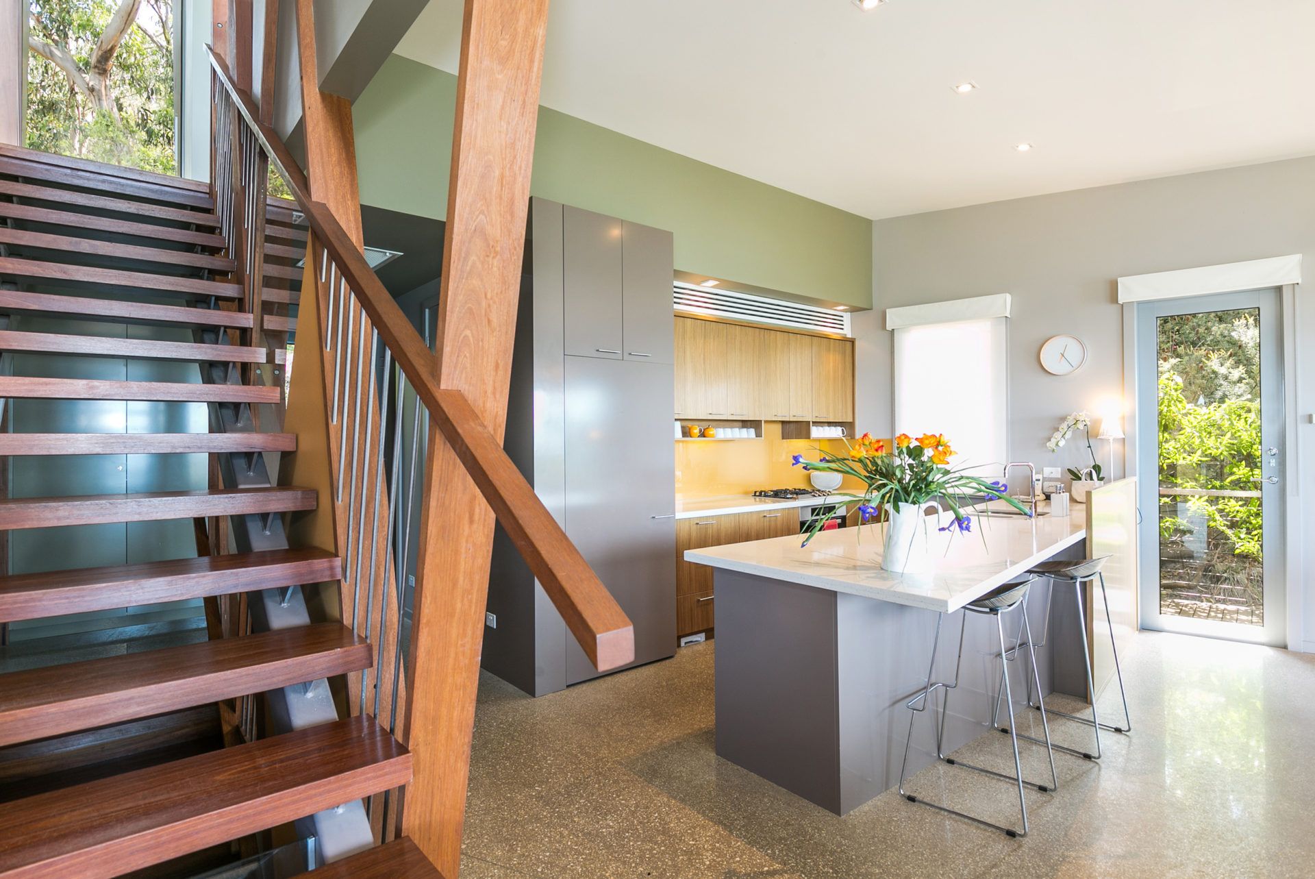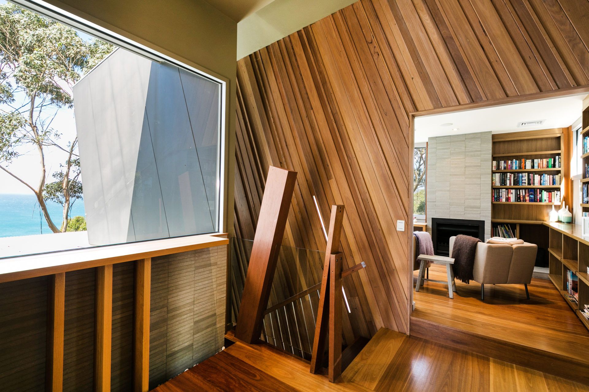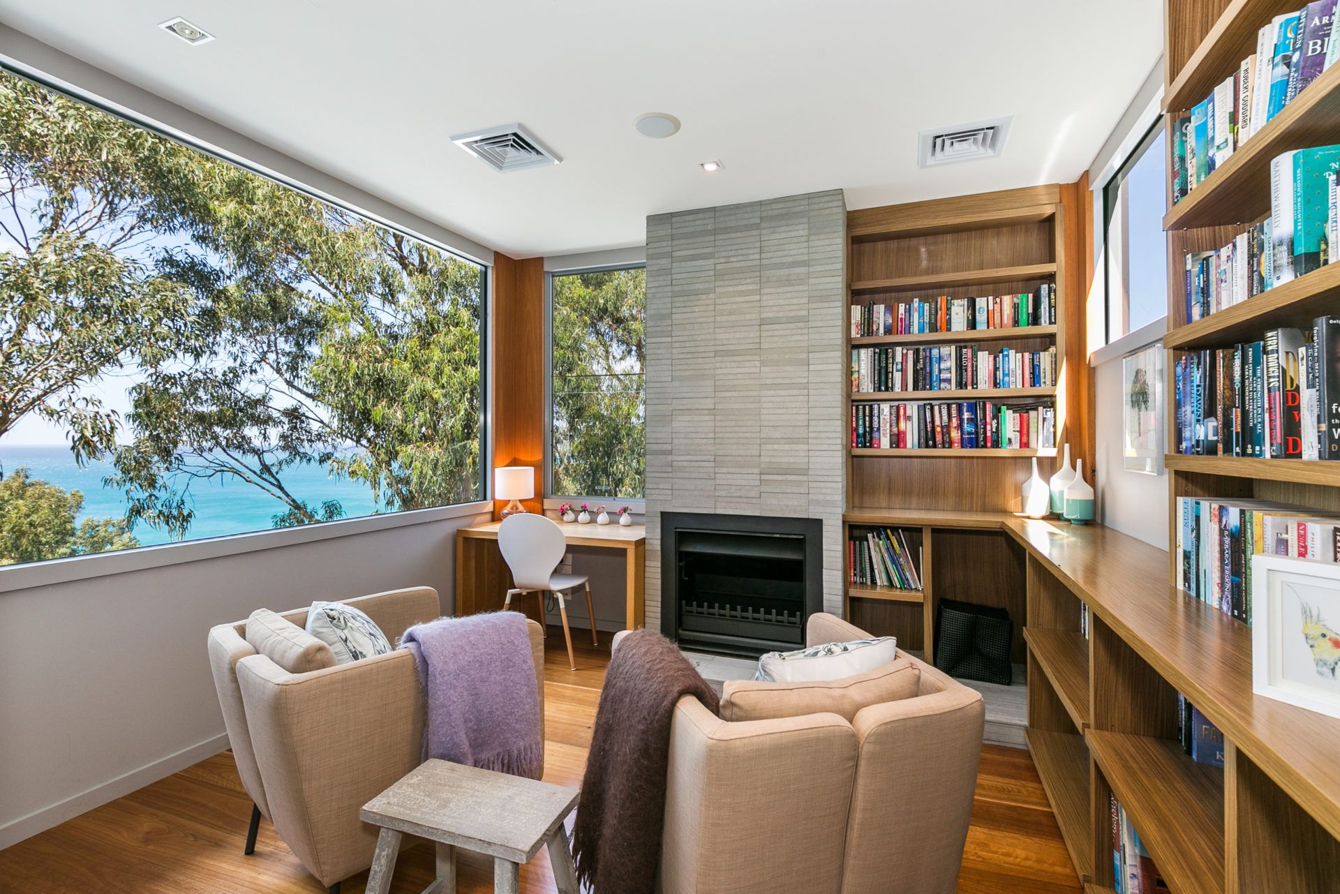 On entering the top level you pass through the entrance hall enveloped with ocean views and the surrounding gum trees, and are greeted by the inviting library/study complete with an open fireplace and further ocean views, offering a secluded and quiet getaway to read and relax.