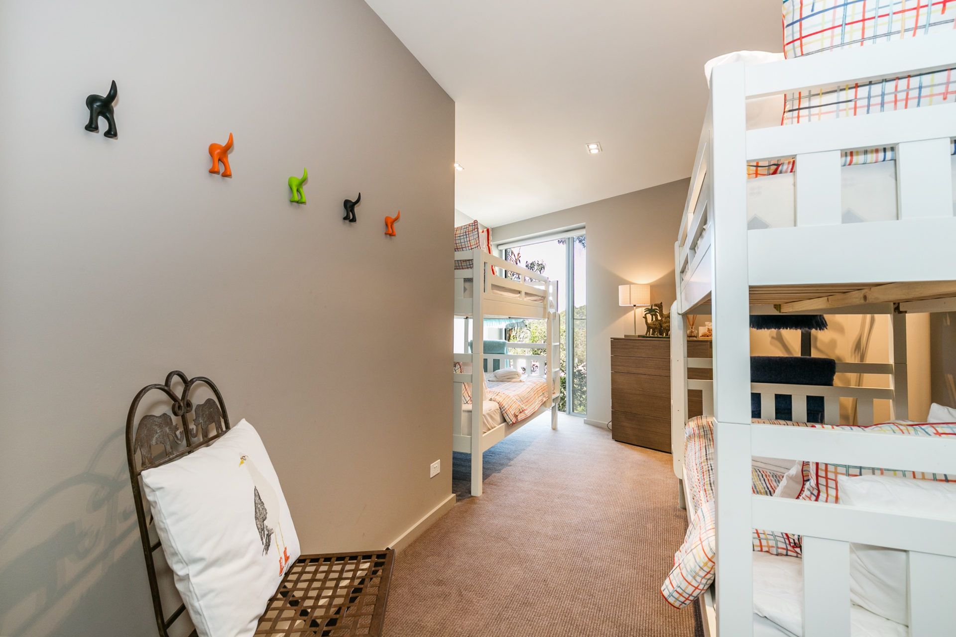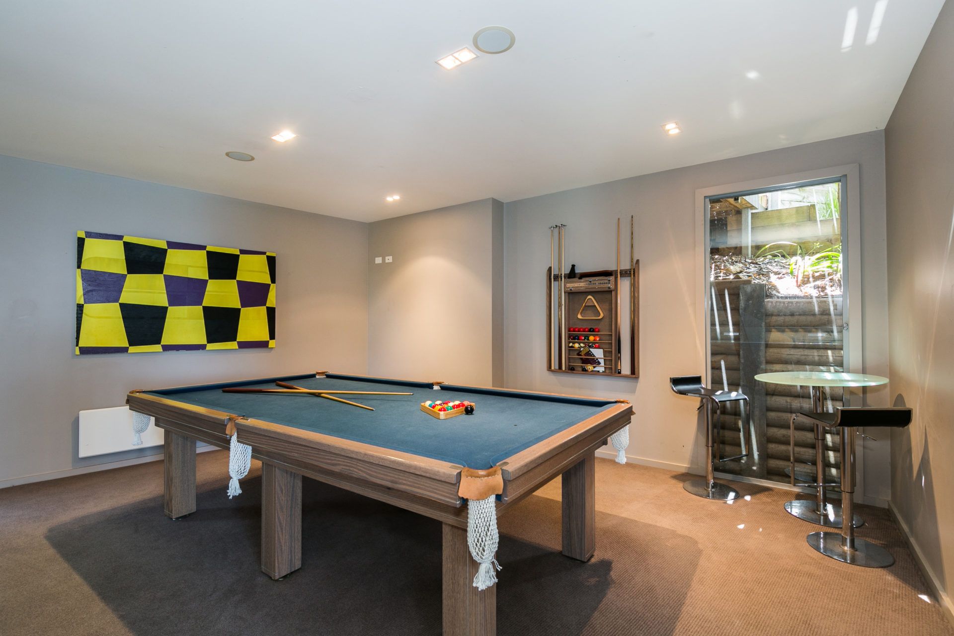 Now down to the lower level where there are two further bedrooms with large queen size beds, built in robes and a third bedroom with 2 king size bunks beds allowing 4 adults to sleep in comfort. A bathroom and separate powder room is also on this level. Here you will also find a large living area complete with its own couches, smart TV/blue ray, with access to a private balcony and further ocean and bush views, and a separate billiard room. The entire lower level can be closed off for added privacy.
